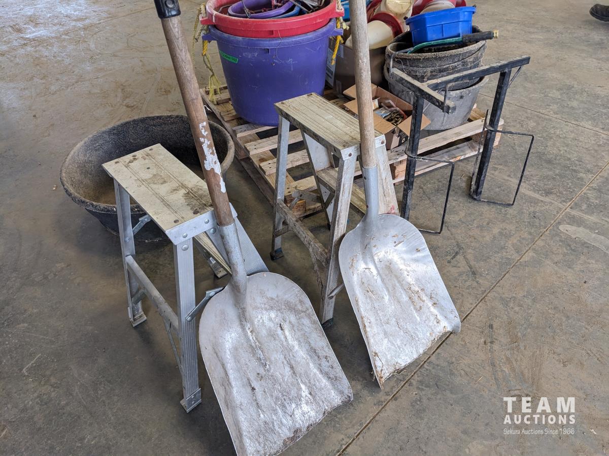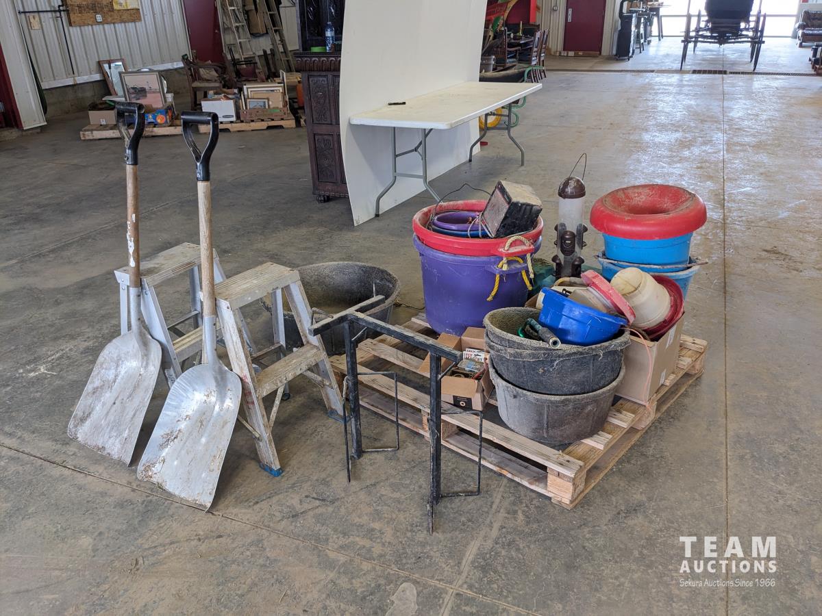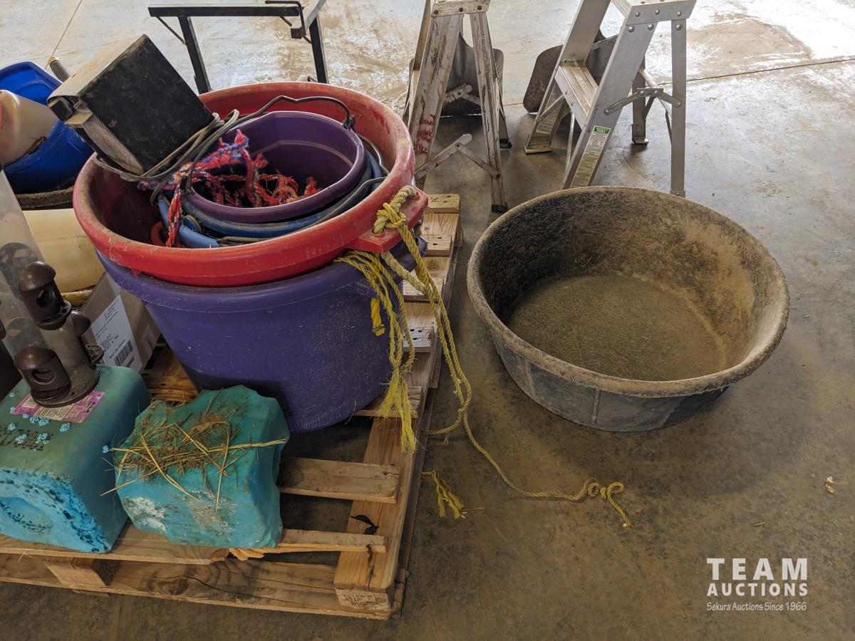 Feed buckets, water buckets, (2) salt blocks, (2) shovels, saddle stand, bird feeder, (2) two step aluminum ladders