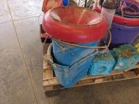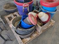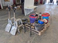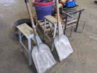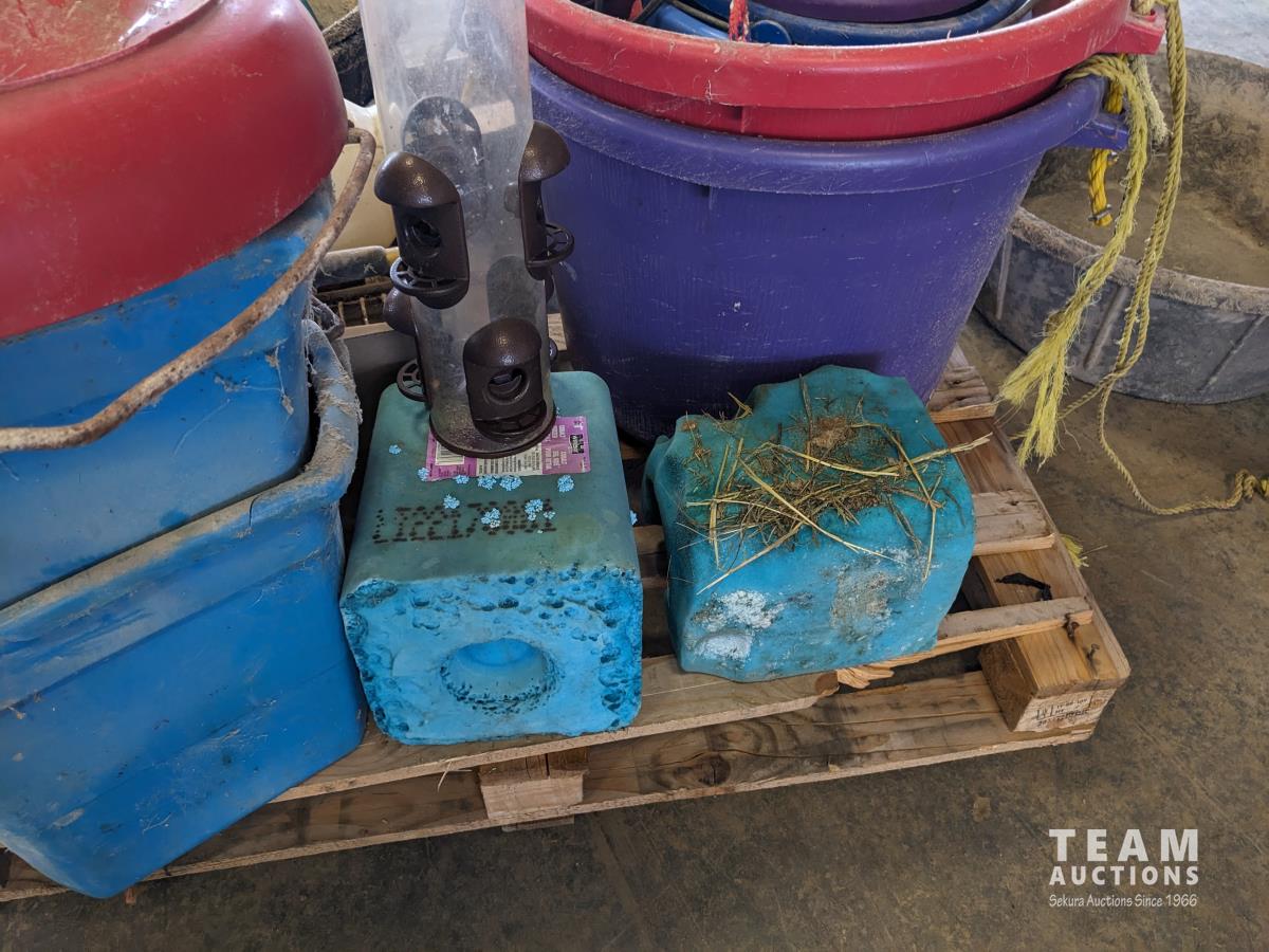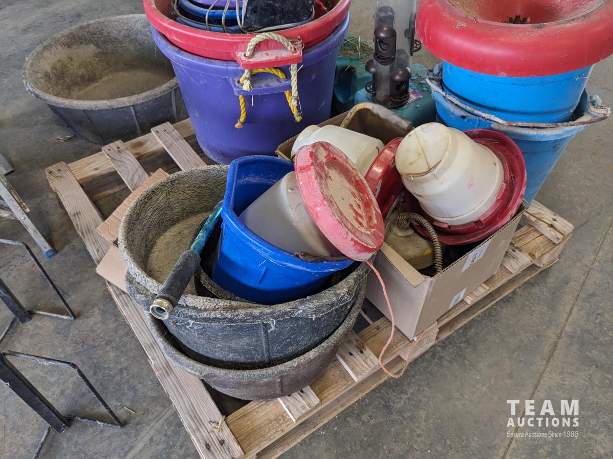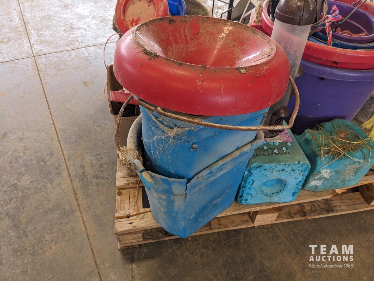Feed buckets, water buckets, (2) salt blocks, (2) shovels, saddle stand, bird feeder, (2) two step aluminum ladders