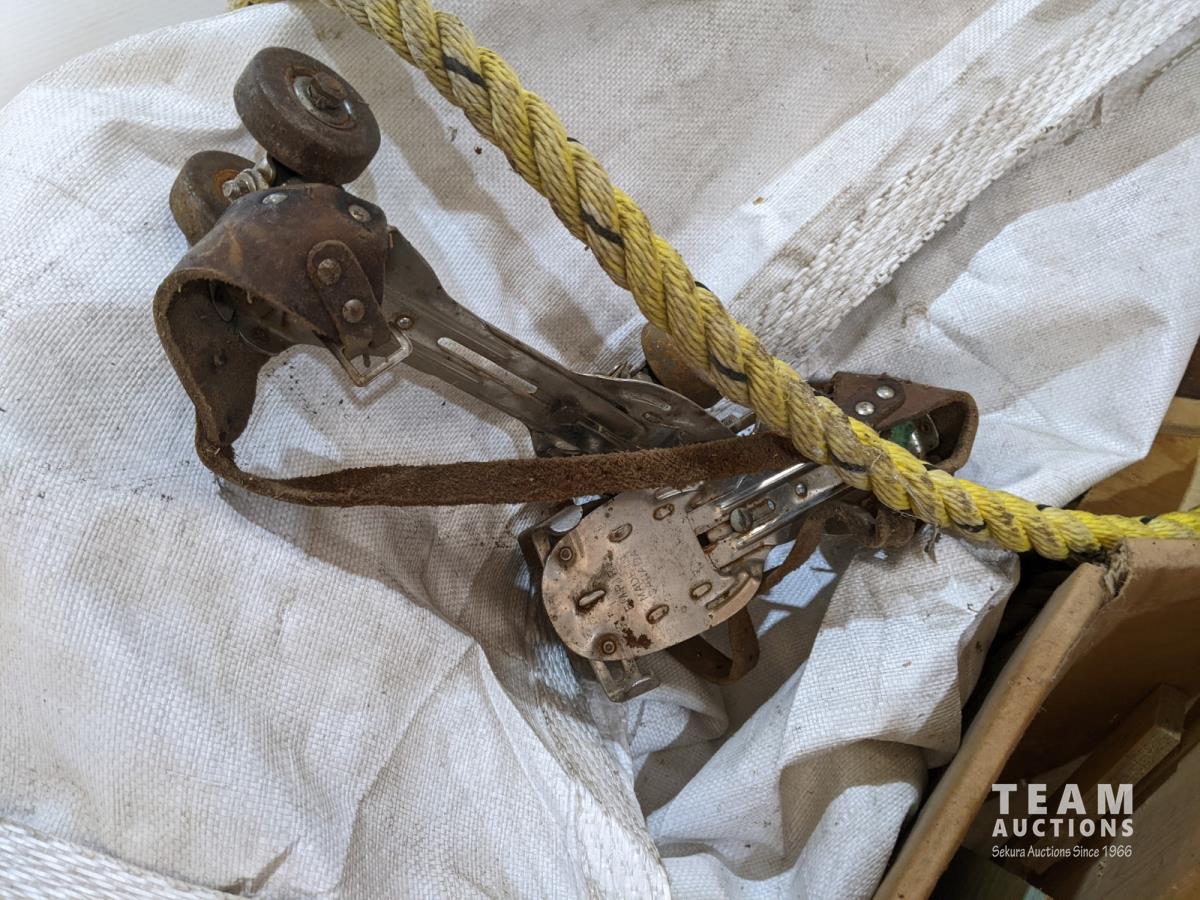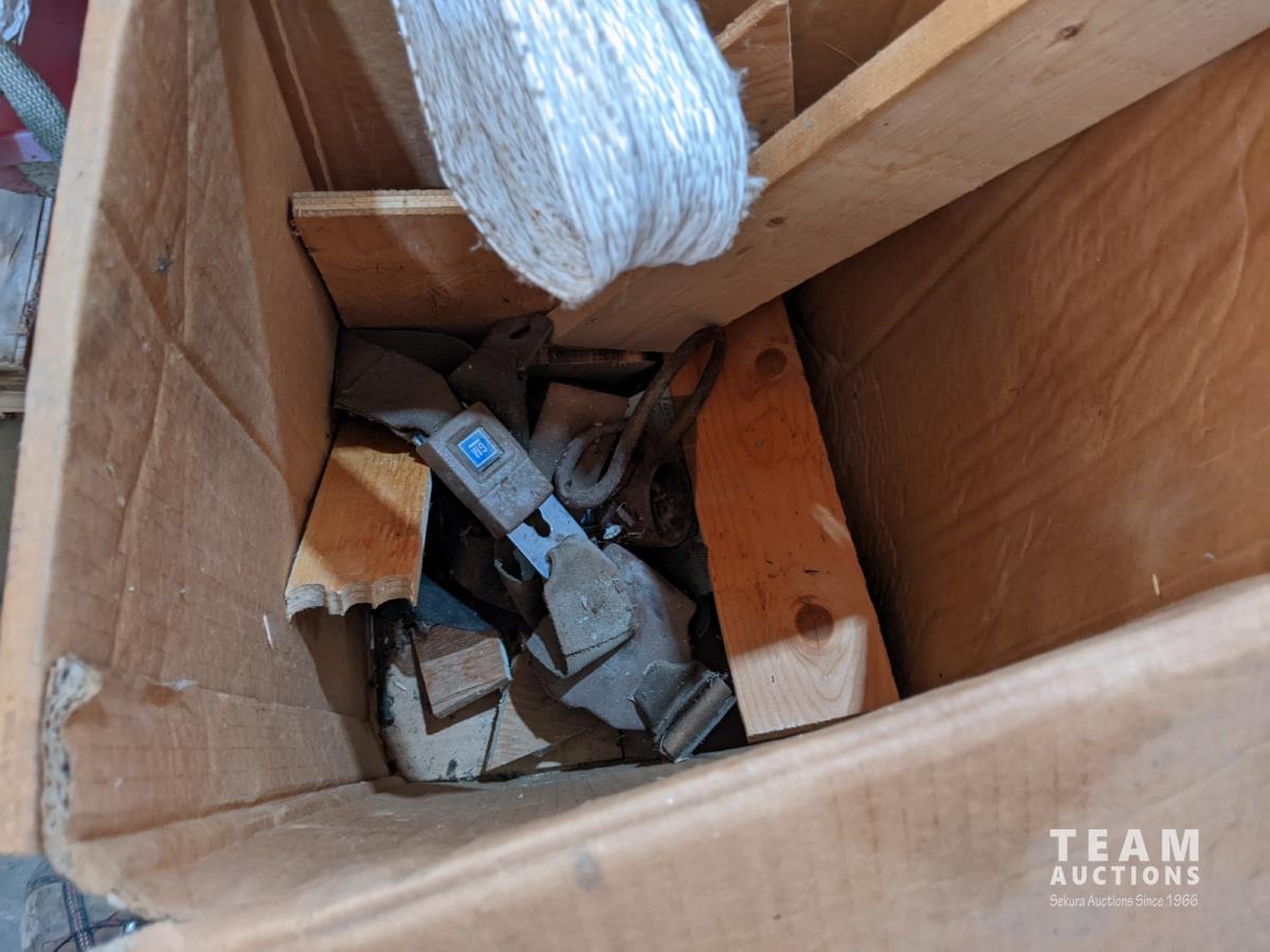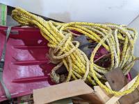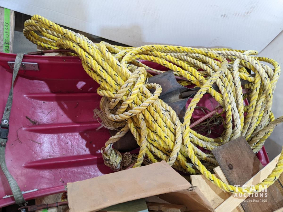 Poly sleigh, large tote, shovel head, rope, wood scraps, antique roller skates