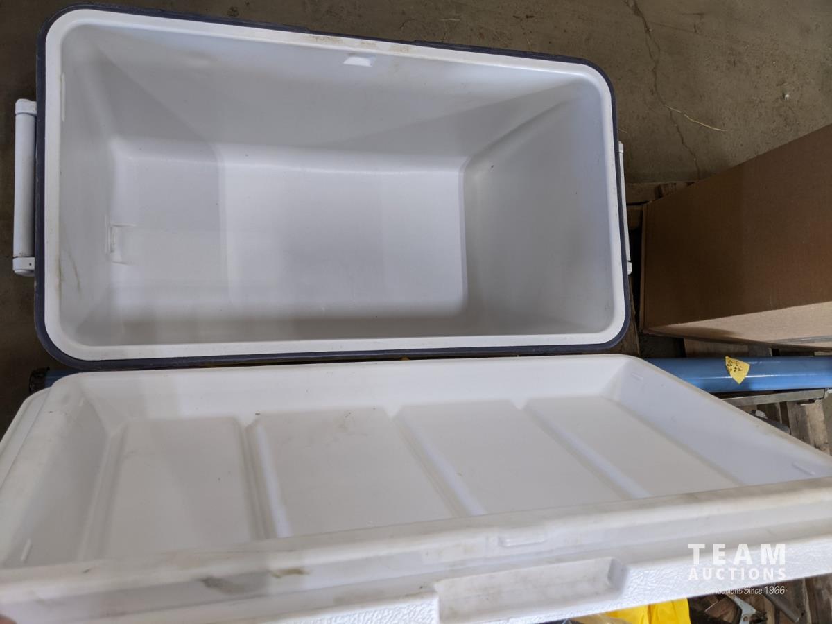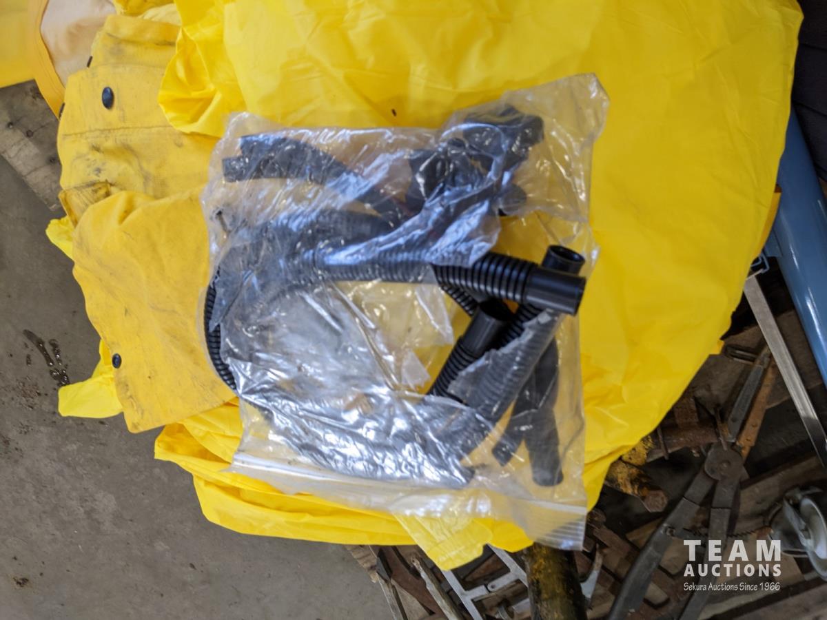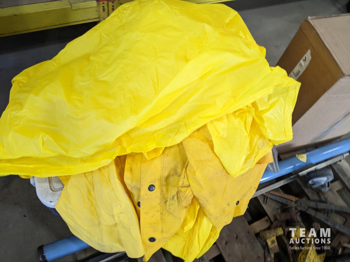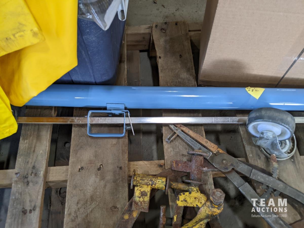 Cooler, (5) rain coats, (4) castors, vac hose, projector screen, inoperable chain saw, welding stand