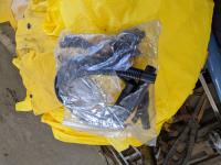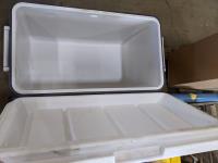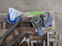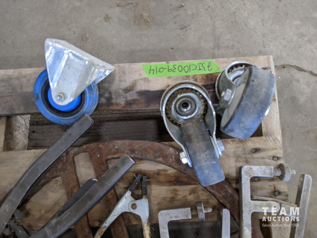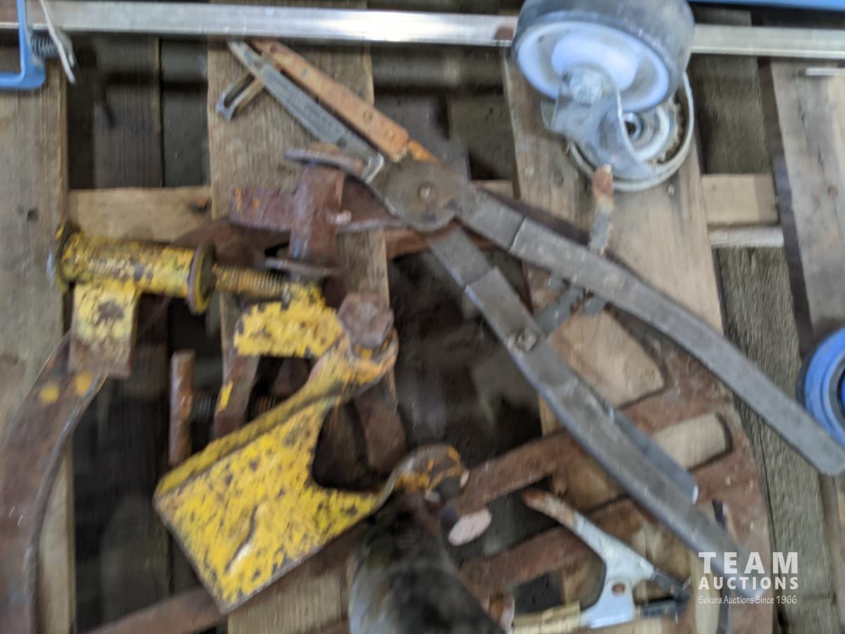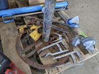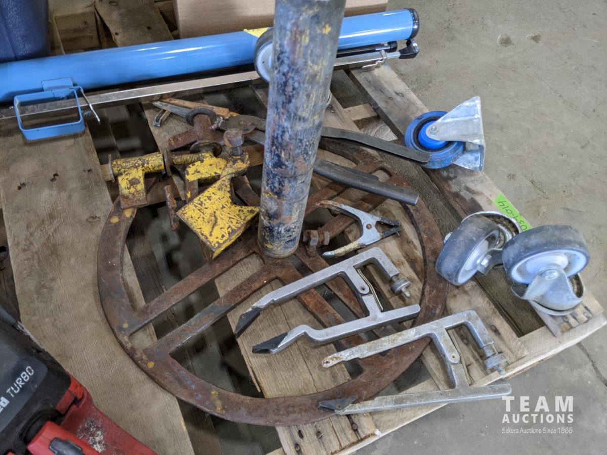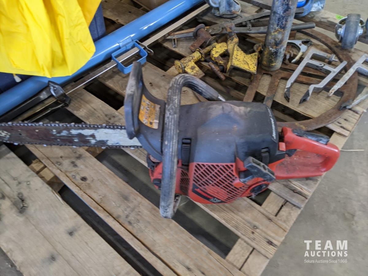 Cooler, (5) rain coats, (4) castors, vac hose, projector screen, inoperable chain saw, welding stand