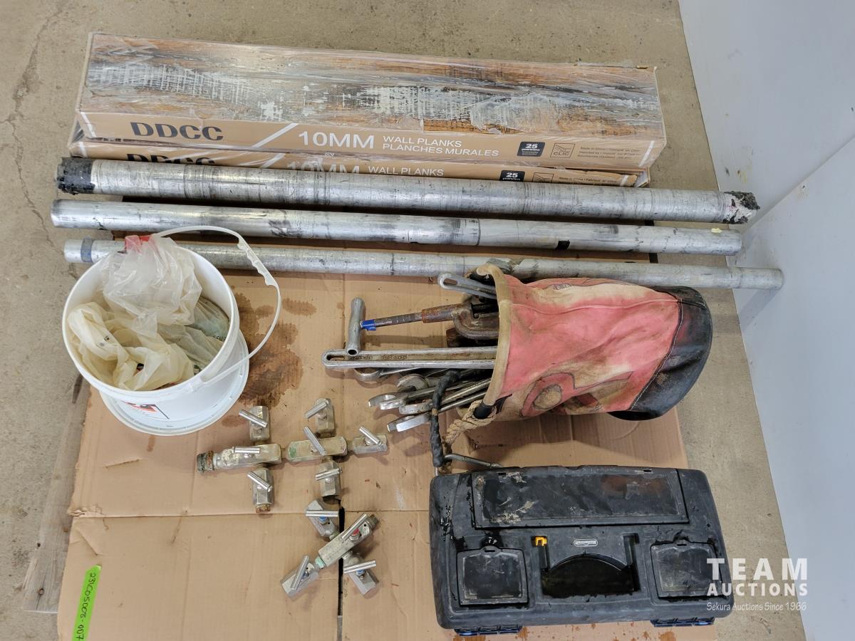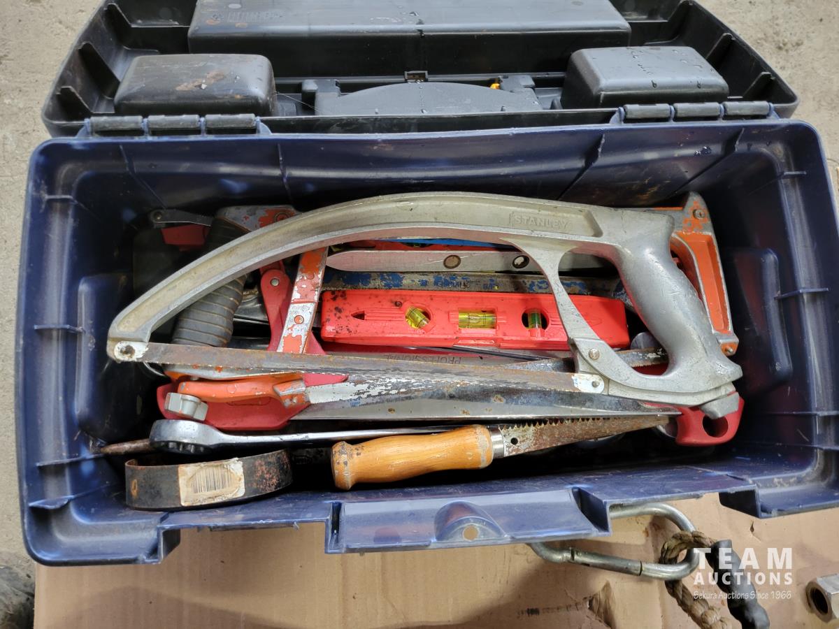 (3) aluminum snipes, qty of hand tools, tool box with contents, (2) boxes of DDCC 10 mm wall planks