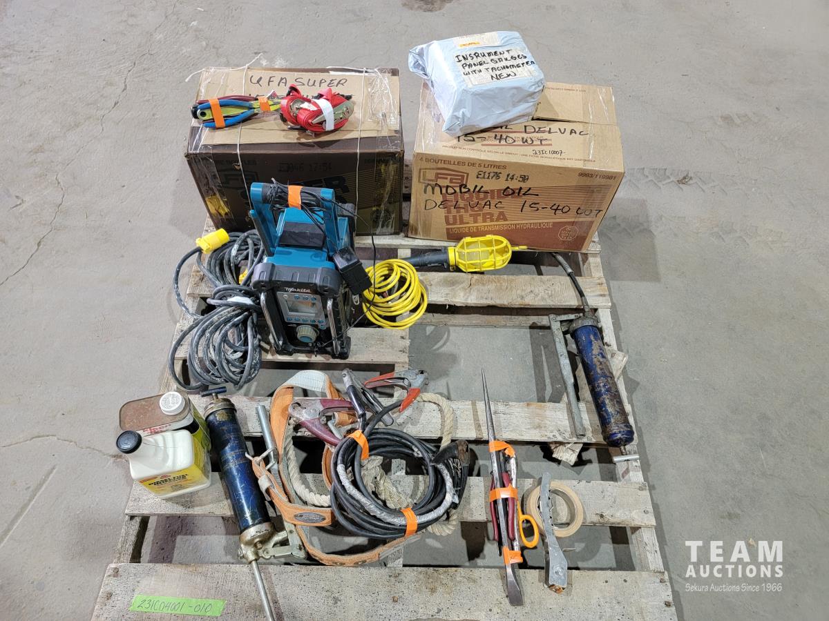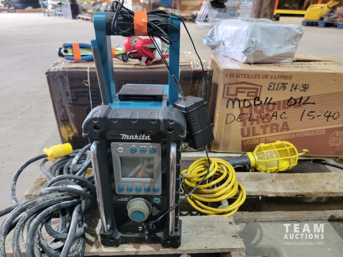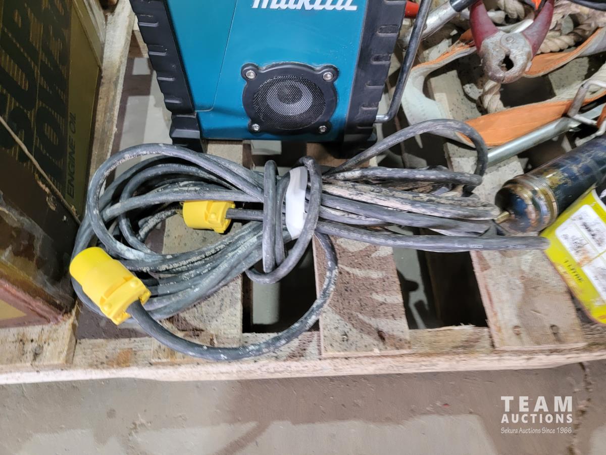 15-40 oil, Makita radio, grease gun, hand tools, trouble light, instrument panel and hand tools