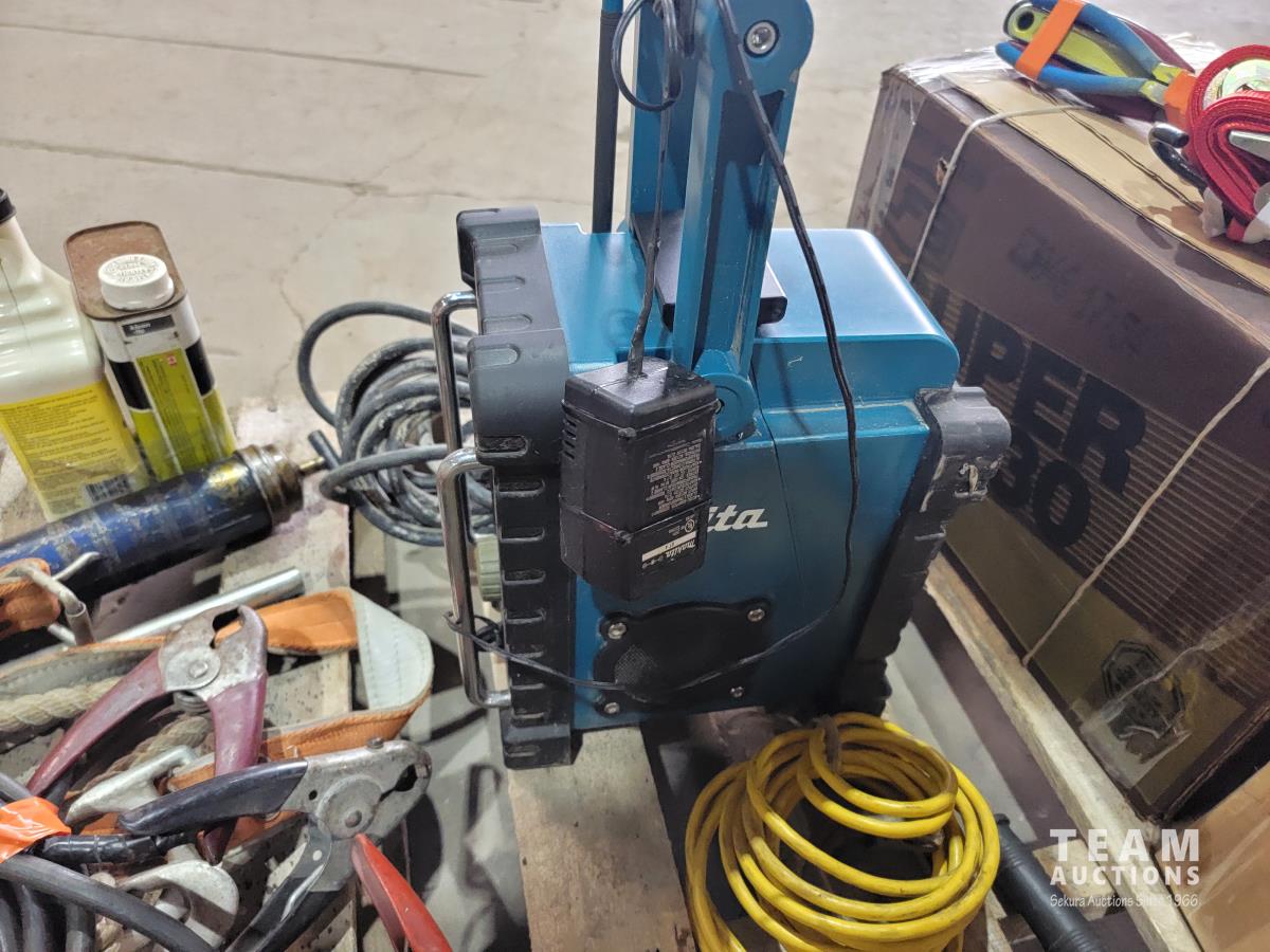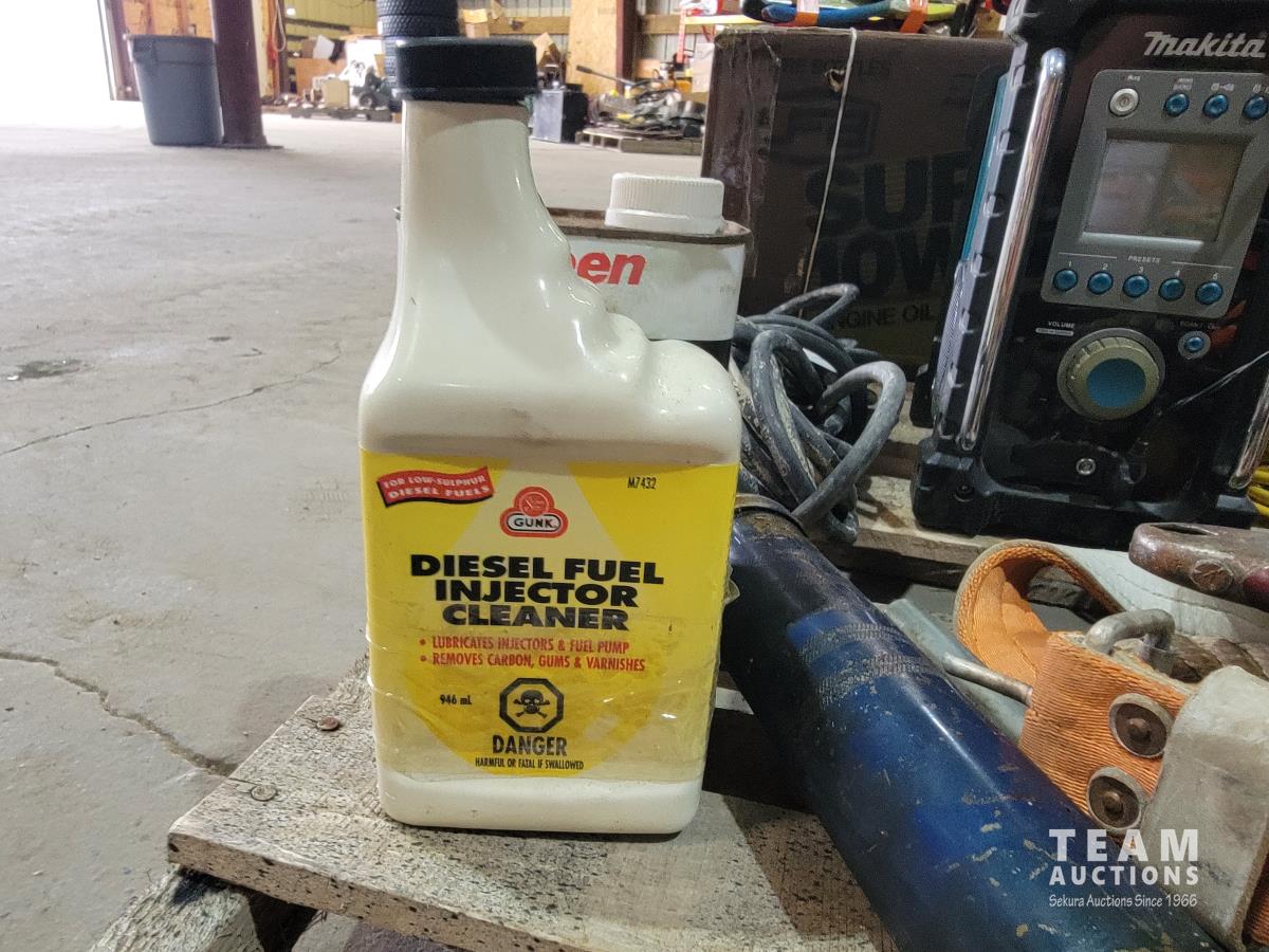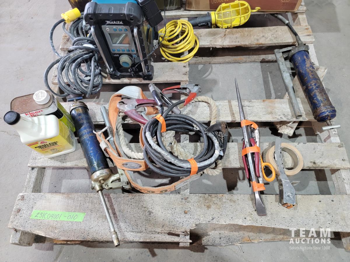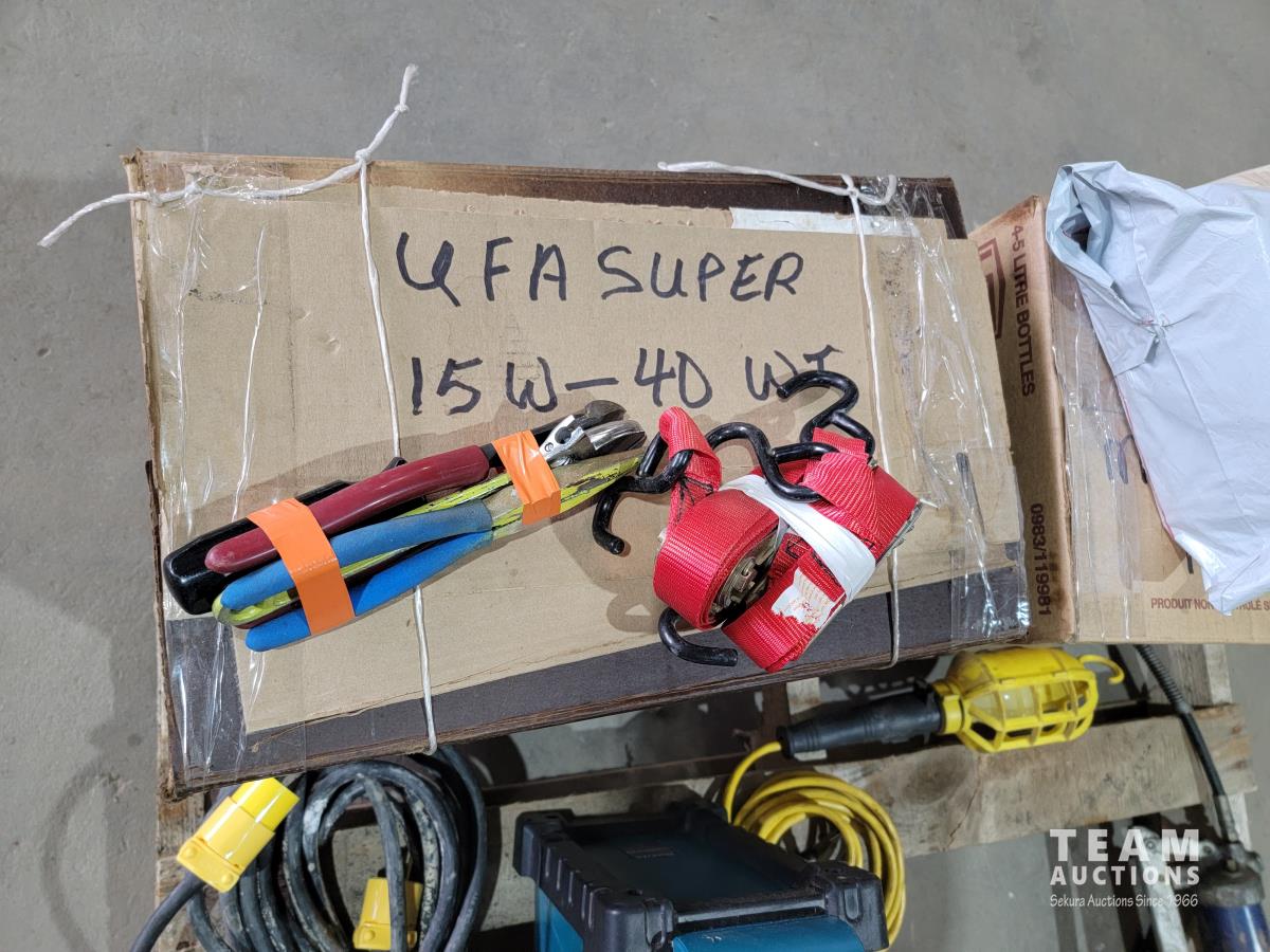 15-40 oil, Makita radio, grease gun, hand tools, trouble light, instrument panel and hand tools