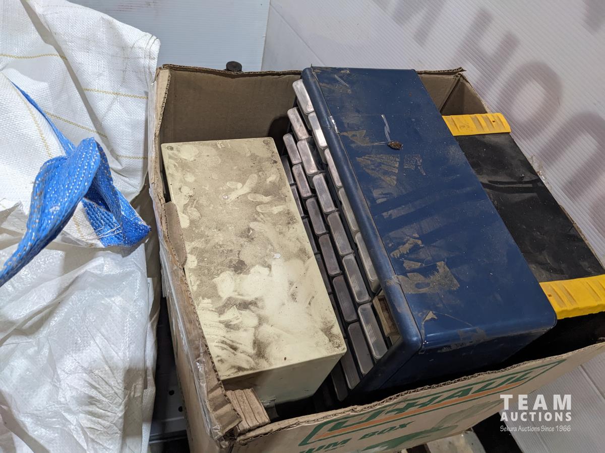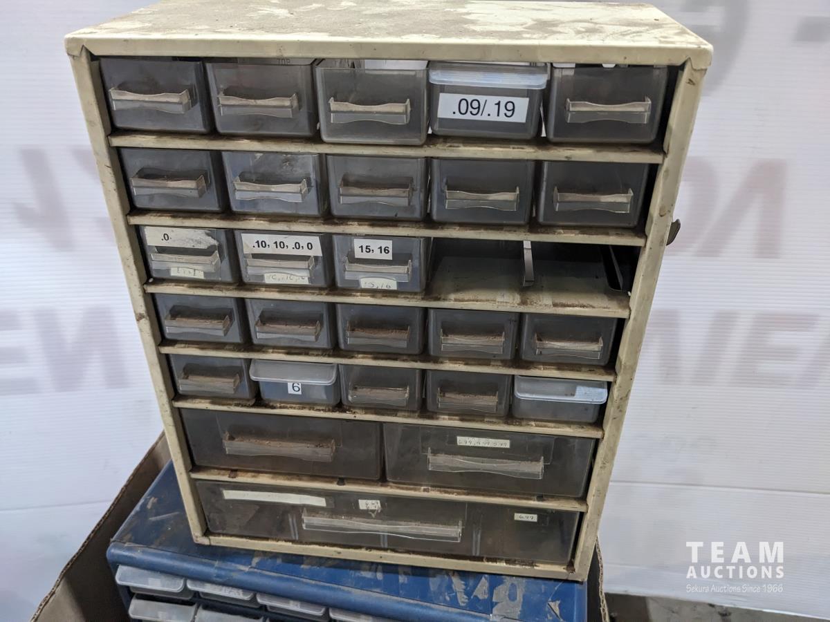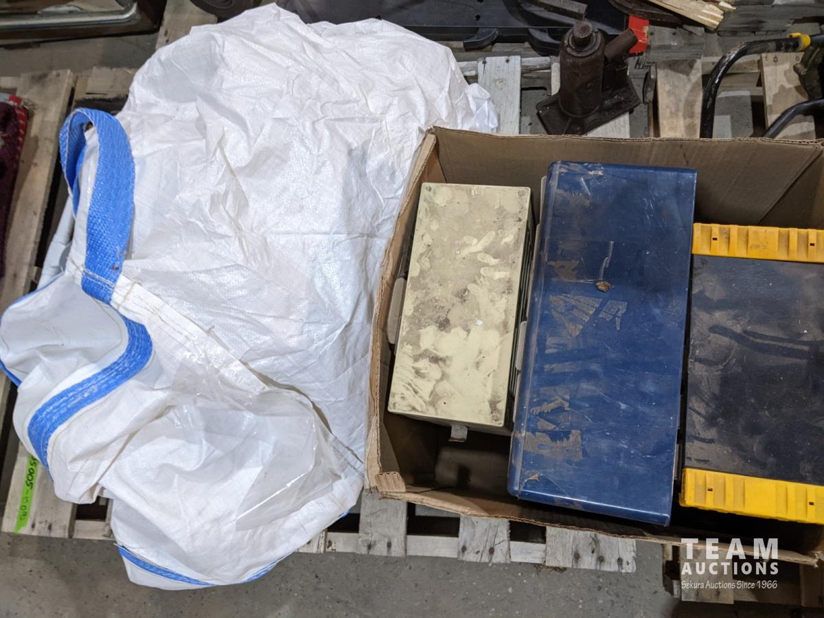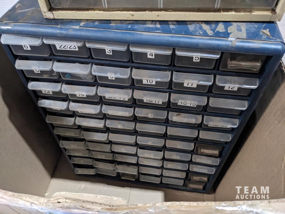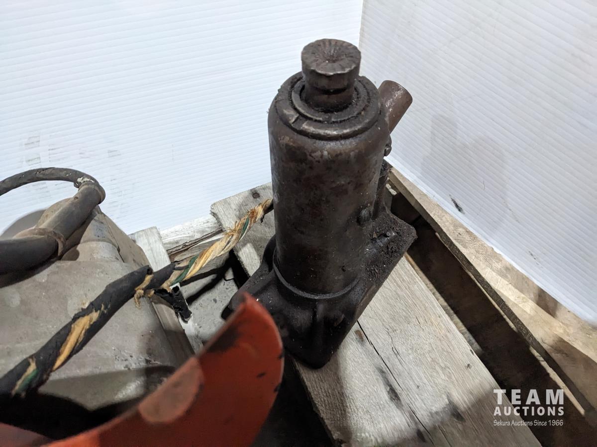 (3) small bolt bins with contents, 1000 kg capacity tote, bottle jack