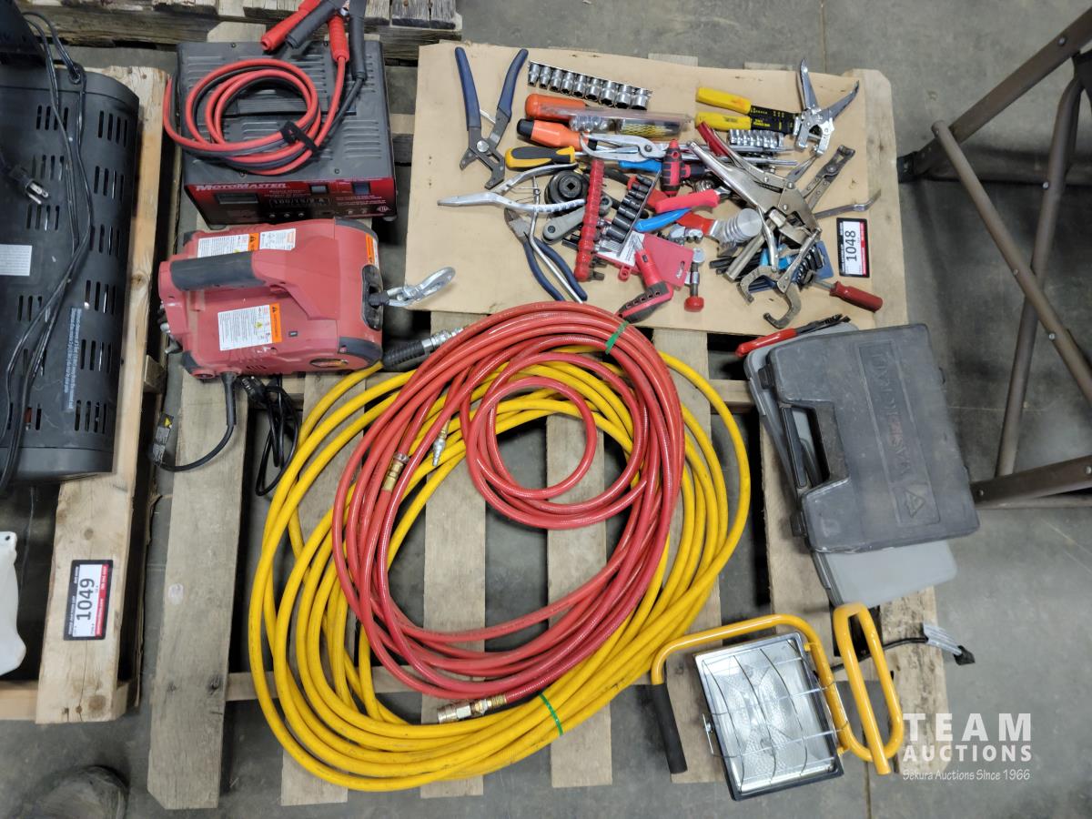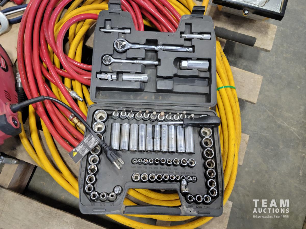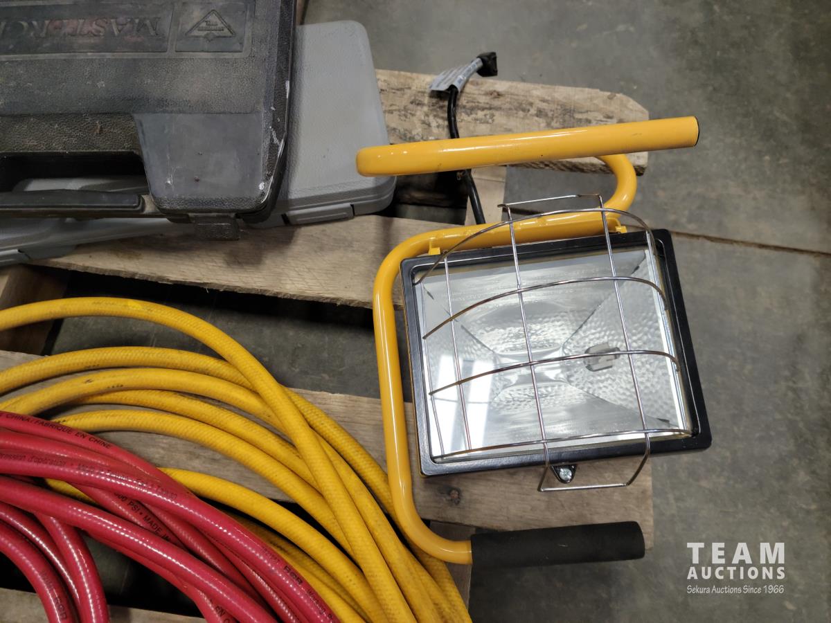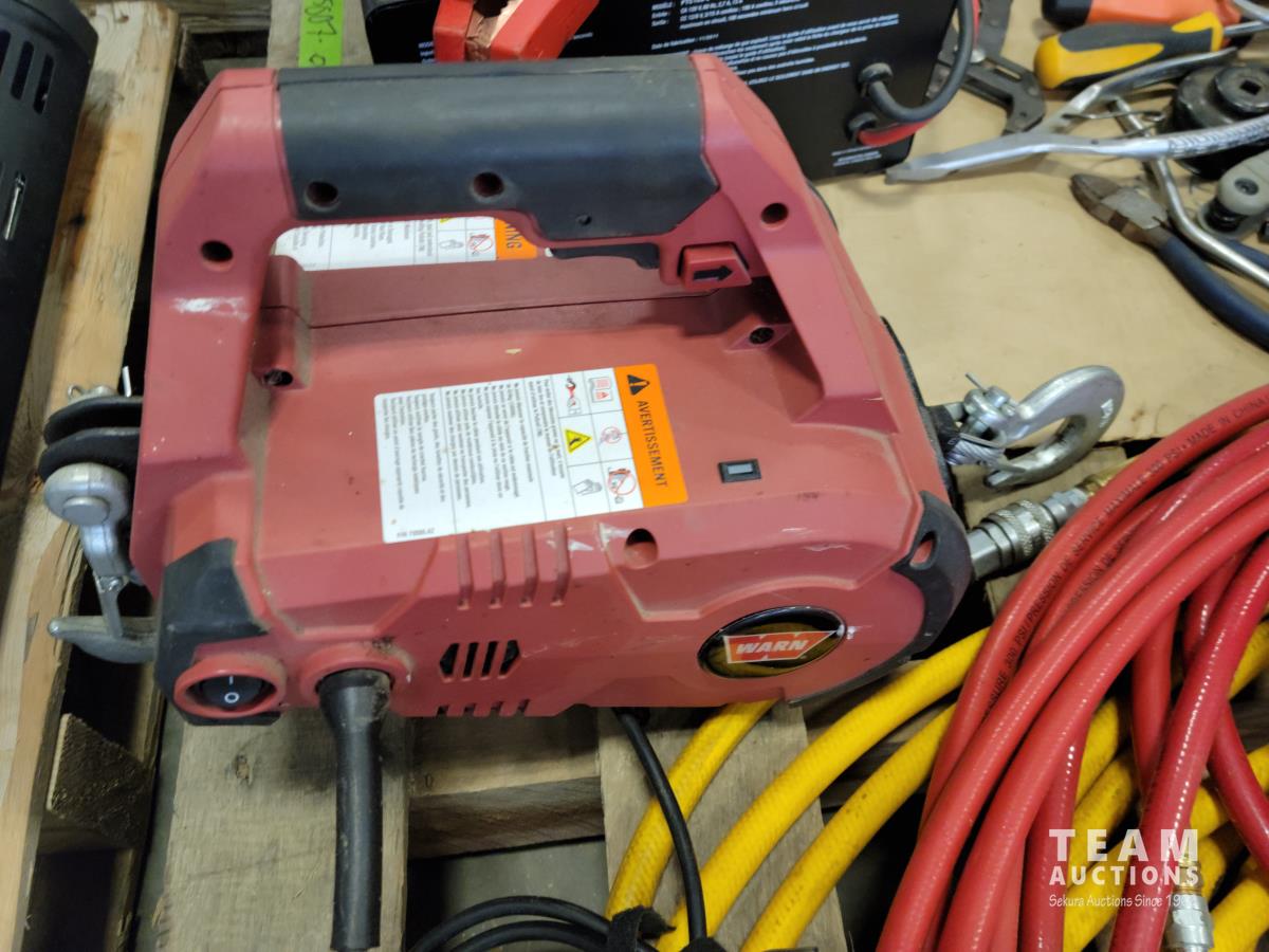 (2) air hoses, Mastercraft tool set, work light, 110V winch, Motormaster 2/15/100 a charger, assorted hand tools