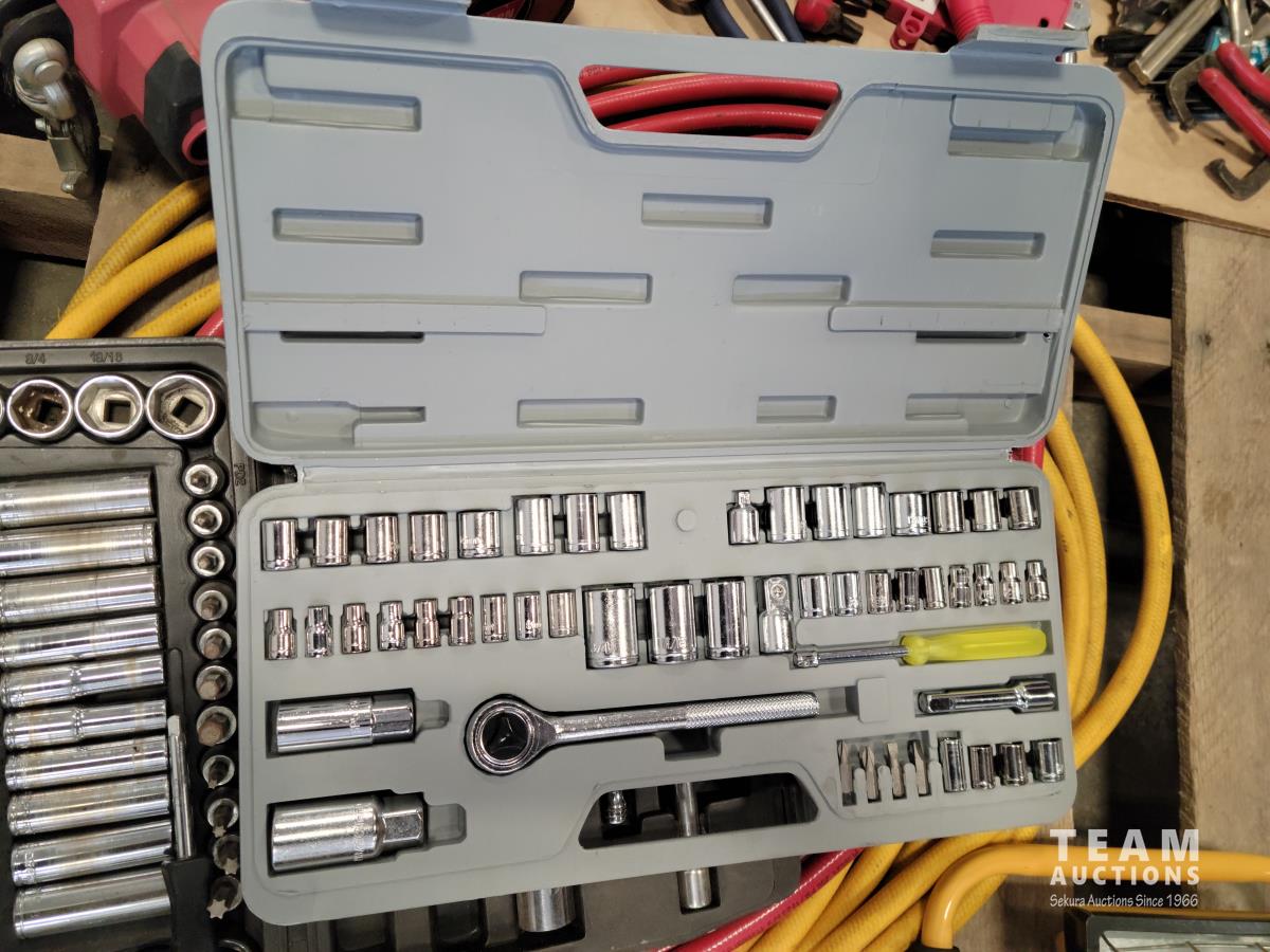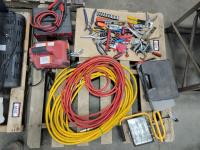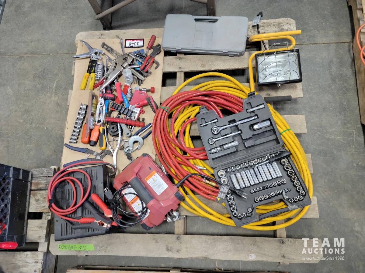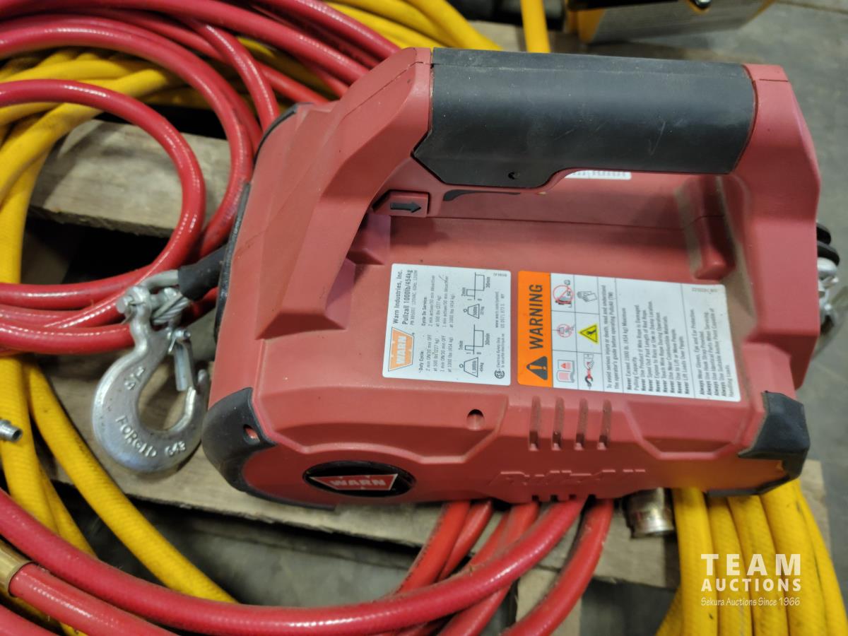 (2) air hoses, Mastercraft tool set, work light, 110V winch, Motormaster 2/15/100 a charger, assorted hand tools