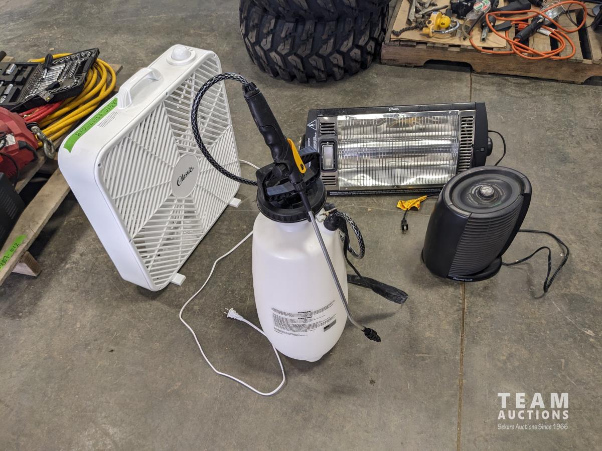 3 gallon Round-up sprayer, Classic 3 speed box fan, Classic overhead heater, Honeywell heater