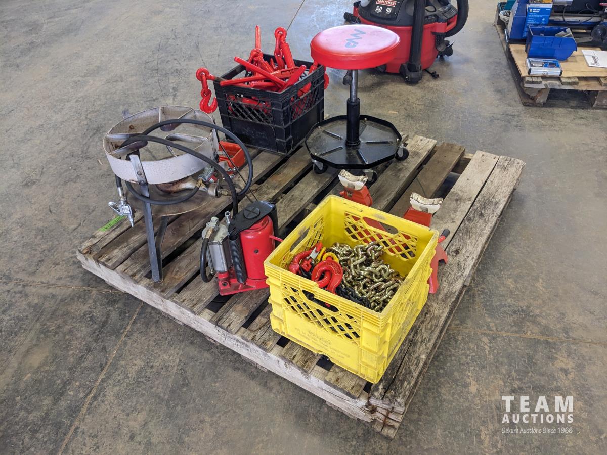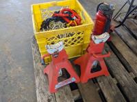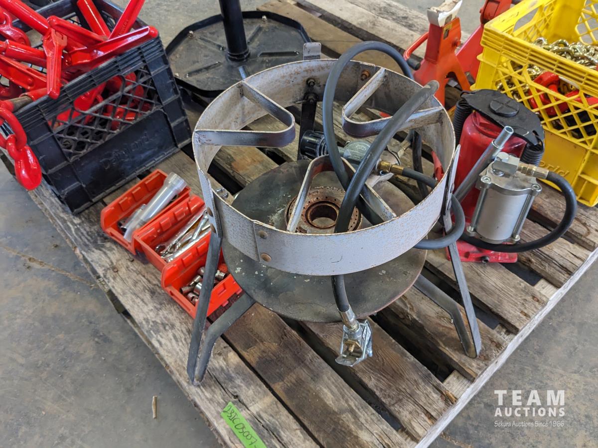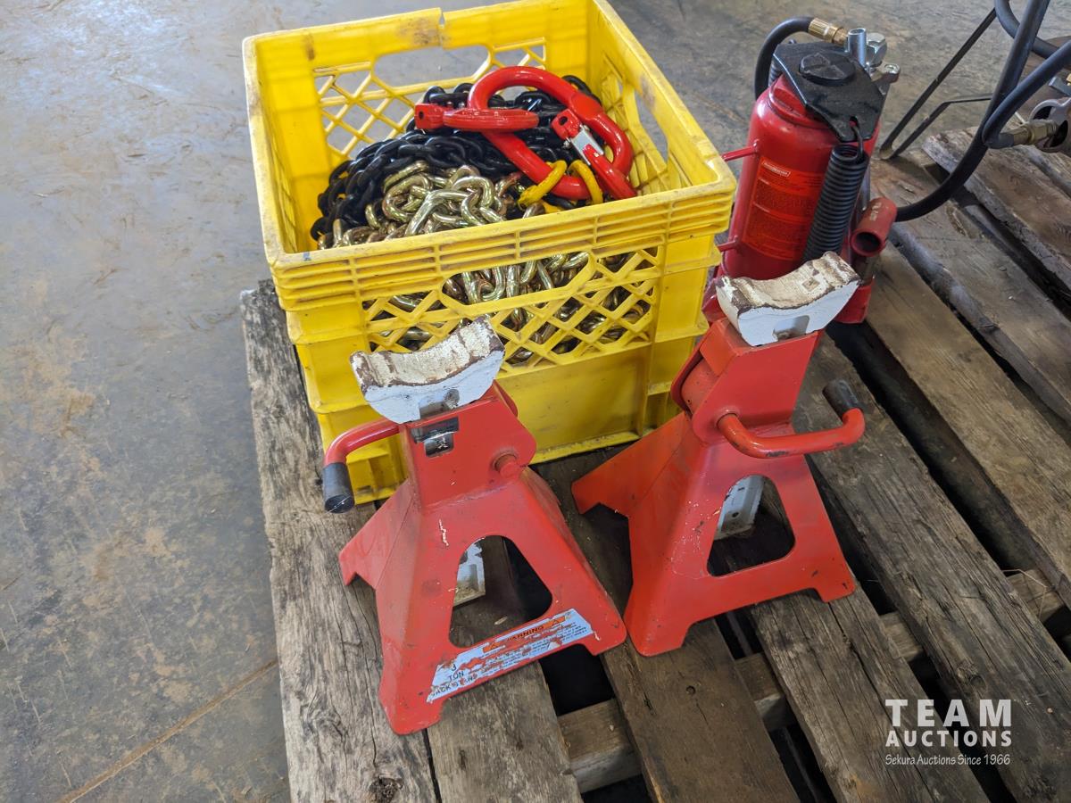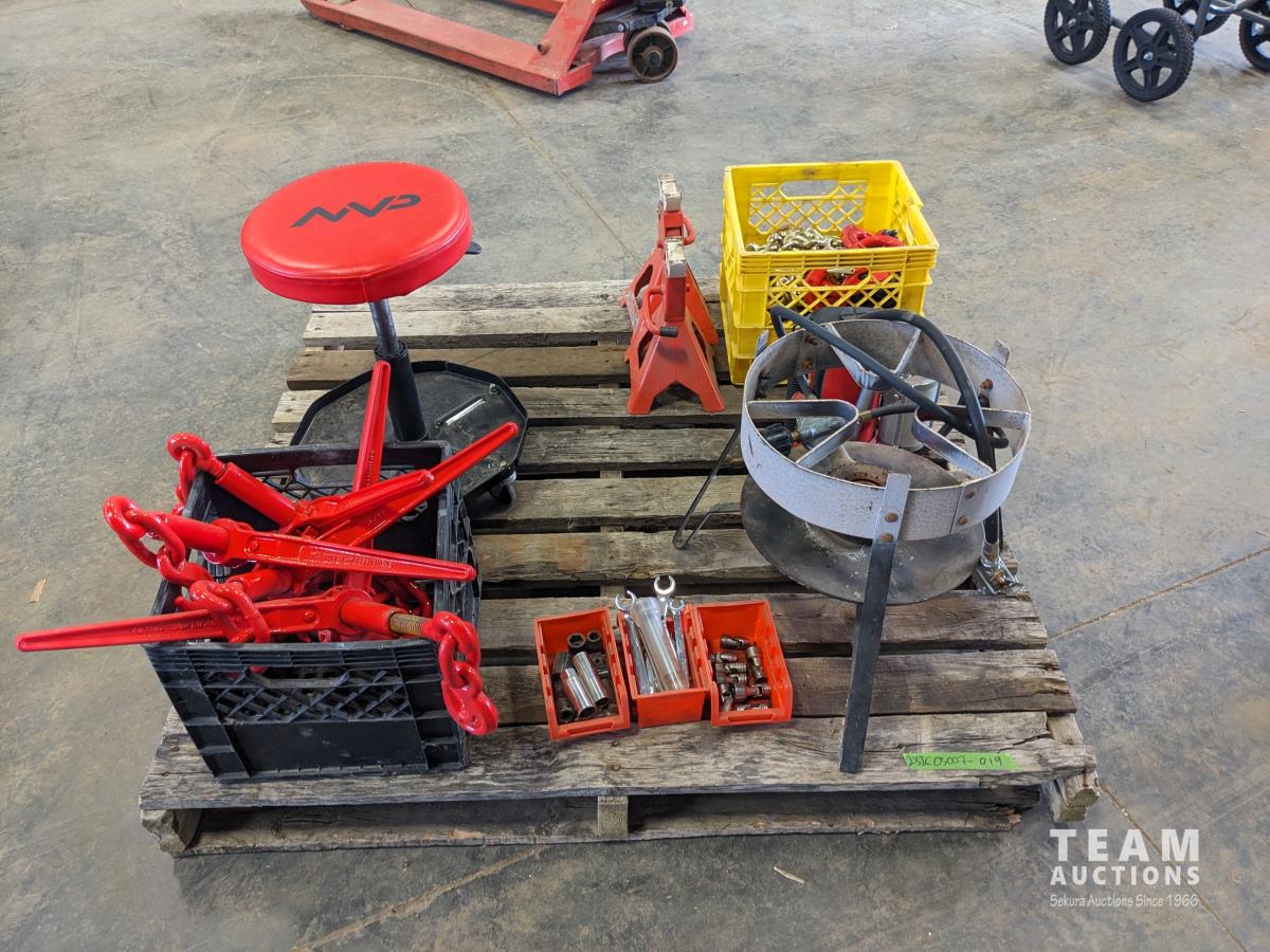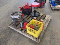 Tools, mechanics stool, (2) axle stands, (5) ratchet load binders, propane burner, air operated bottle jack