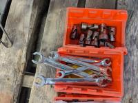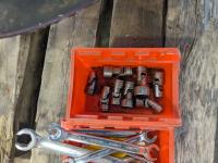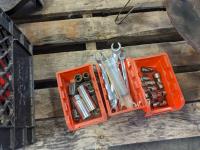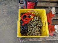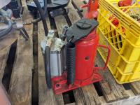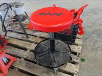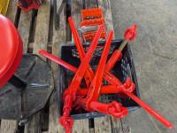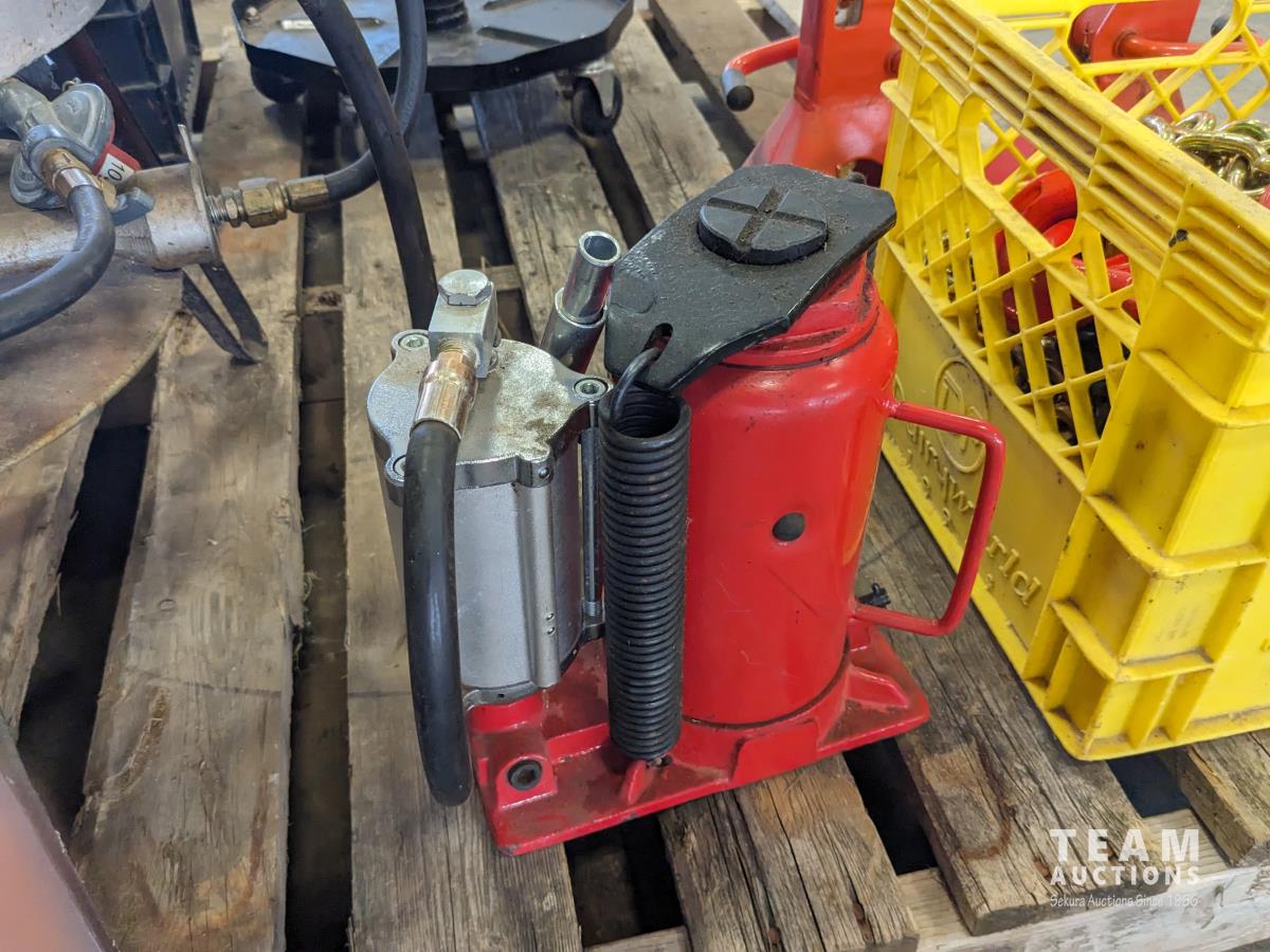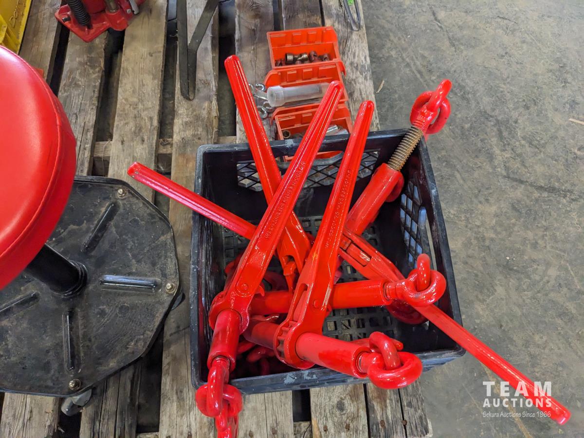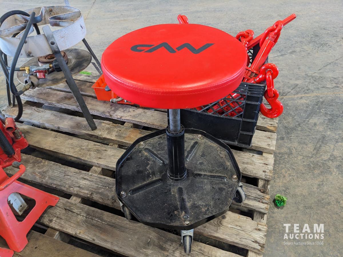 Tools, mechanics stool, (2) axle stands, (5) ratchet load binders, propane burner, air operated bottle jack