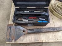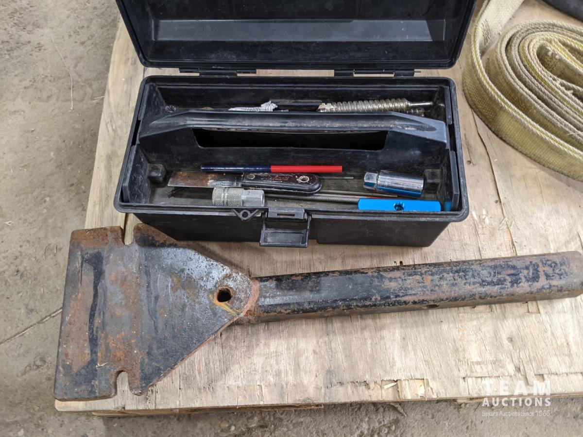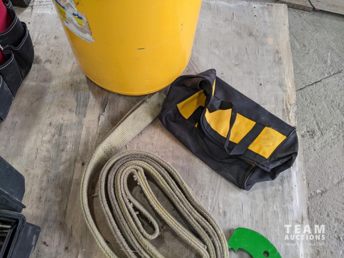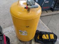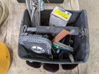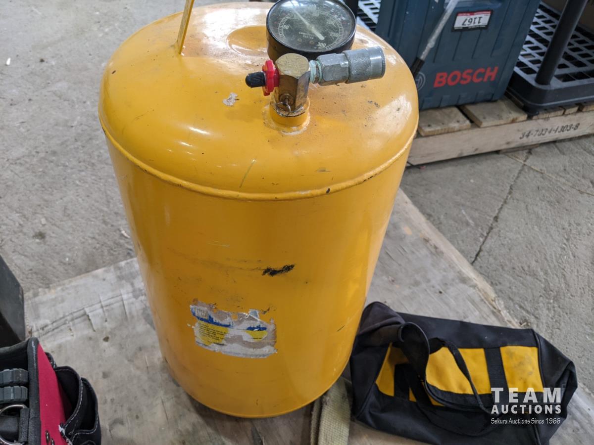 Powerfist air tank, sling, clamp, Husky tool bag with fittings, toolbox with some contents, vintage 50 lb weight