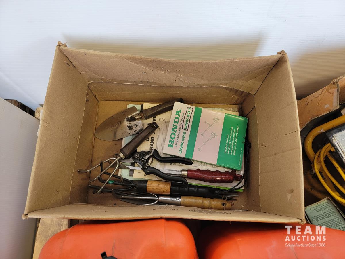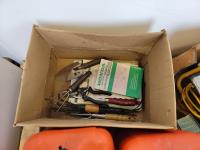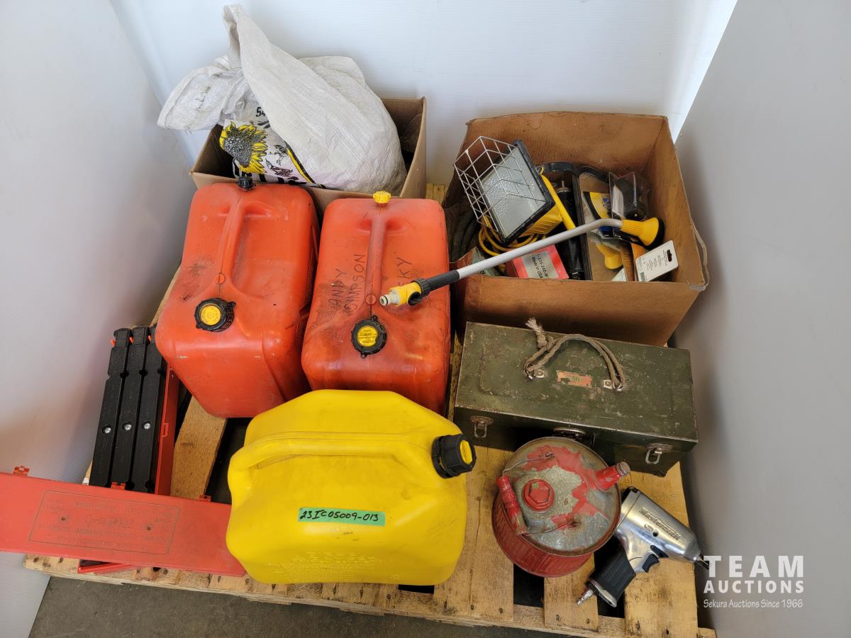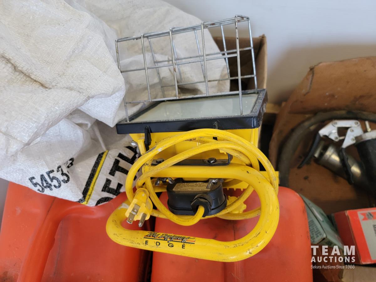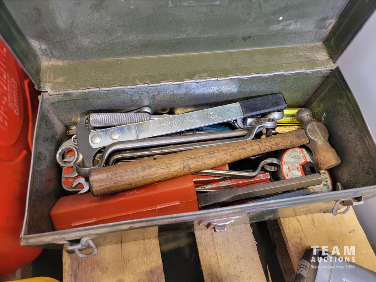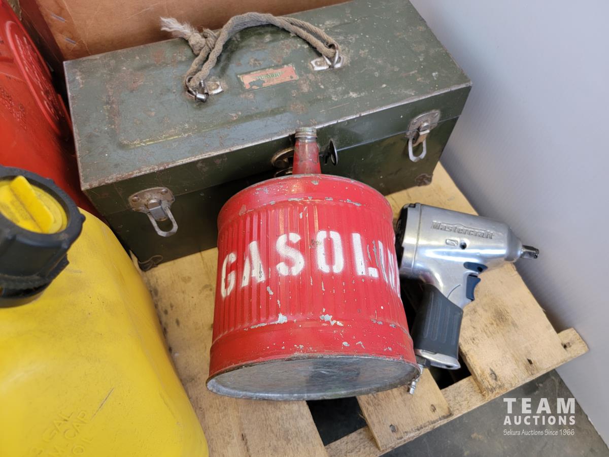 Toolbox with contents, (3) Jerry cans, Vintage gas can, warning triangle, b Burlap sacks, work lamp, miscellaneous tools and hardware