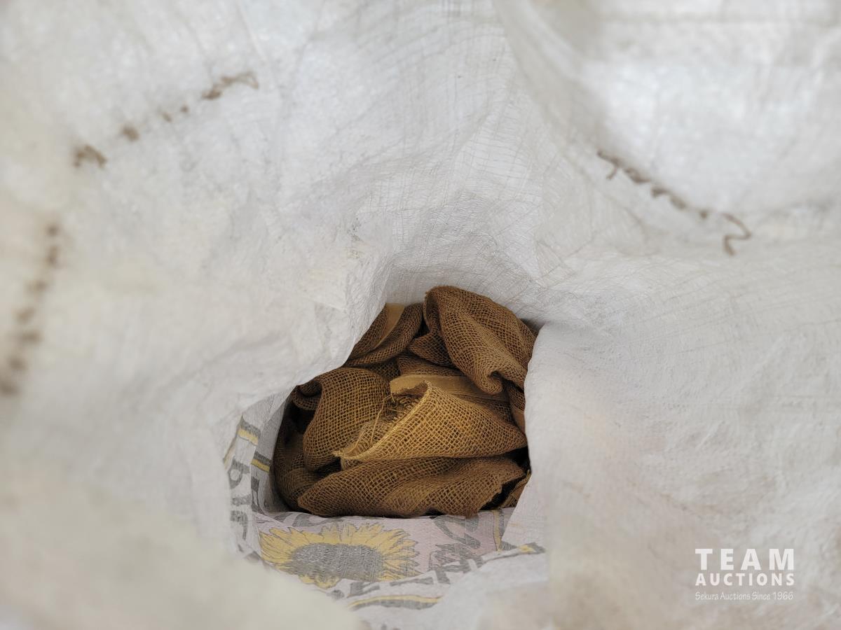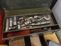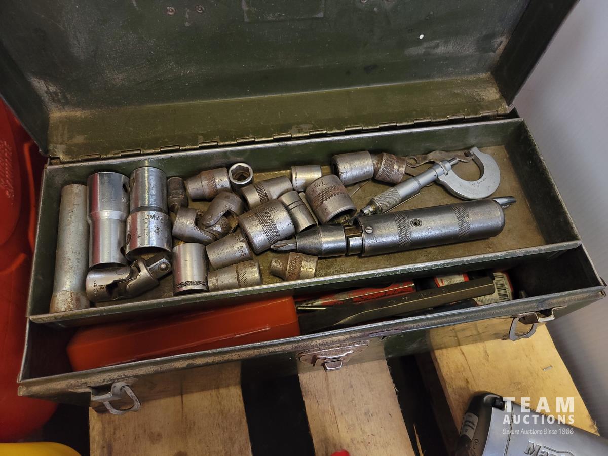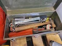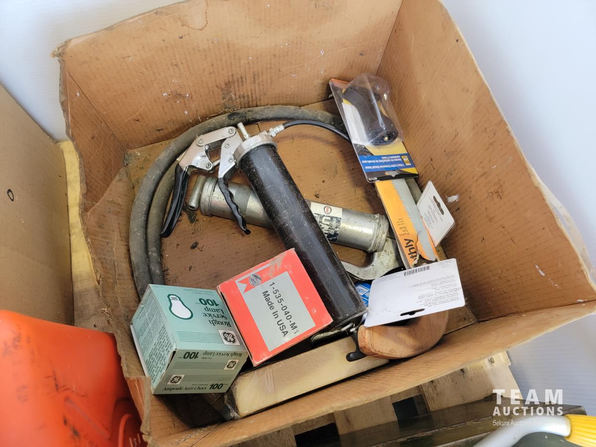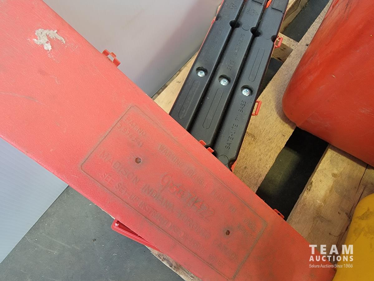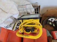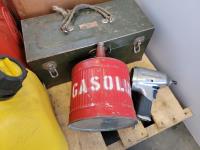 Toolbox with contents, (3) Jerry cans, Vintage gas can, warning triangle, b Burlap sacks, work lamp, miscellaneous tools and hardware