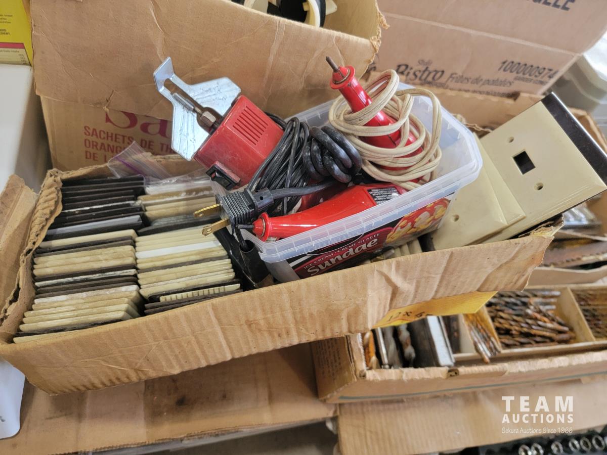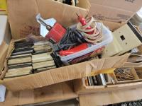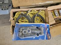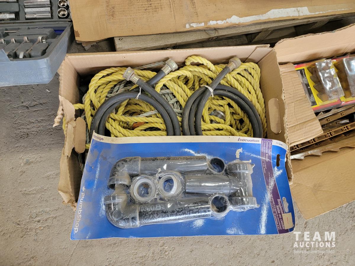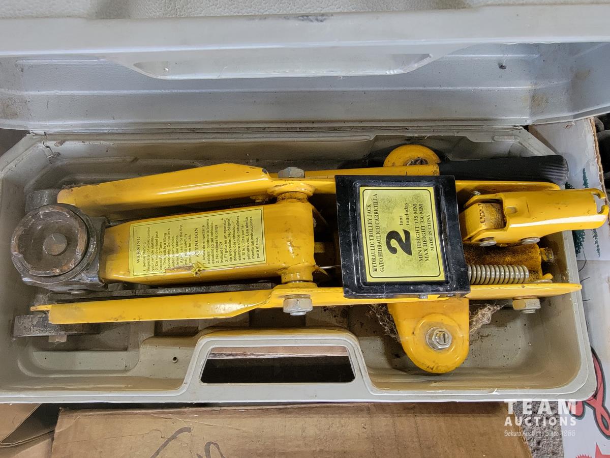 Paper towel dispensers, tools, light switch covers, 2 ton hydraulic trolley jacks, shelf brackets, ropes, drill bits, tank valves