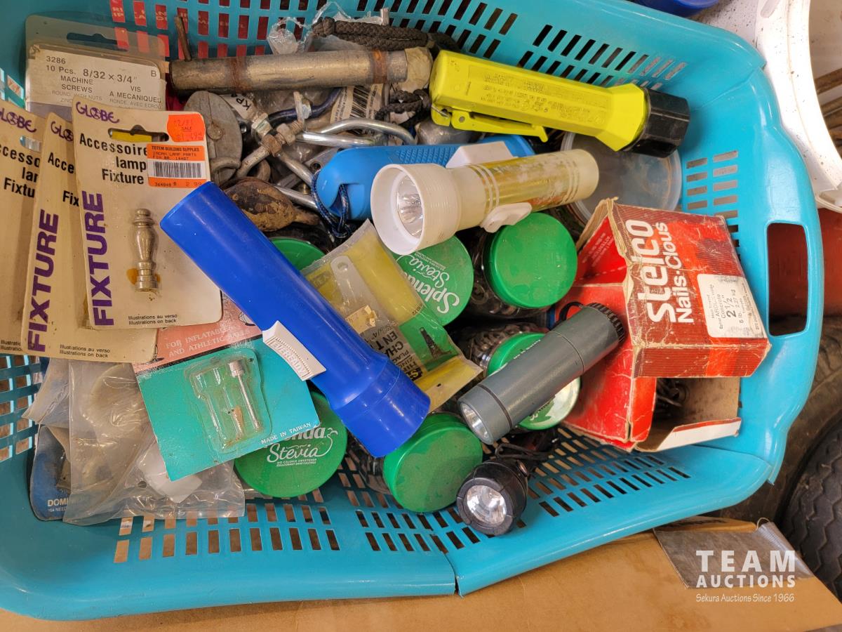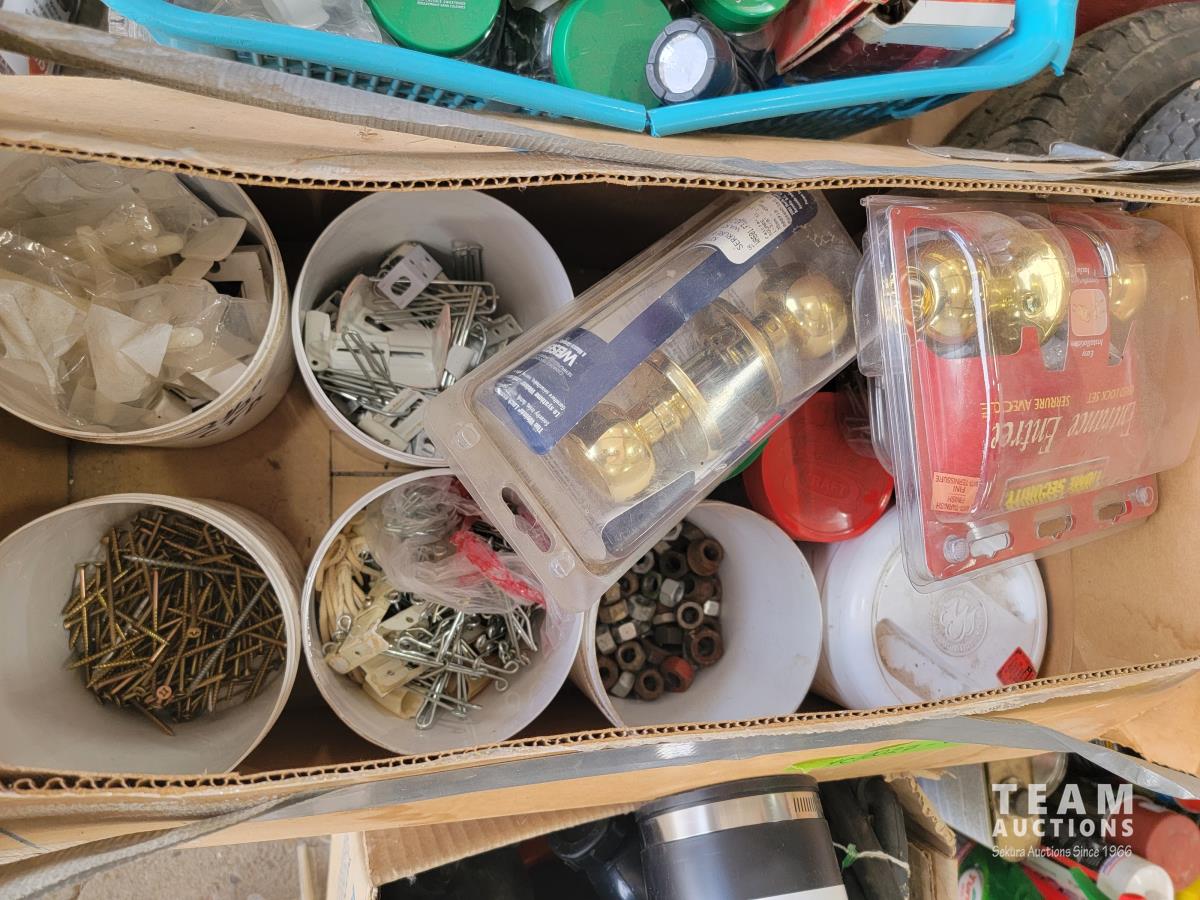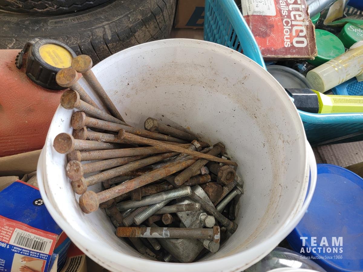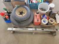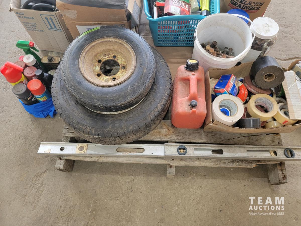 (2) levels, tape, light switch covers, assortment of screw and nails, hardware, qty of flexible coupling, door knobs, (2) utility tires, Jerry can