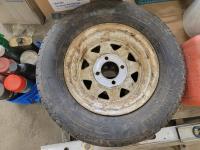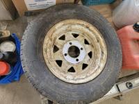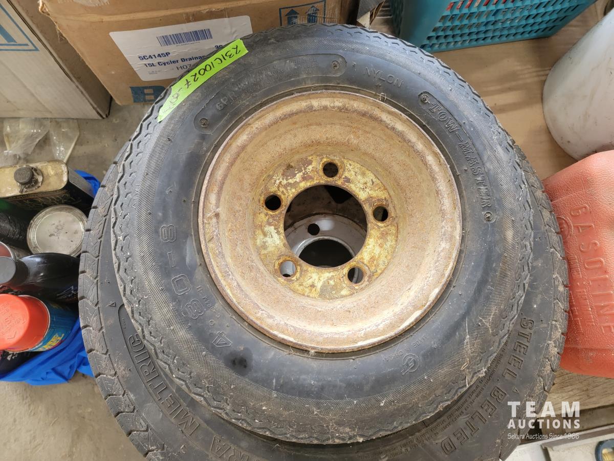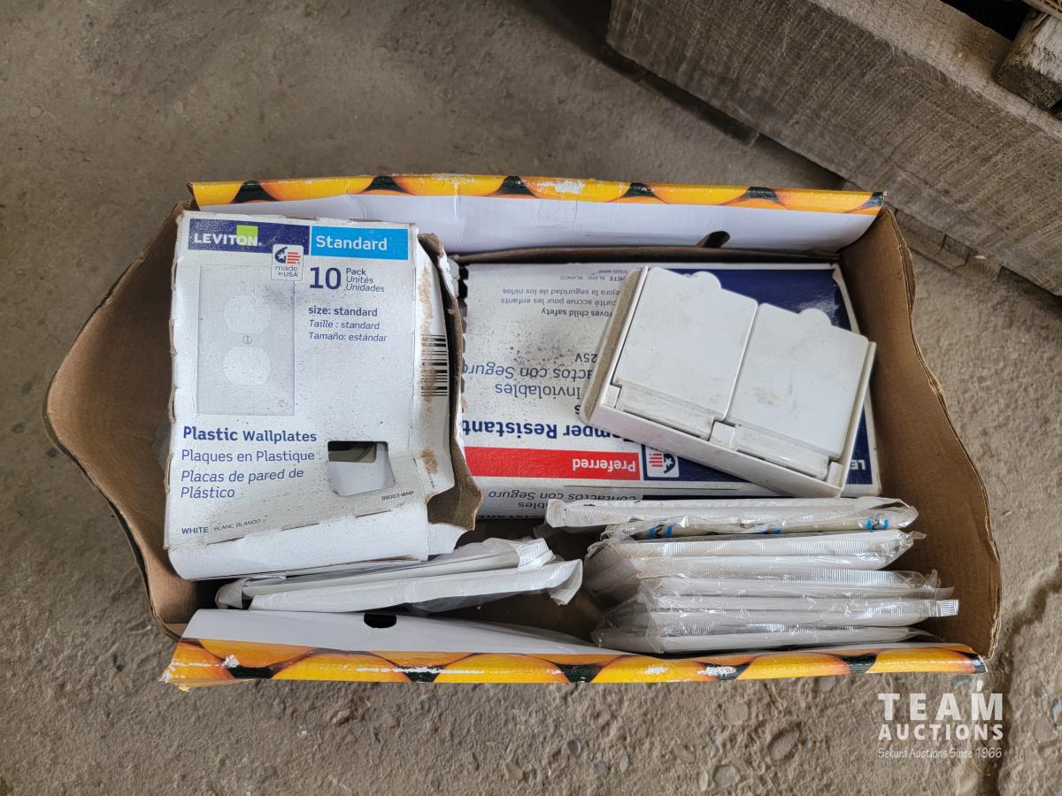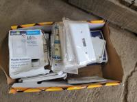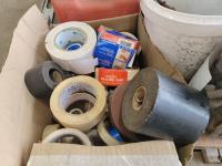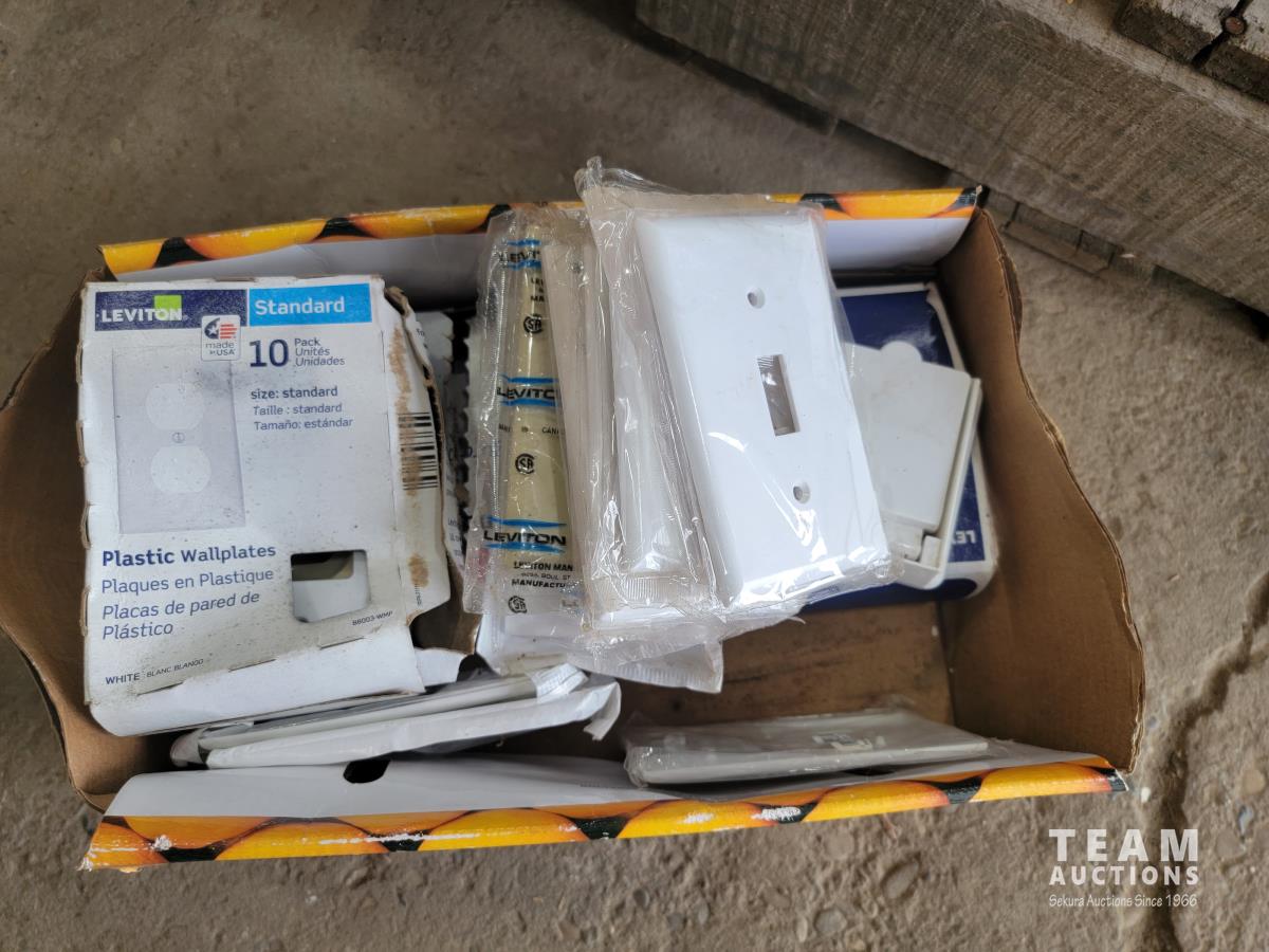 (2) levels, tape, light switch covers, assortment of screw and nails, hardware, qty of flexible coupling, door knobs, (2) utility tires, Jerry can