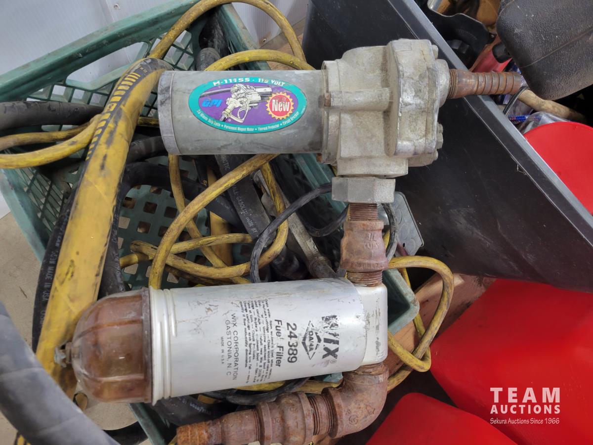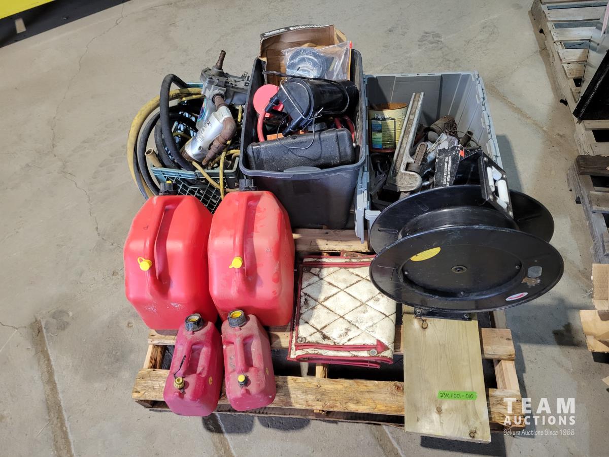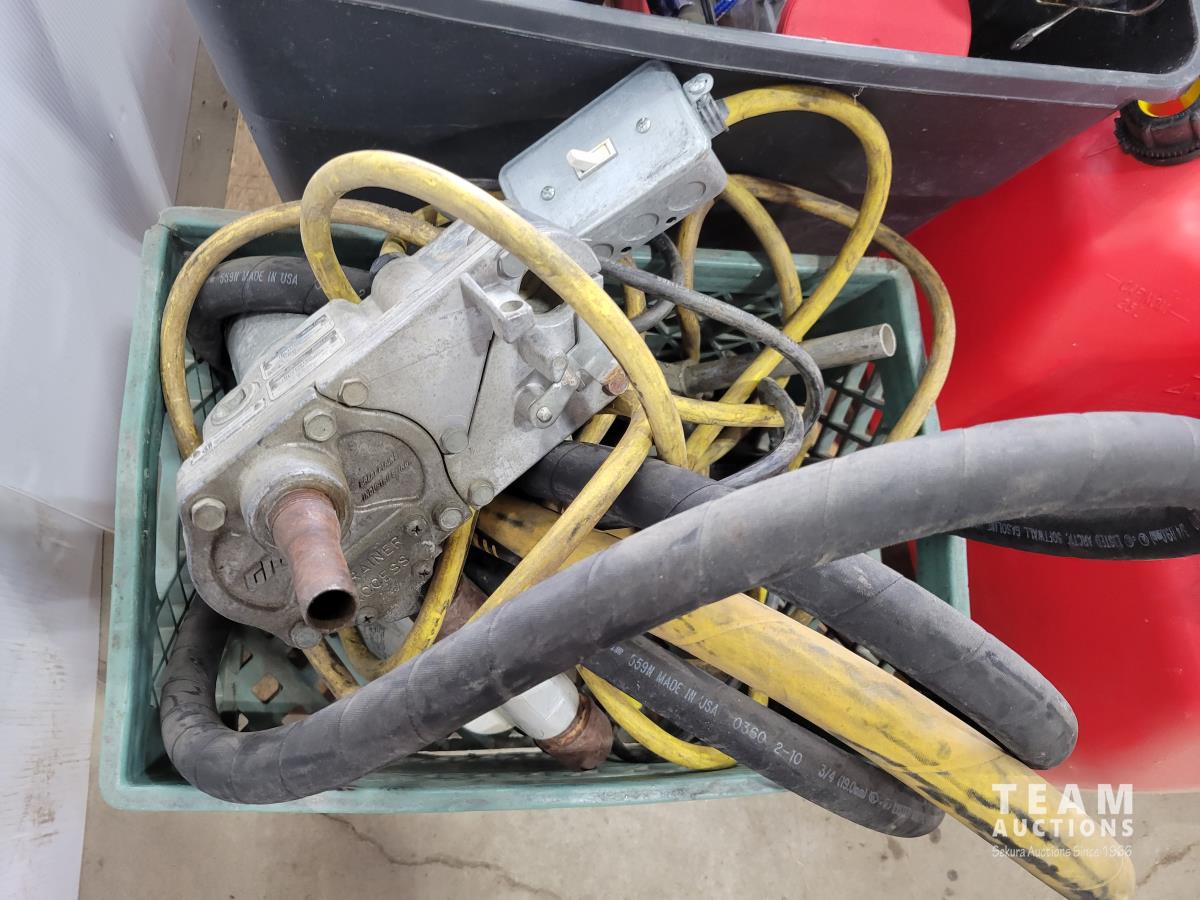Air hose reel, strut coil spring compressor, hand tools, Jerry cans, GPI 115v fuel transfer pump