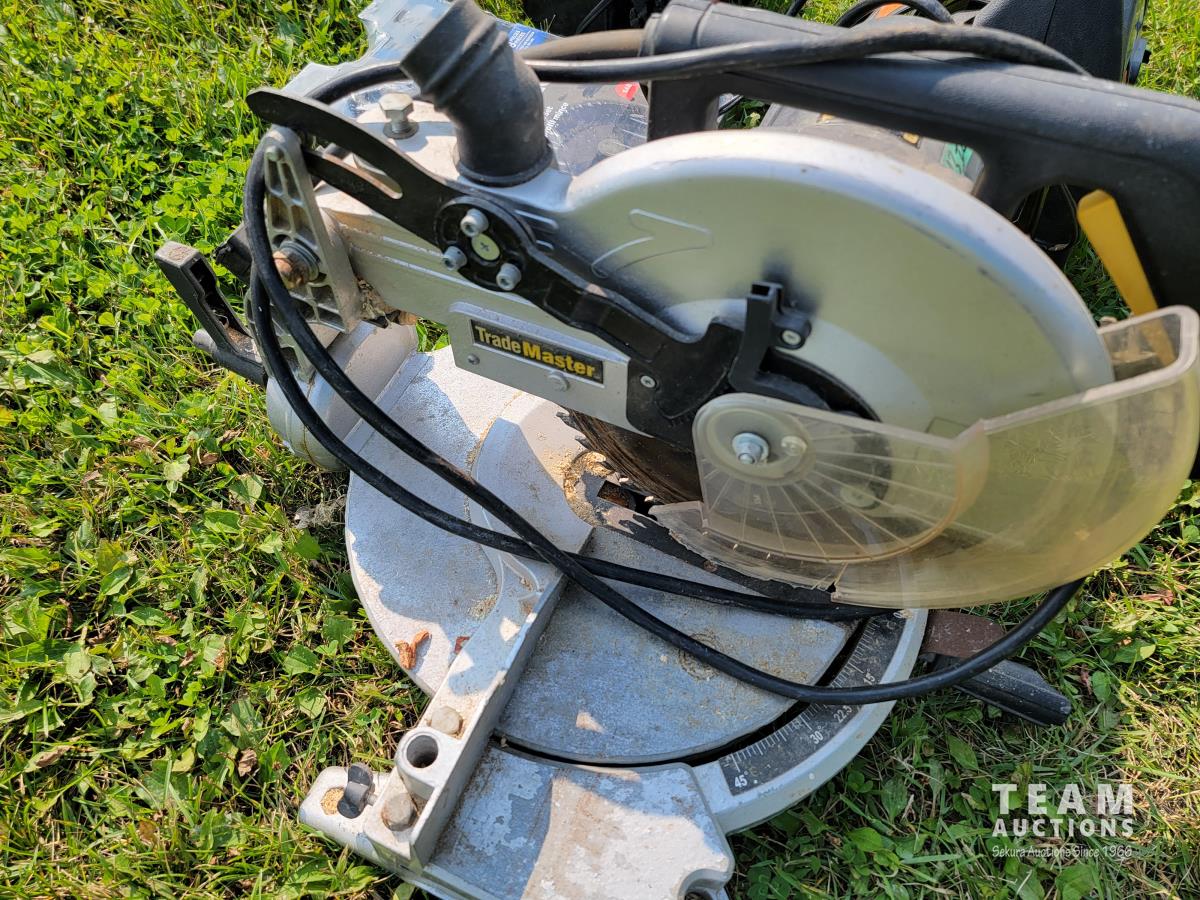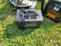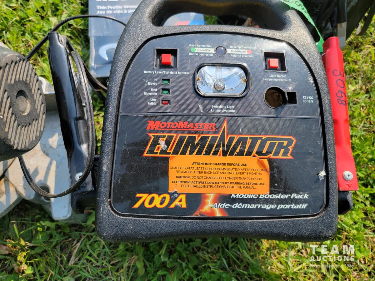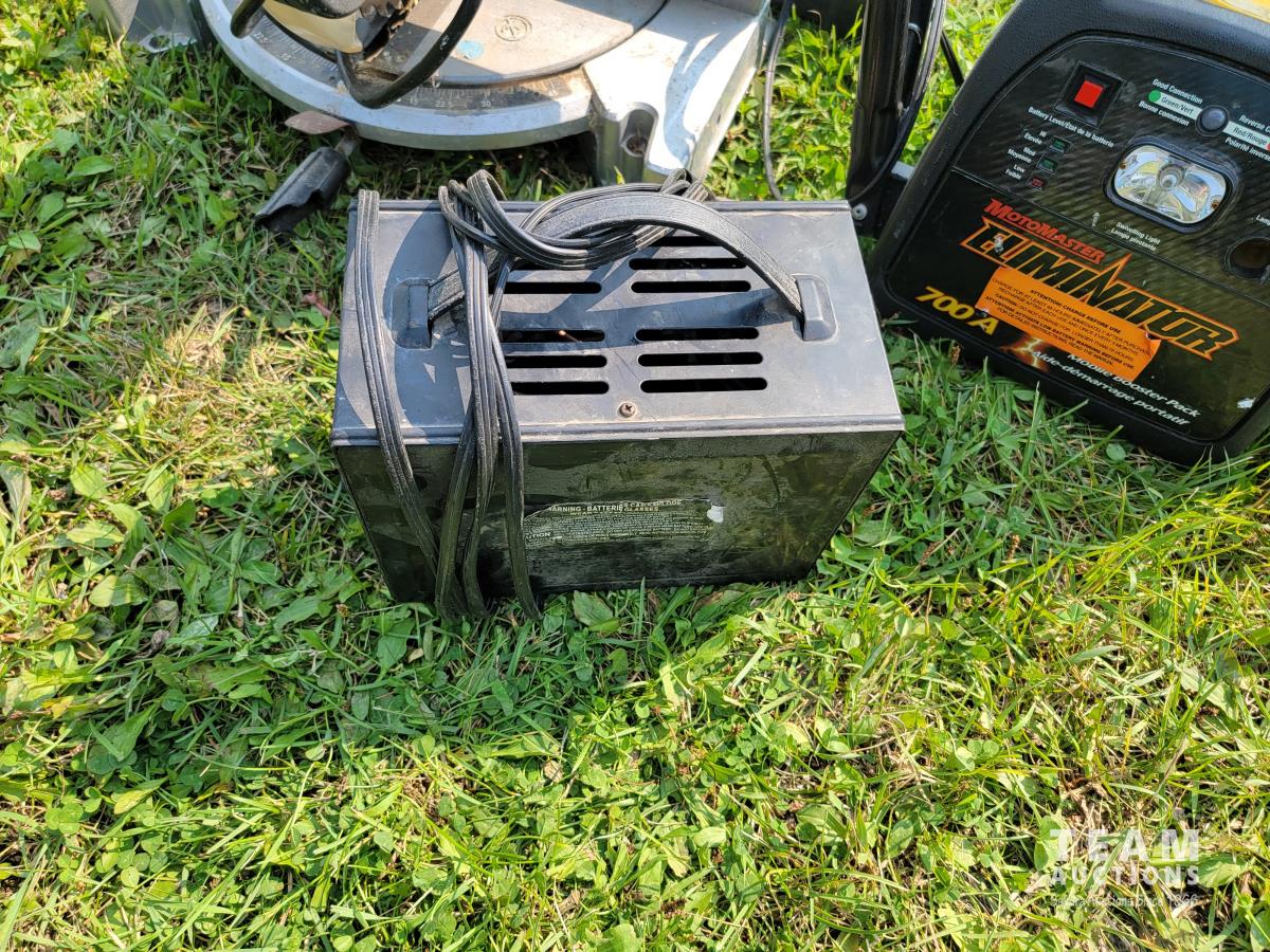 Trademaster 10 inch compound saw, model TM26003 12v 15a 4600rpm, Maximum 8 piece thin profile wrench set (unused), Motomaster Eliminator 700a mobile booster pack 120v, battery charger