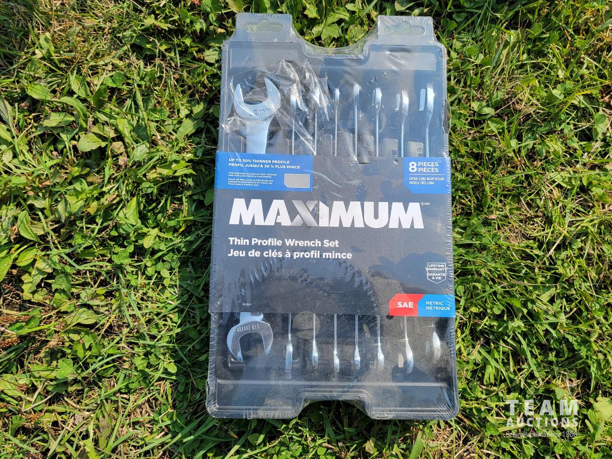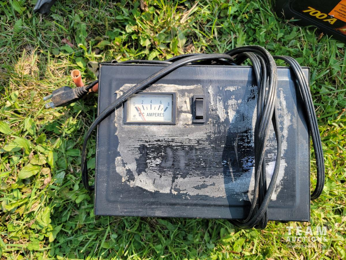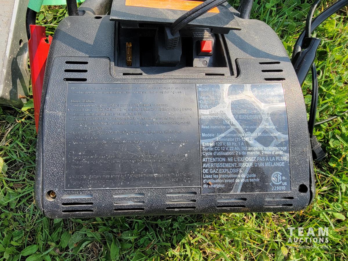Trademaster 10 inch compound saw, model TM26003 12v 15a 4600rpm, Maximum 8 piece thin profile wrench set (unused), Motomaster Eliminator 700a mobile booster pack 120v, battery charger