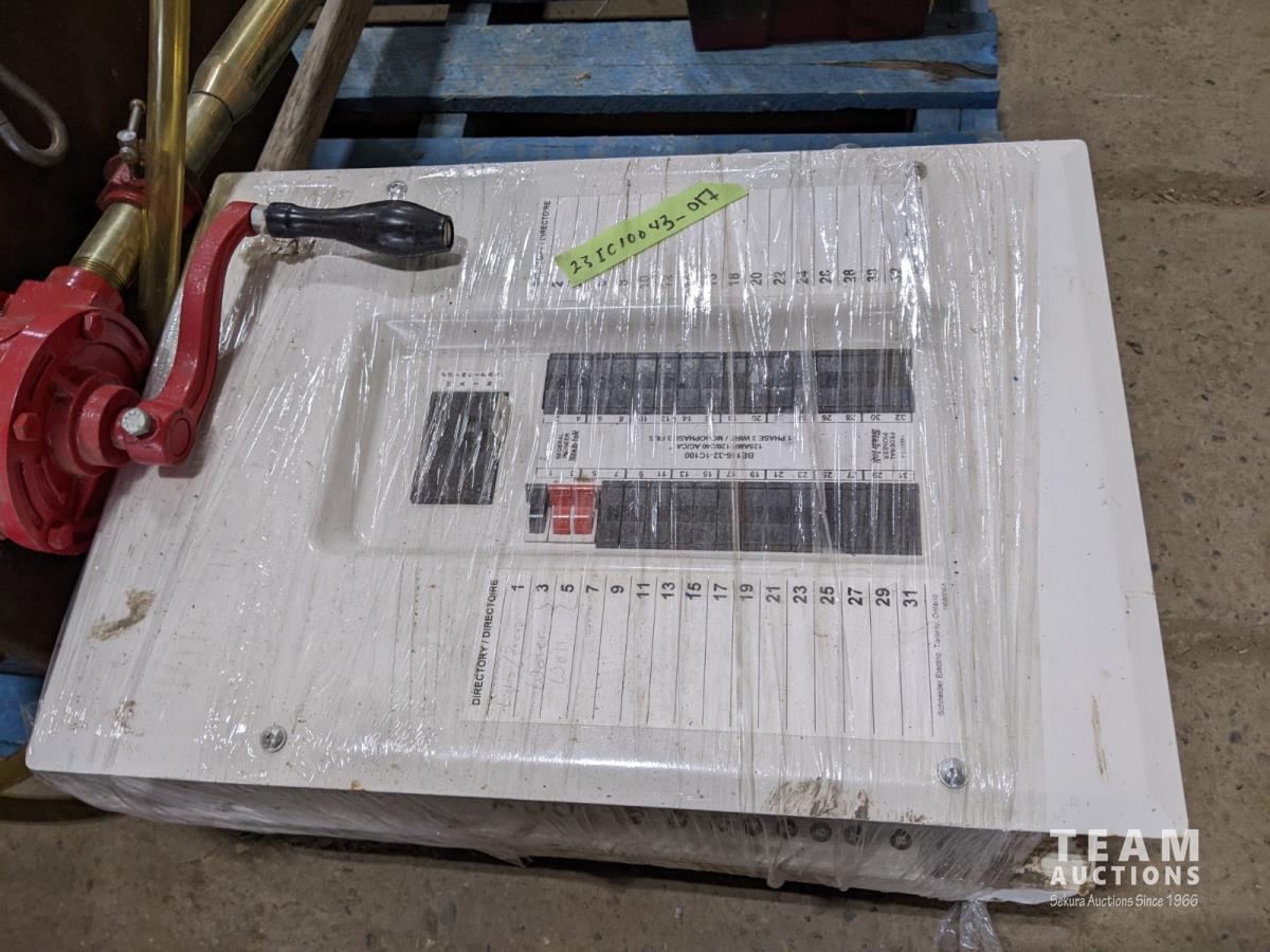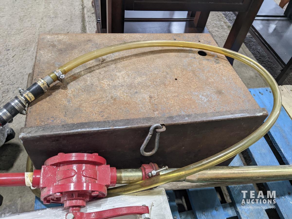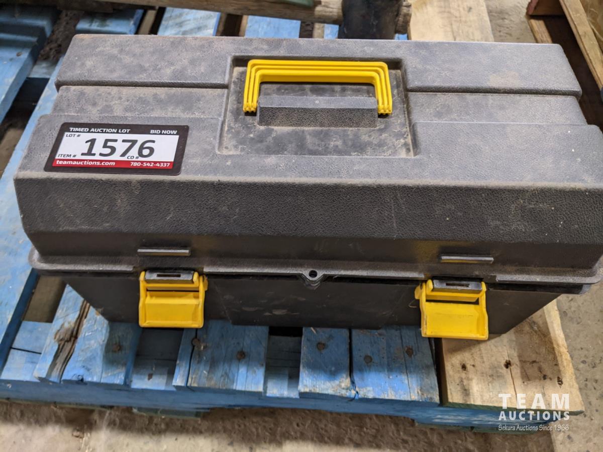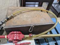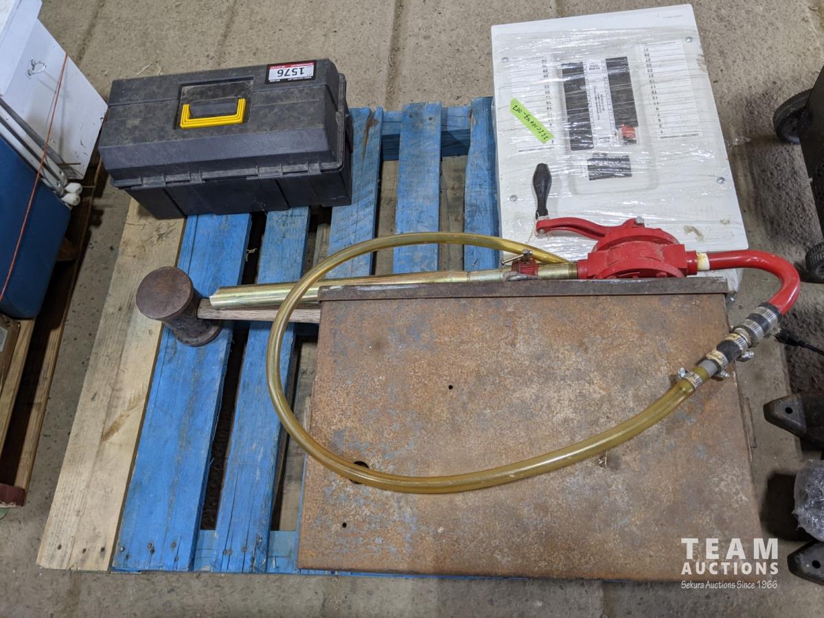 Toolbox with contents, (2) electrical panels, manual barrel pump, post maul, metal toolbox with contents