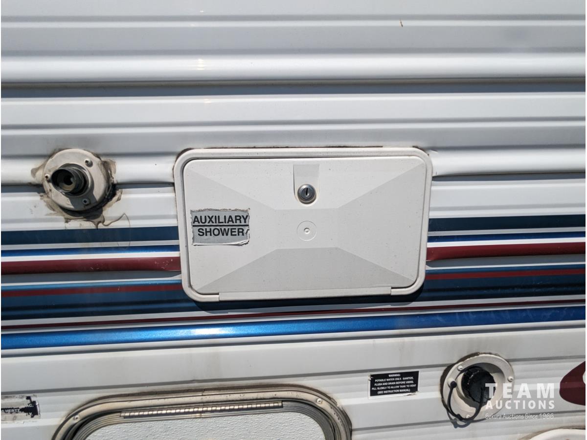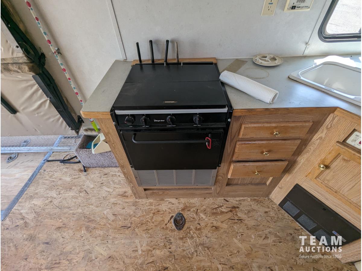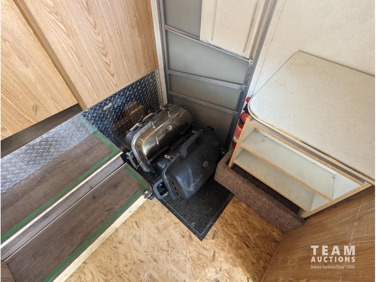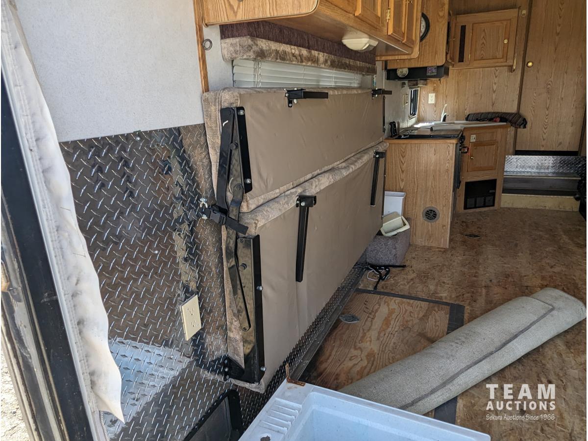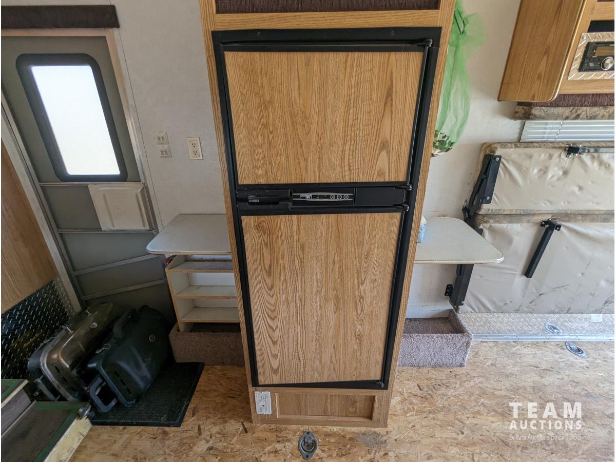 Fridge, freezer, stove, microwave, (2) portable BBQ's, (2) fold out beds in garage, bedroom with queen bed, bathroom w/shower, A/C heat, stereo, electric jack, awning, fold down garage door, 225/75R15 tires