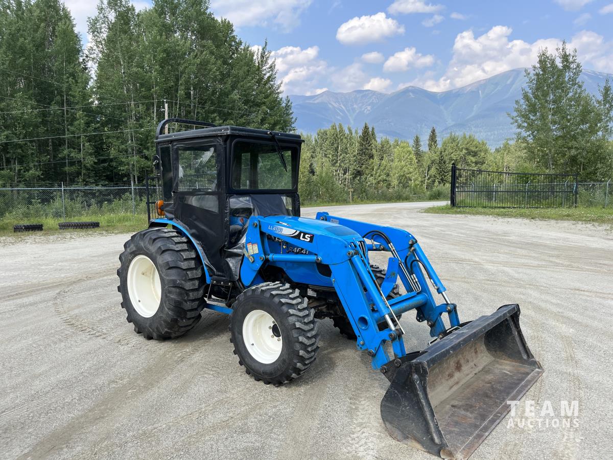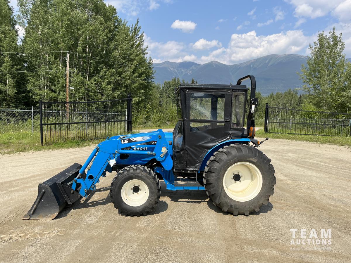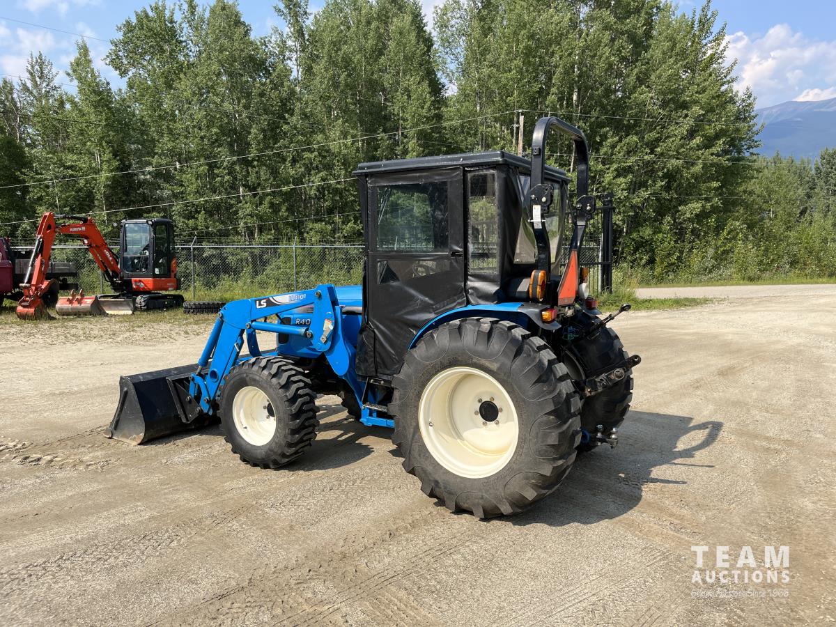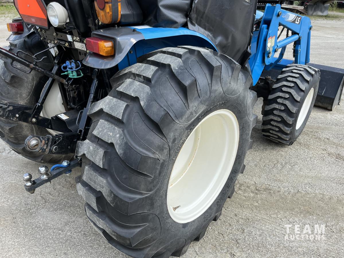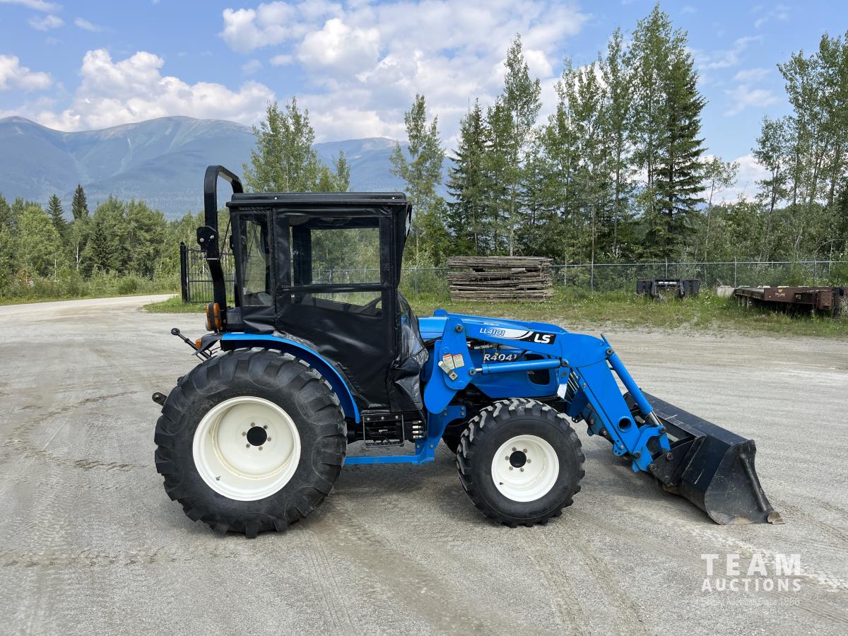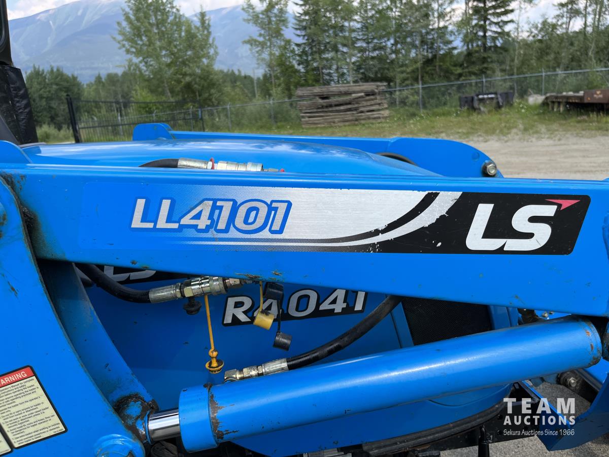 Ls LL4101 loader, Q/A, 72 inch bucket, Mitsibishi 2.5 L 4 cylinder 45 HP, diesel engine, 16 speed Synchro Shuttle manual transmission, , canvas cab, front hydraulic outlets, 540 PTO, 3 point hitch, 2 rear hydraulic outlets, 12-16.5 front tires, 17.5X24 rear tires