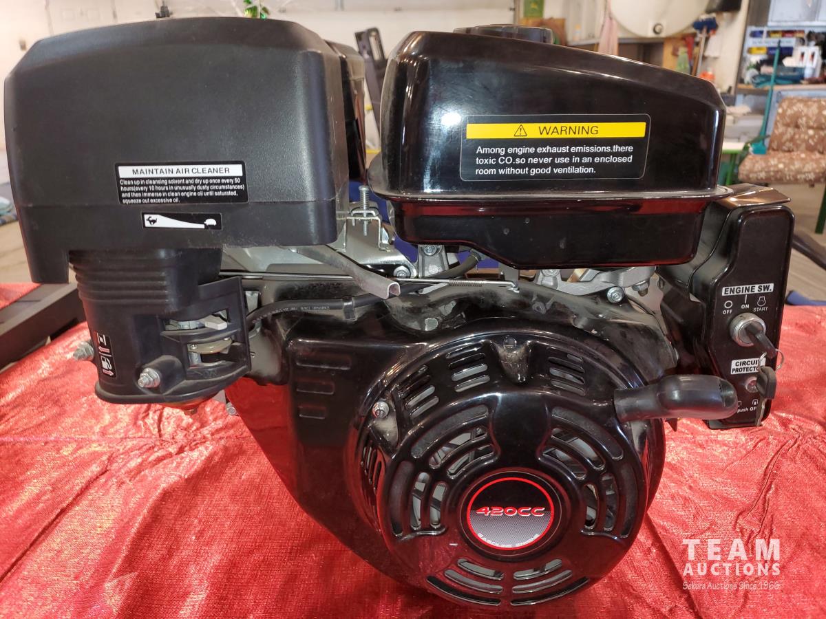 420 cc, 4 stroke OHV horizontal motor, air cooled, steel gas tank