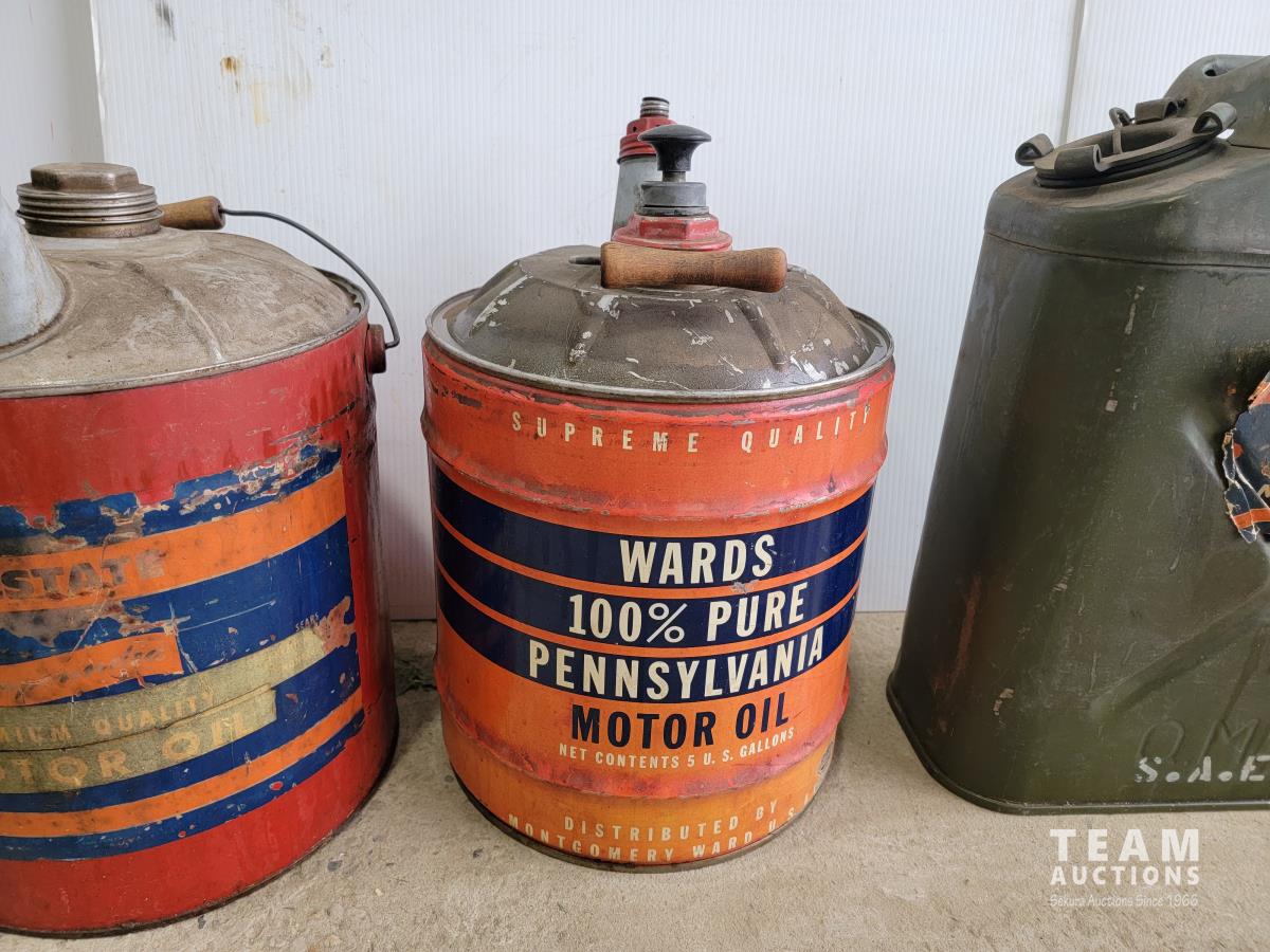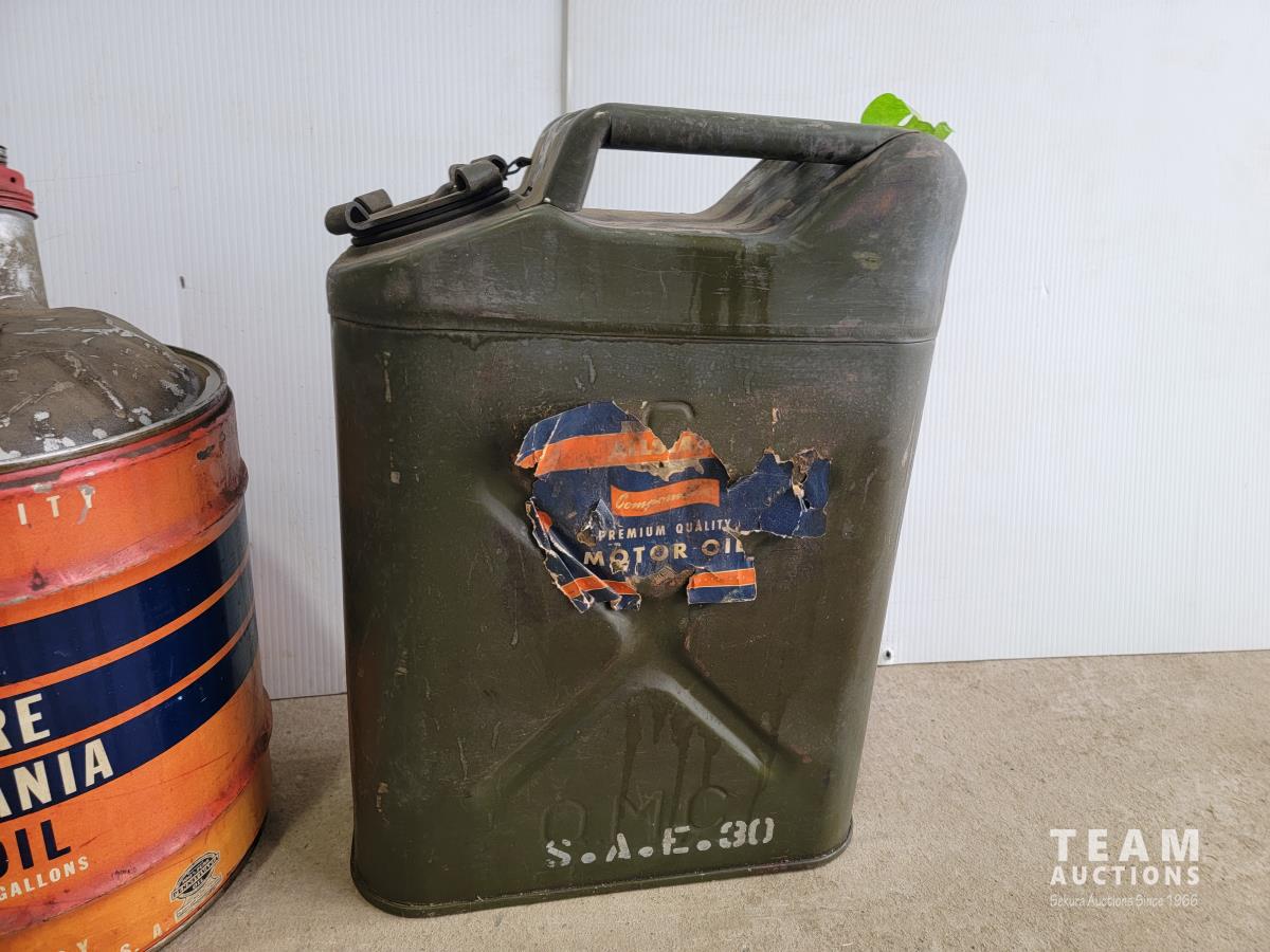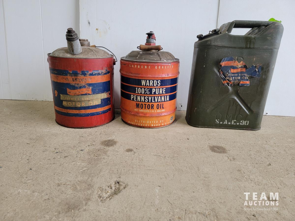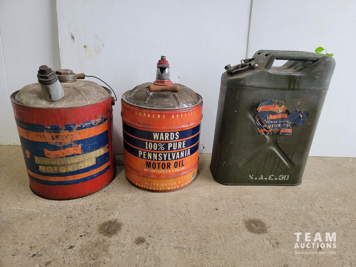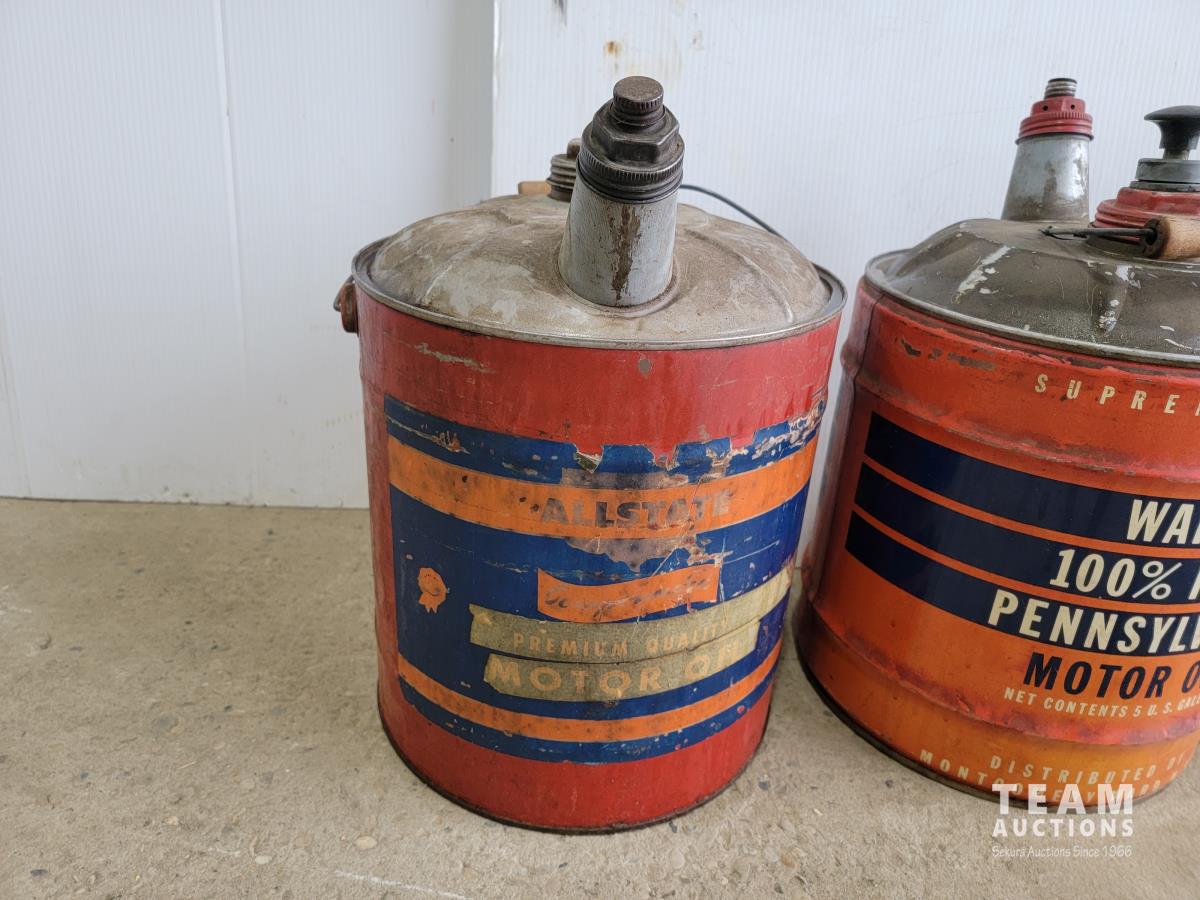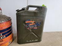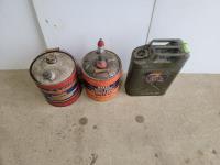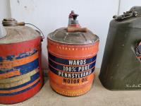 1257 (2) 5 Gallon Antique Oil Jugs and (1) Metal Motor Oil Can