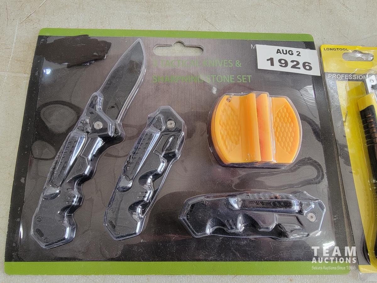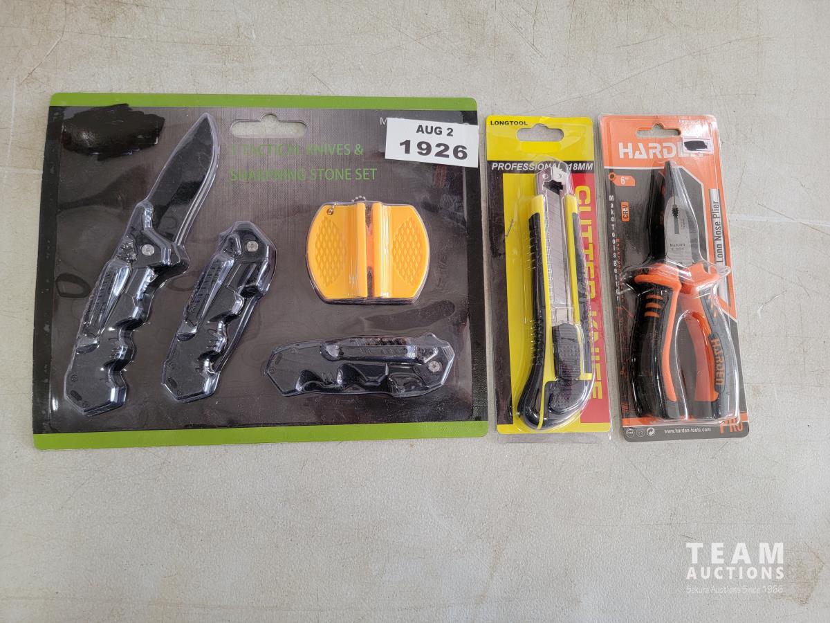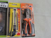 2063 (3) Tactical Knives & Sharpening Tool, Cutter Knife and Harden Pro Long Nose Plier (Unused)