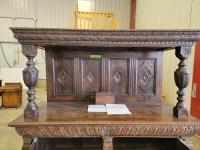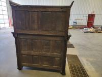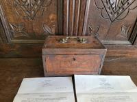59 inch l x 26 inch d x 73 inch h cupboard was produced 1558-1603 England, tea caddy is late 18th century England/France, both tea liners are missing