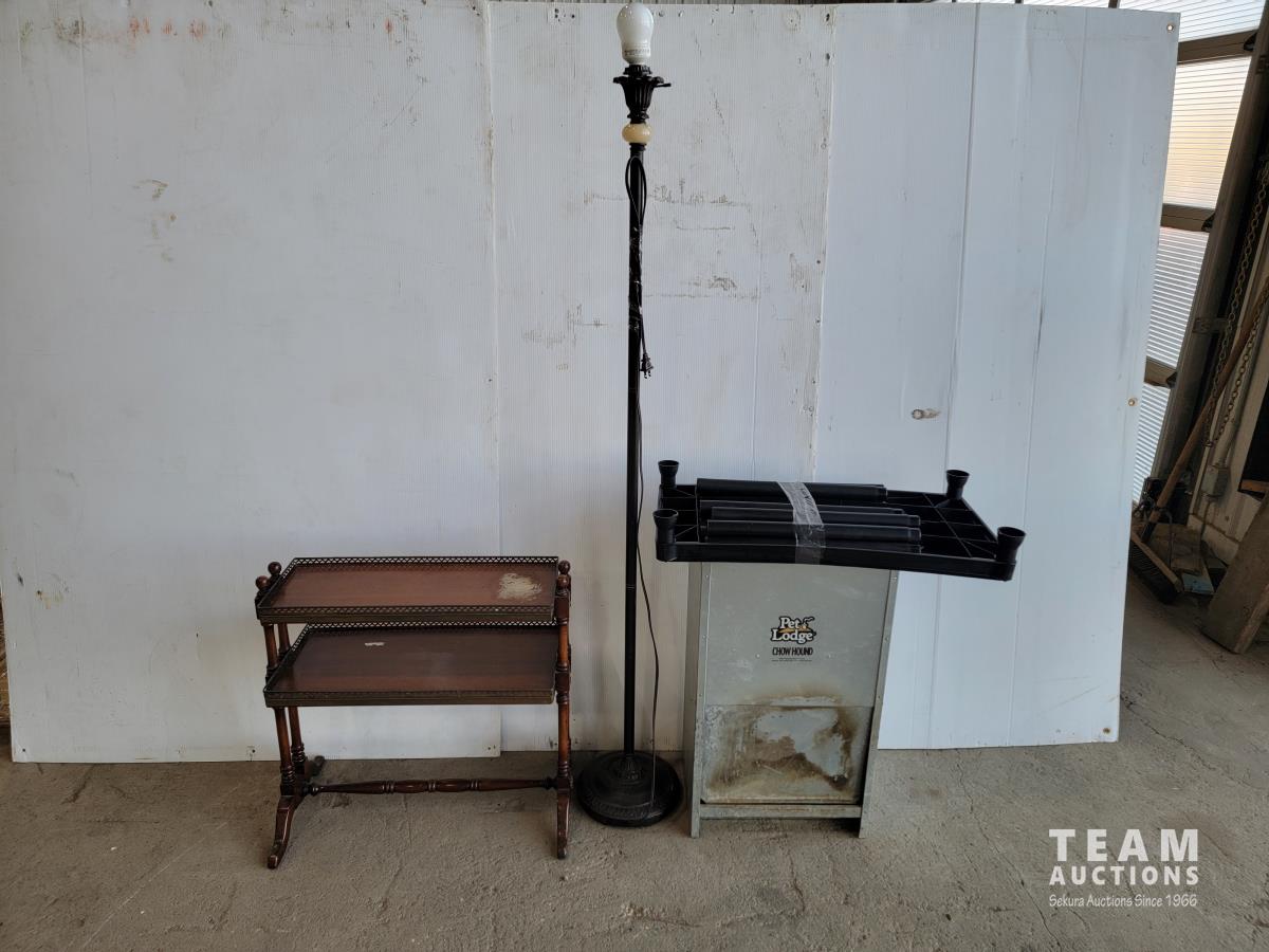 1296 Large Chow Hound Pet Feeder, Lamp, 2 Shelf End Table and Small Plastic Shelf