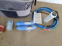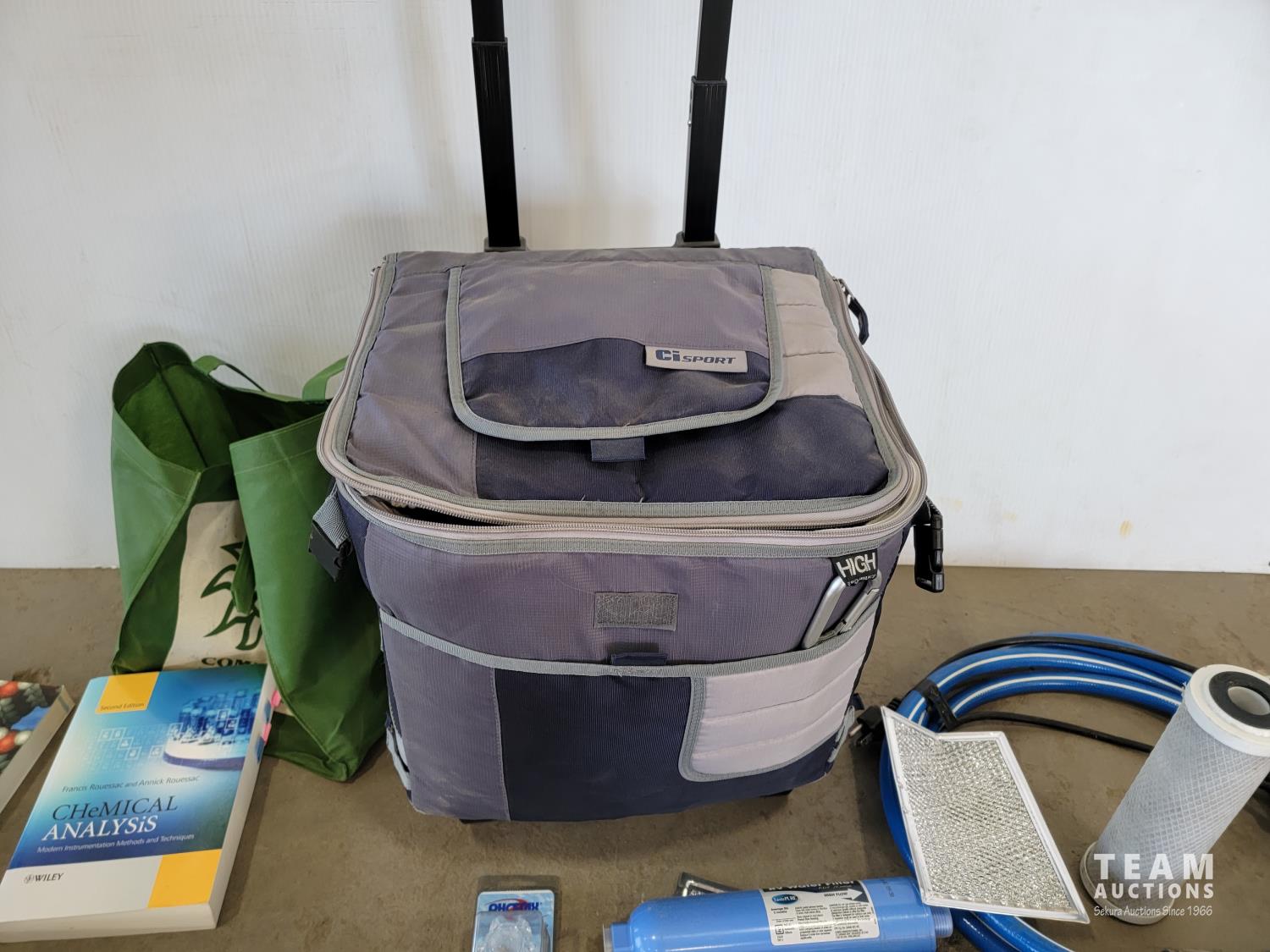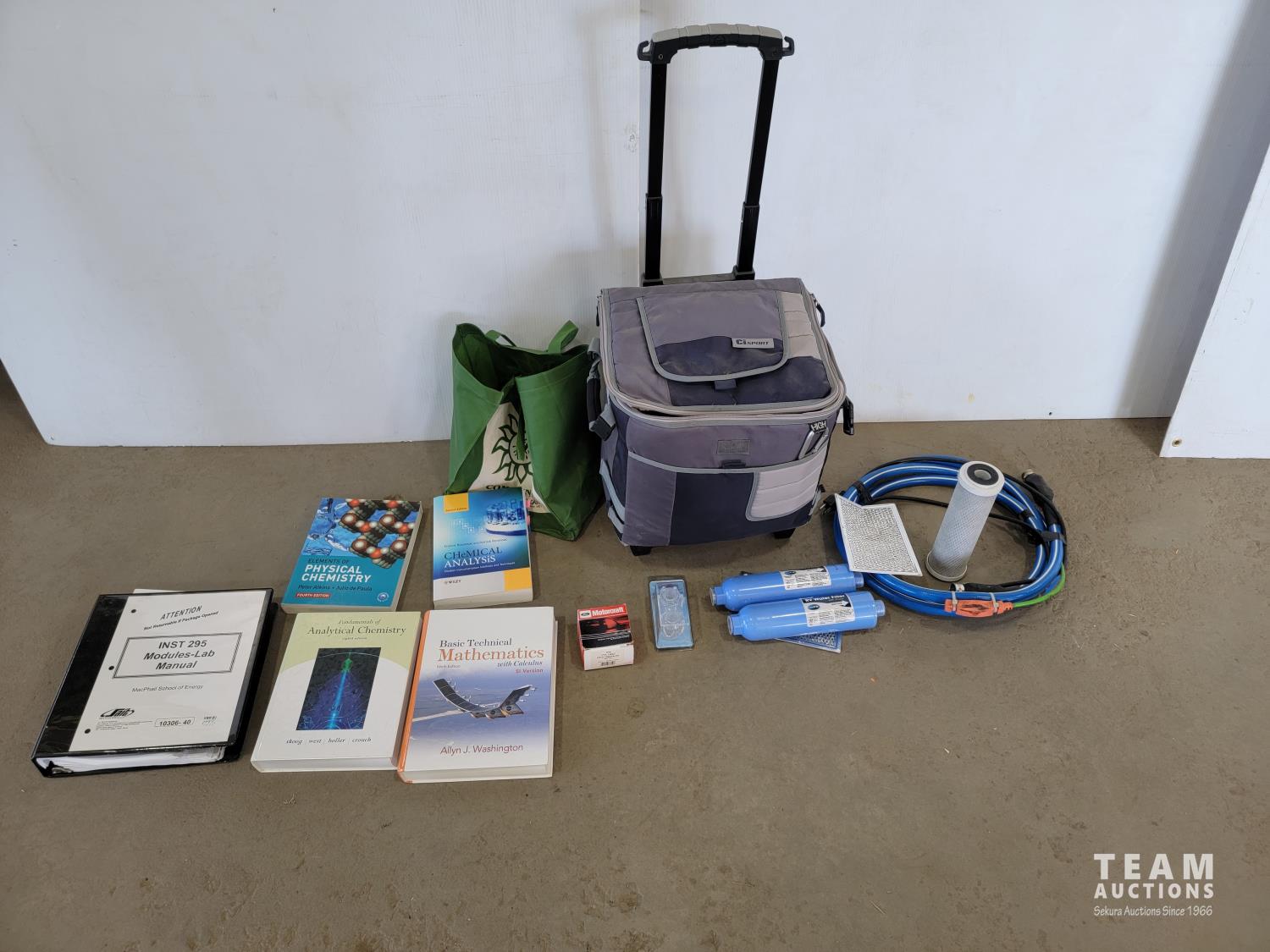 RV water filters, chemistry and math text books, pull behind cooler