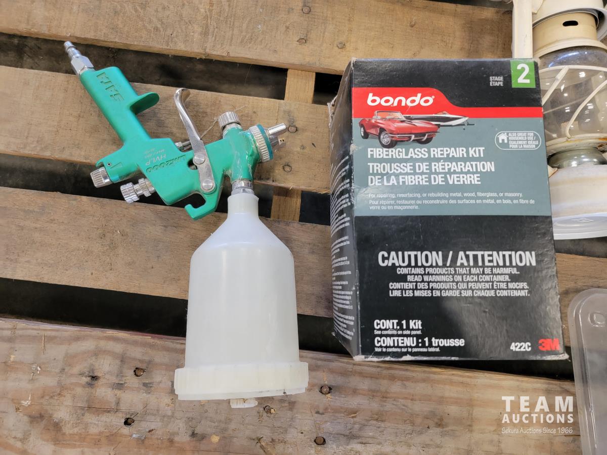 Lantern, (2) paint sprayers, mask, fiberglass repair kit