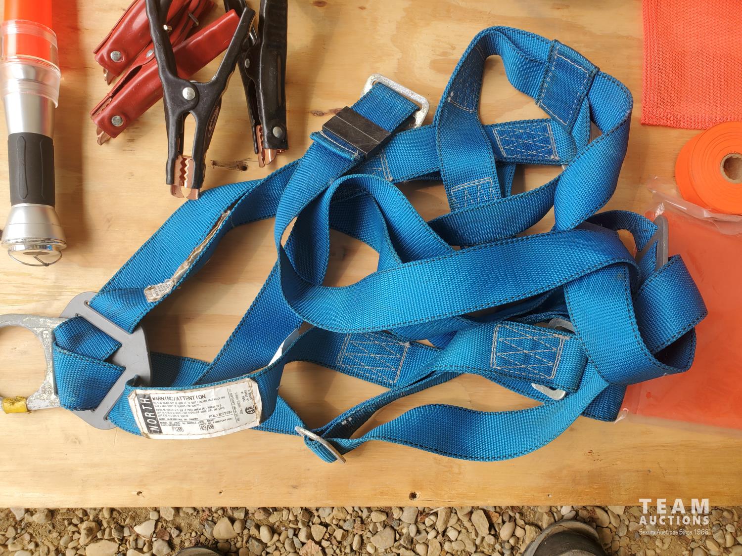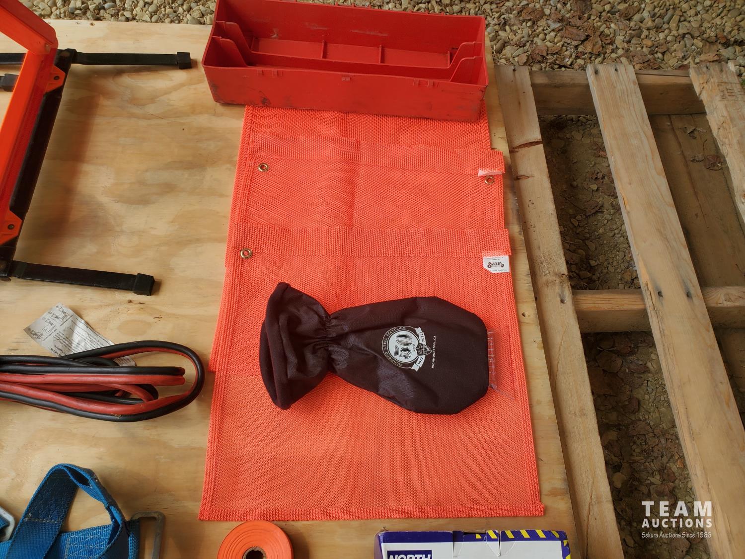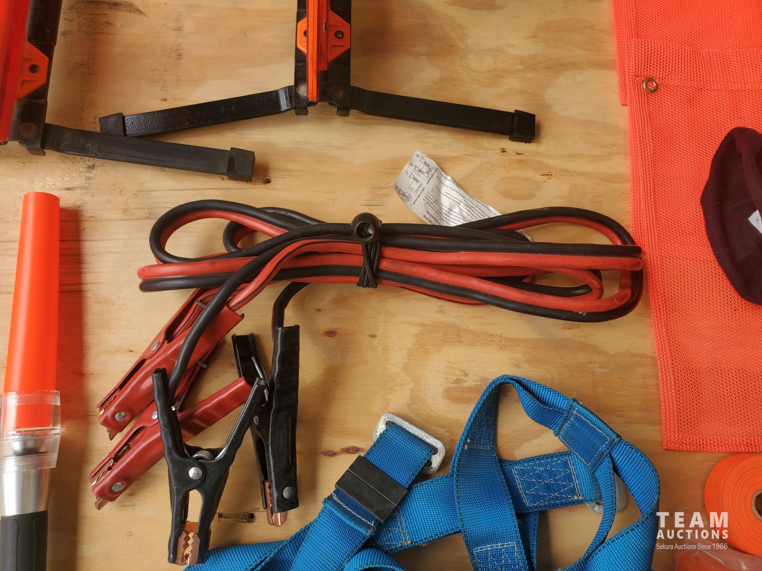 Triangle warning kit, (2) flares, Warning Flashlight, (4) Polyester Safety Flag with Waterproof Coating PE Mesh Orange 16 inch X 16 inch, Roll of Red Warning Tape, Roll of Barrier Warning Tape, Bag of Disposable Plastic Flags, (5) Hard Hats, Ear Muff, Set of Booster Cables, Safety Harness, Winter Mitt Ice Scraper
