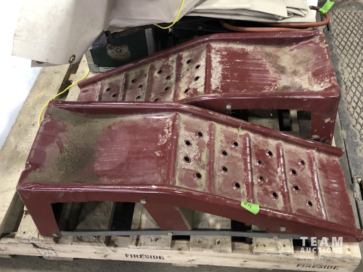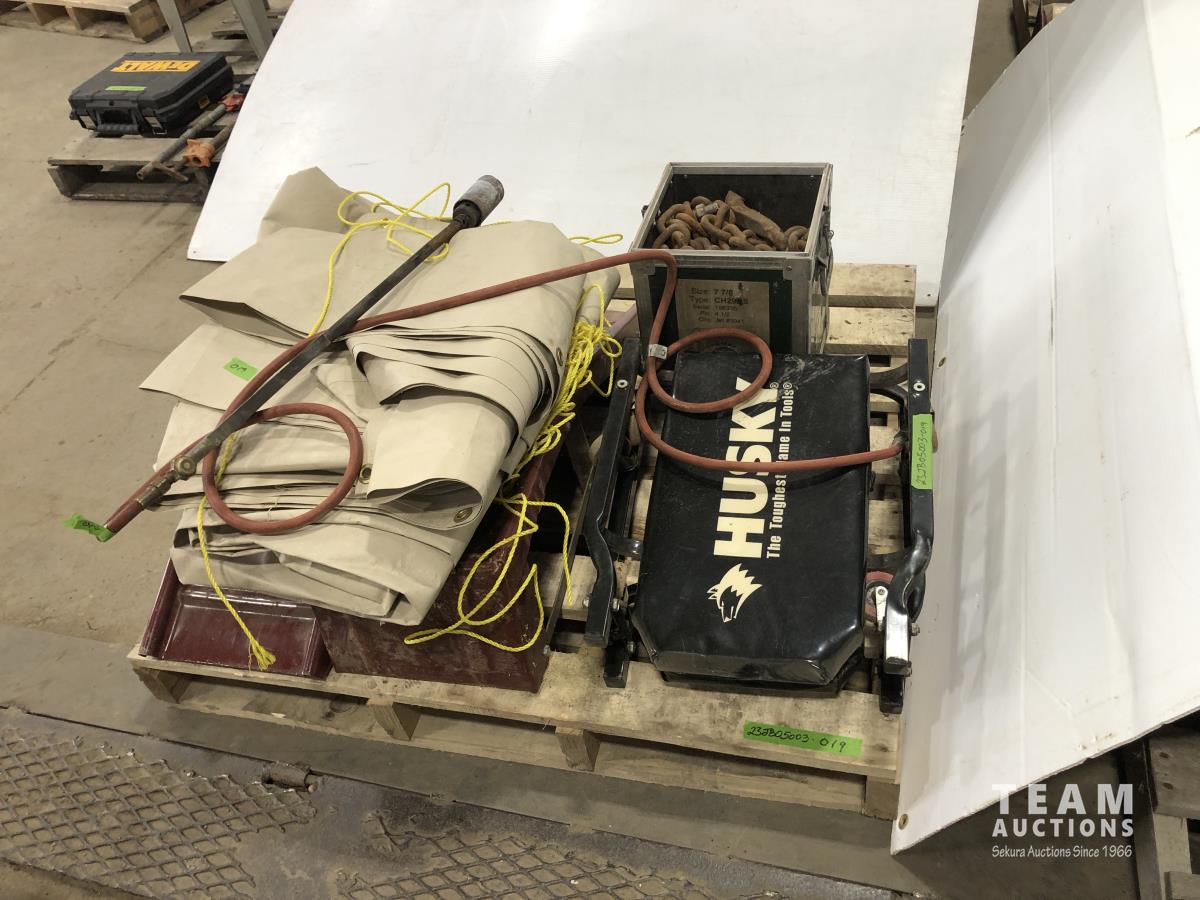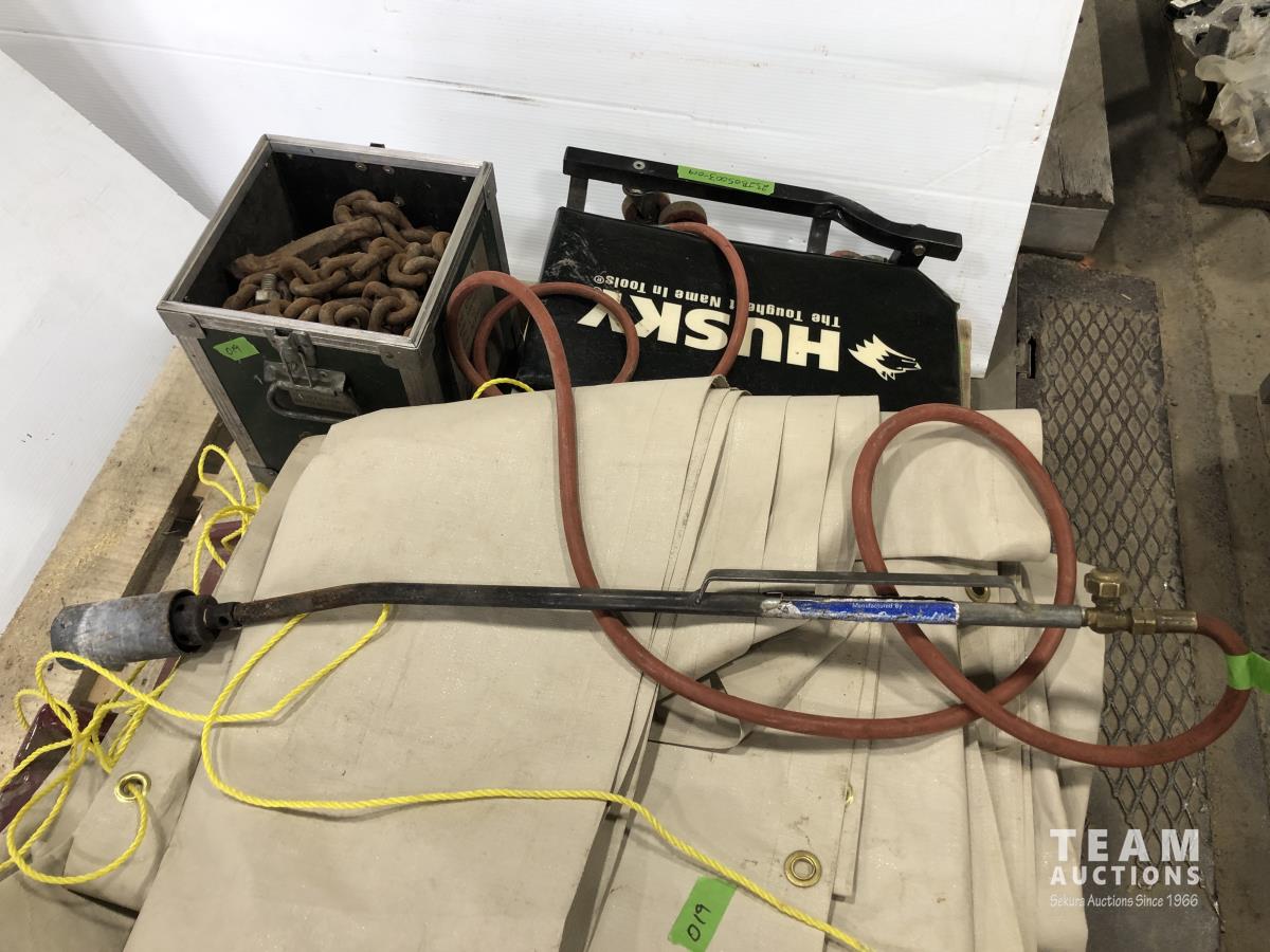 Husky mechanics creeper, propane torch, tarp, length of chain, metal car ramps