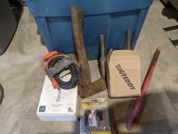Sawzall, pipe cutter, tire pumps, survival poncho, booster, extension cord, axe
