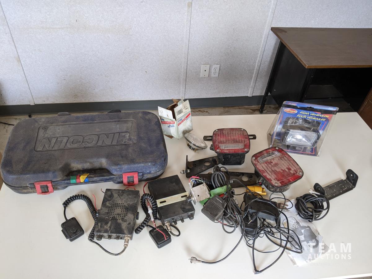 Lincoln grease gun, (2) batteries, (1) charger, various CB radios, trailer lights
