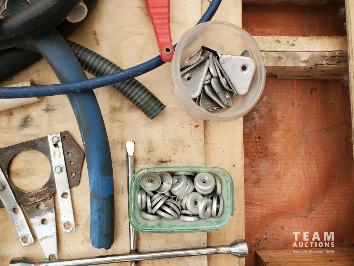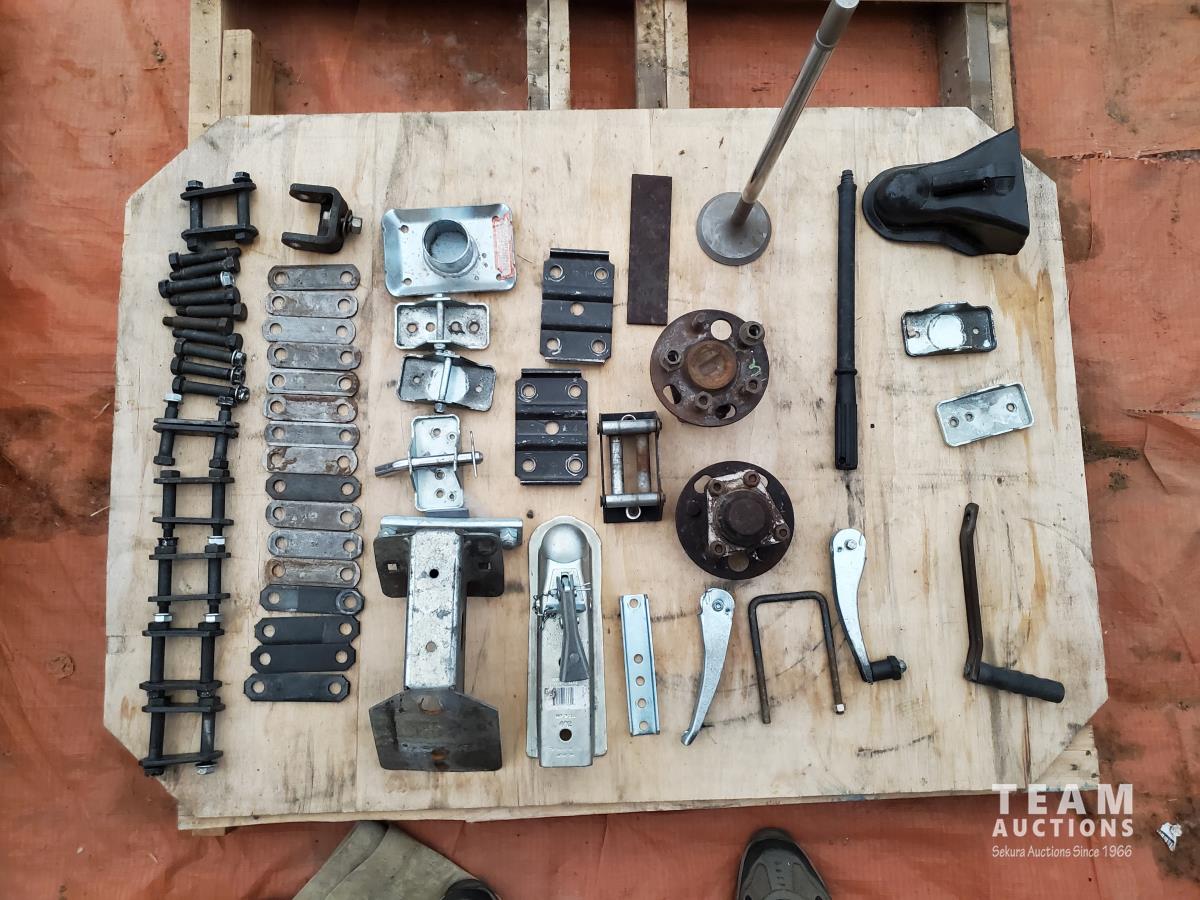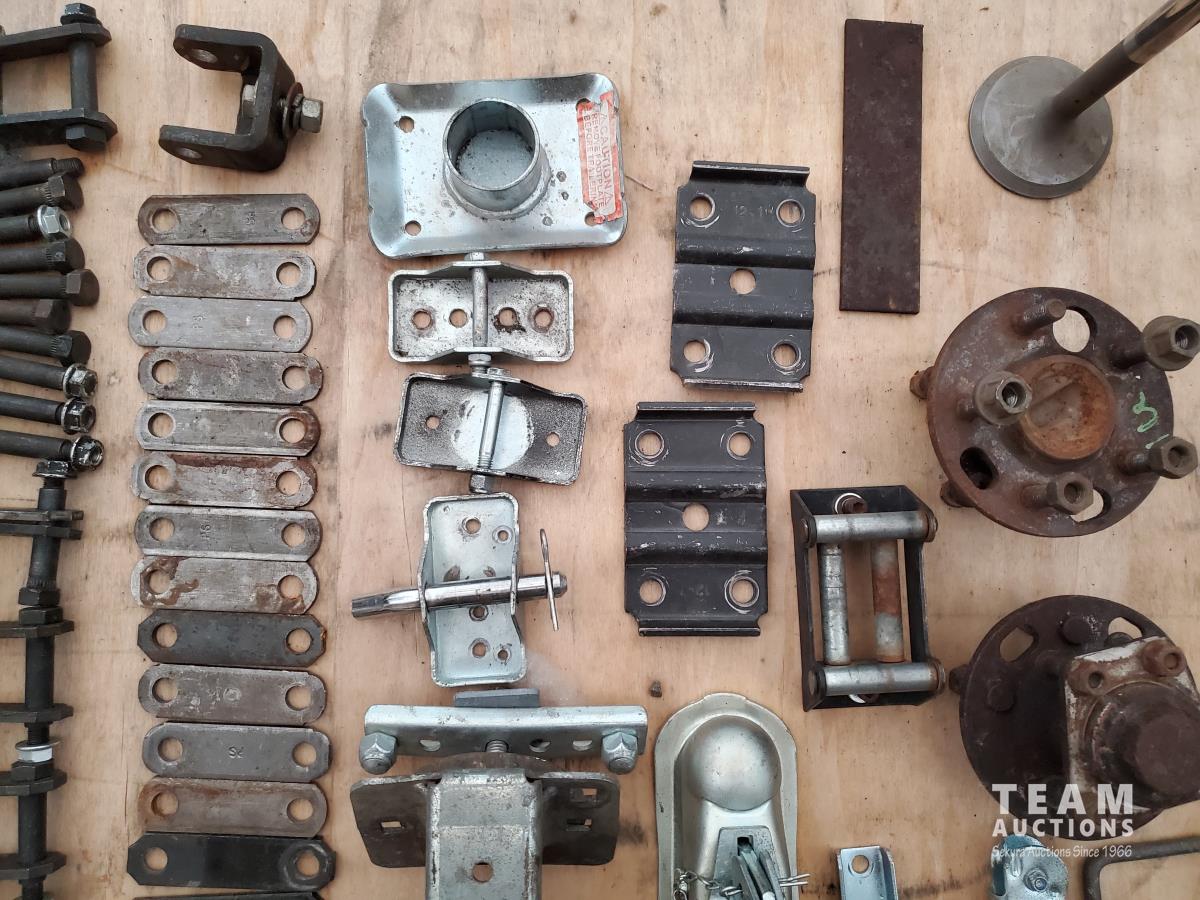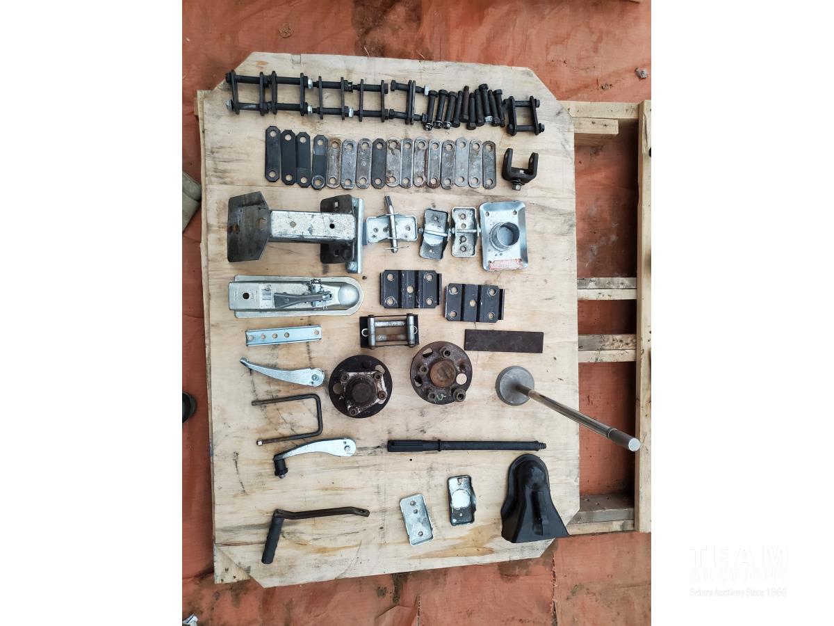 2 inch Ball Coupler, Spare tire Mount, (16) Trailer Shackle Straps, (10) Shackle Bolts, (6) Sets of Shackles & Bolts, (6) Trailer Jack Feet, (2) Trailer Hub Assemblies, Winch Fairlead, Jack Handles, Small Engine Valve, AMMCO Antique Pneumatic Bearing Packer, (2) Winch Cables, (3) Pillow Blocks, Assorted Lengths Heater & PVC Hoses, (5) Wheel Chocks, Reese 7000 lb Ball Mount, 4-Way Wheel Wrench, Assorted Aluminum Fender Washers, (2) Bundles of 3-2/3 inch × 9 inch sandpaper