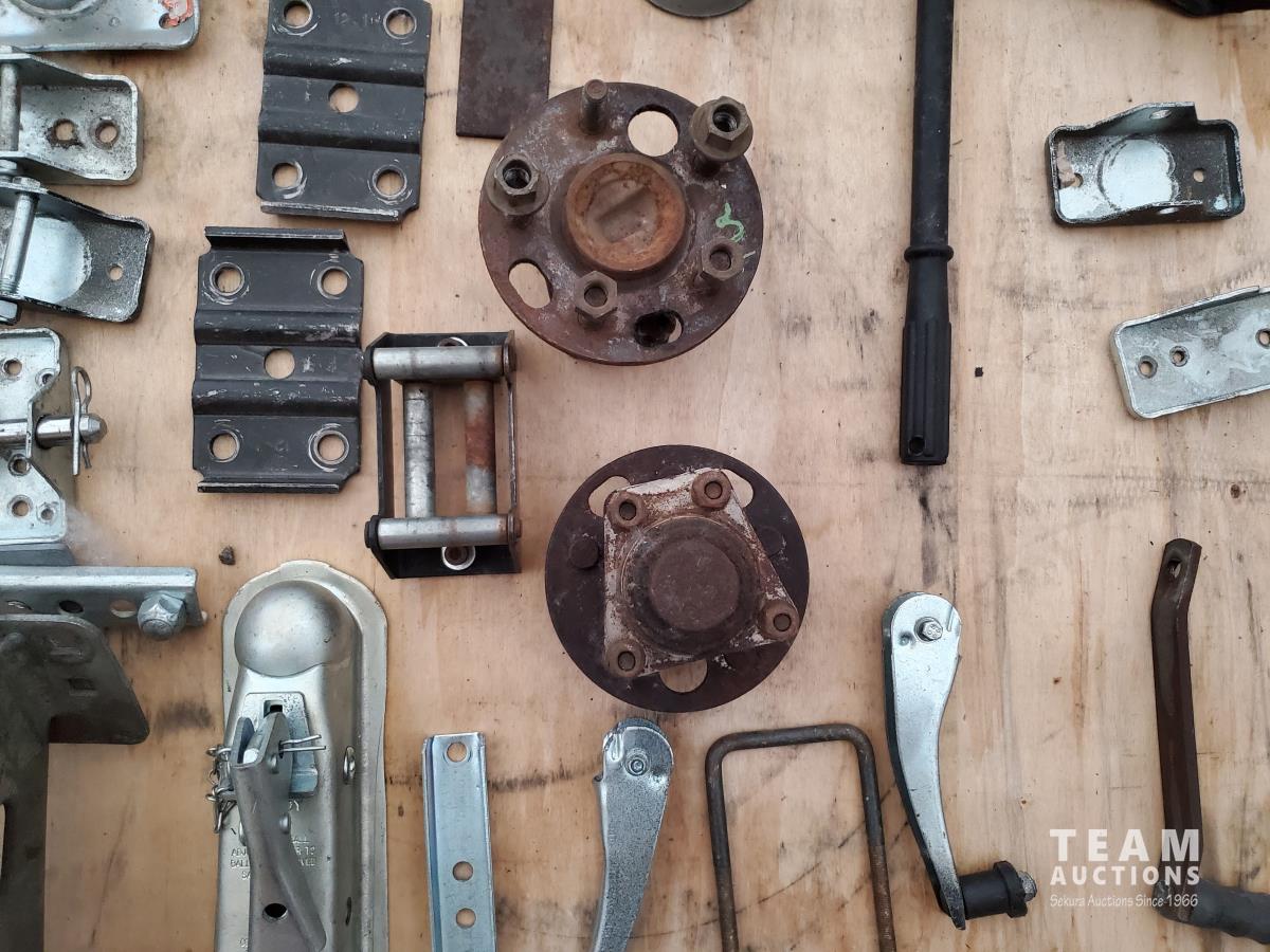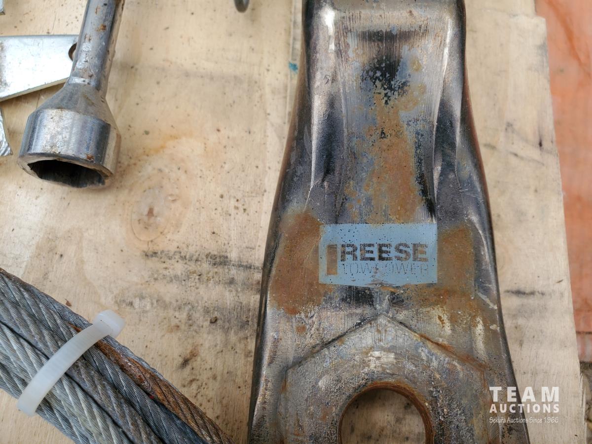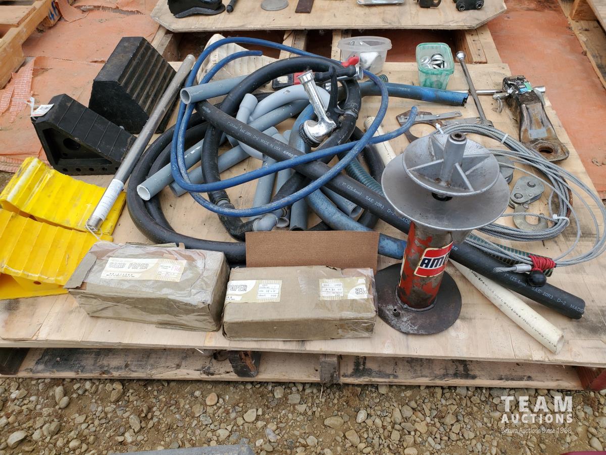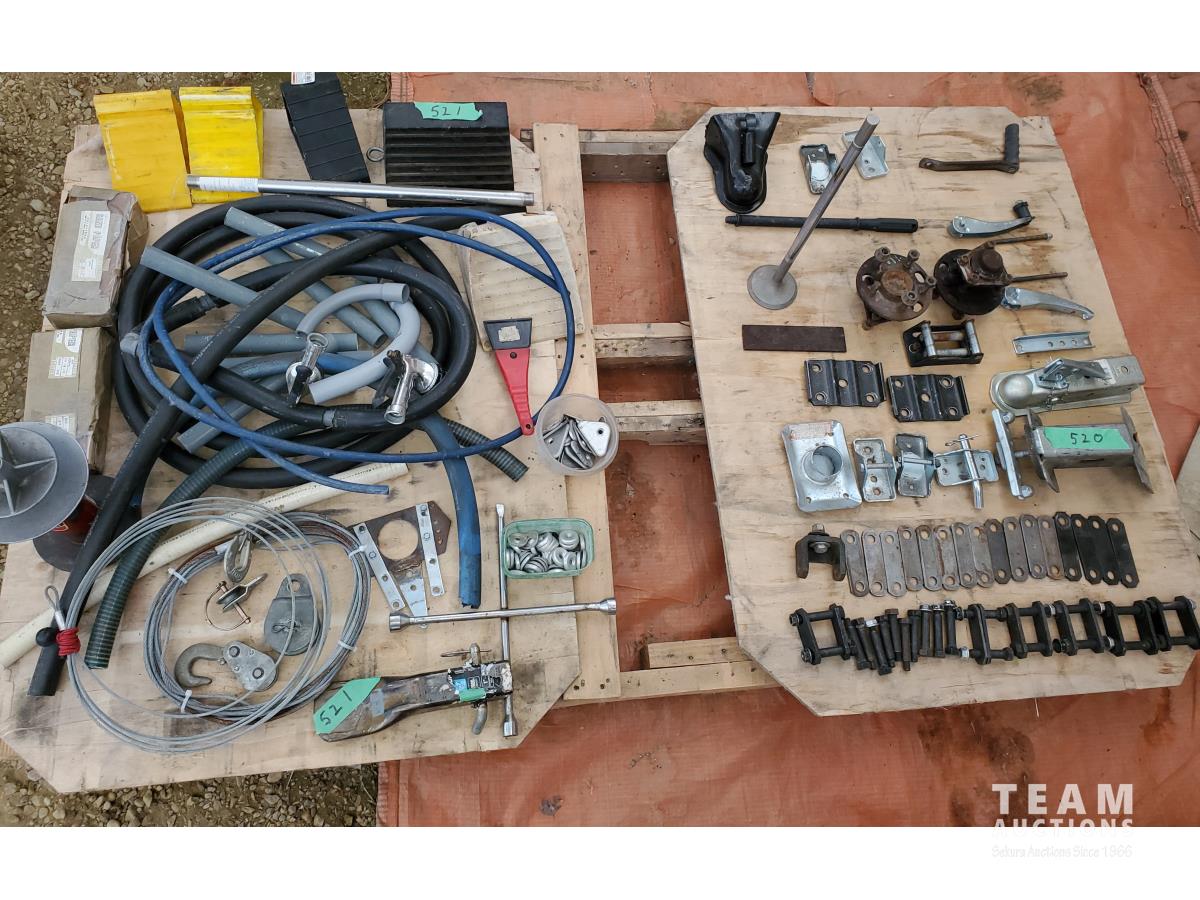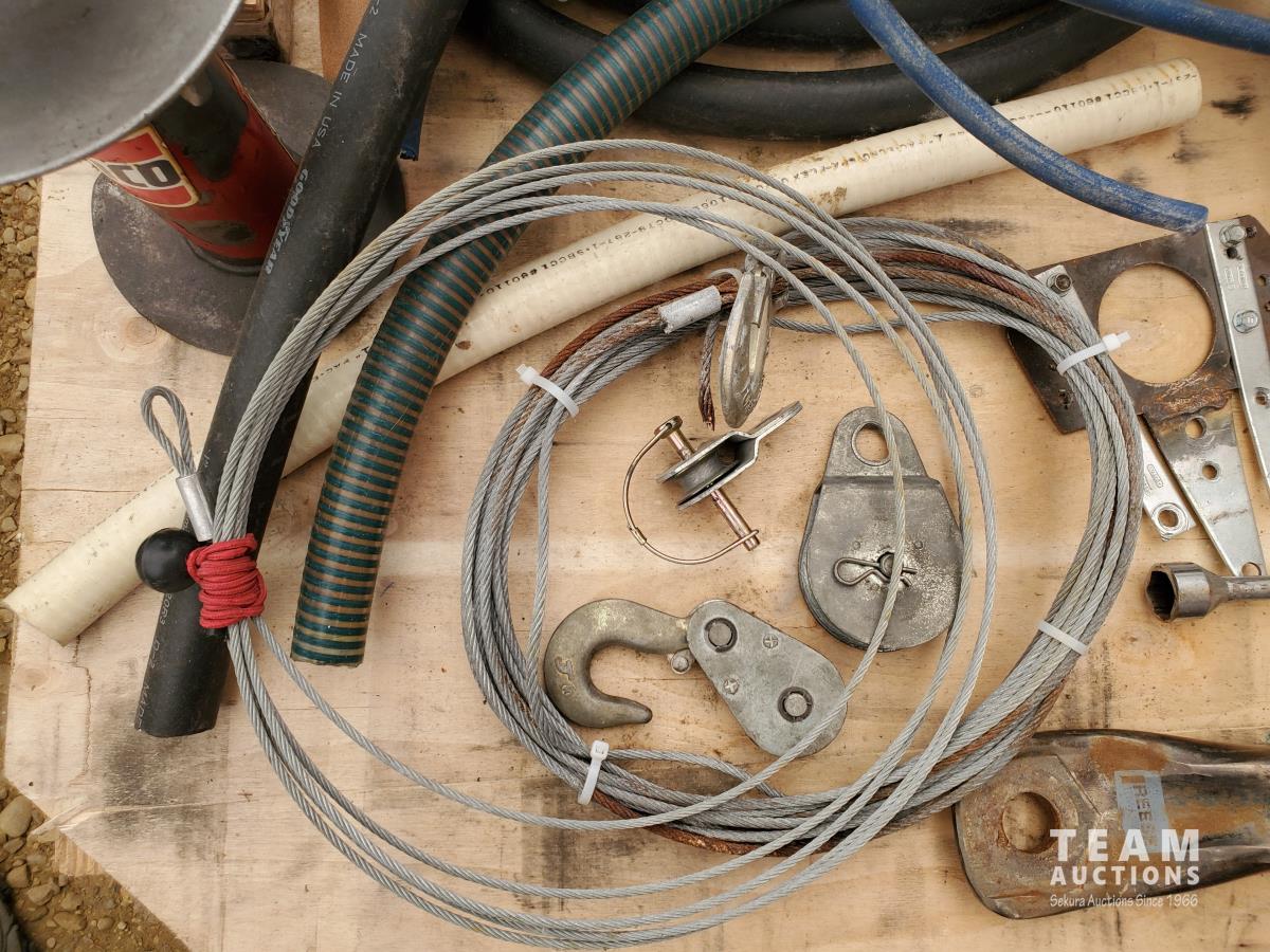 2 inch Ball Coupler, Spare tire Mount, (16) Trailer Shackle Straps, (10) Shackle Bolts, (6) Sets of Shackles & Bolts, (6) Trailer Jack Feet, (2) Trailer Hub Assemblies, Winch Fairlead, Jack Handles, Small Engine Valve, AMMCO Antique Pneumatic Bearing Packer, (2) Winch Cables, (3) Pillow Blocks, Assorted Lengths Heater & PVC Hoses, (5) Wheel Chocks, Reese 7000 lb Ball Mount, 4-Way Wheel Wrench, Assorted Aluminum Fender Washers, (2) Bundles of 3-2/3 inch × 9 inch sandpaper