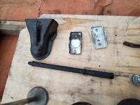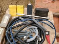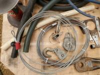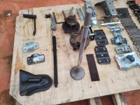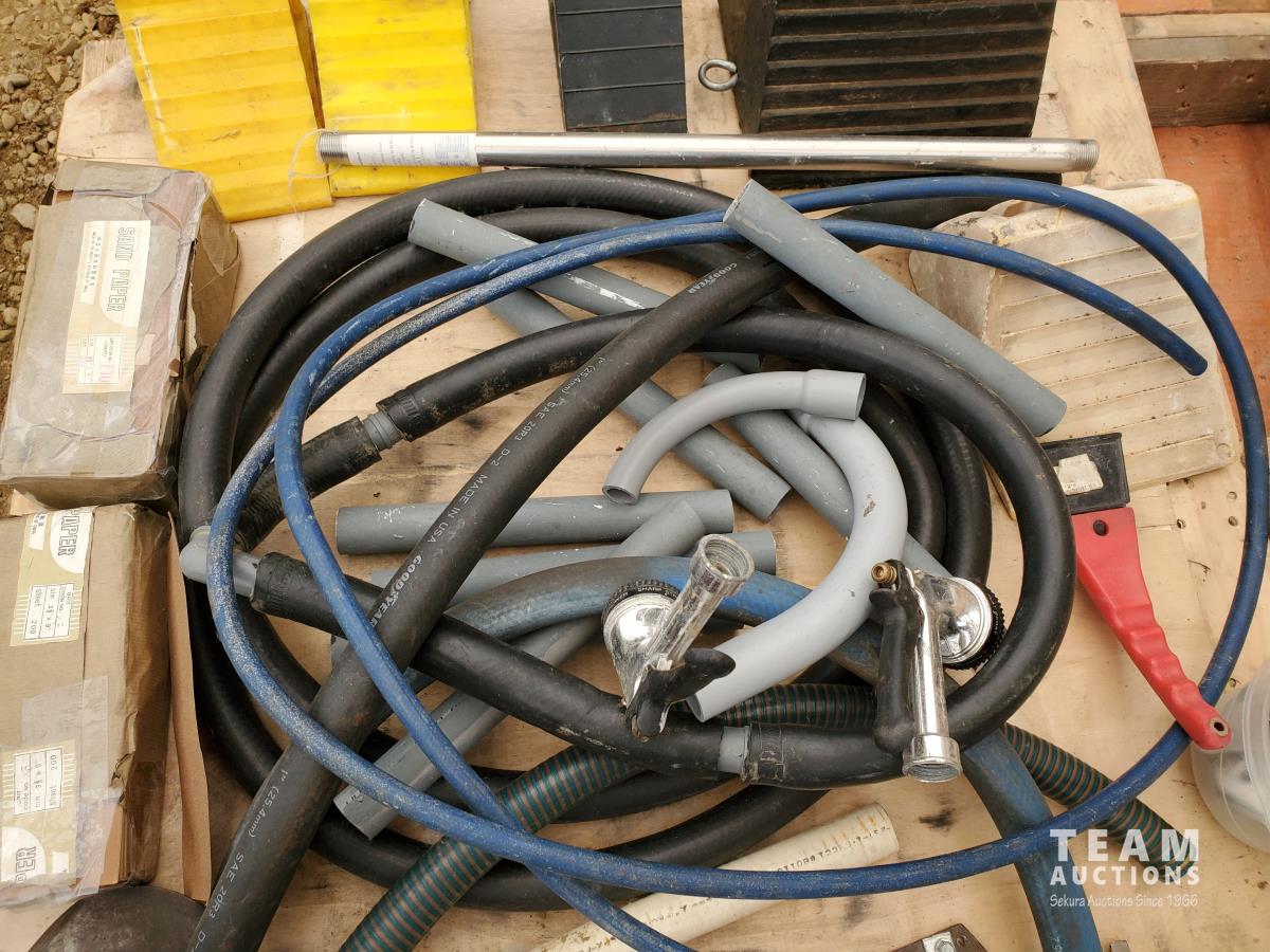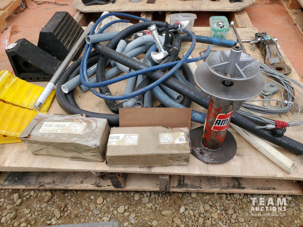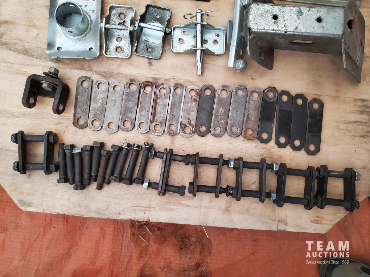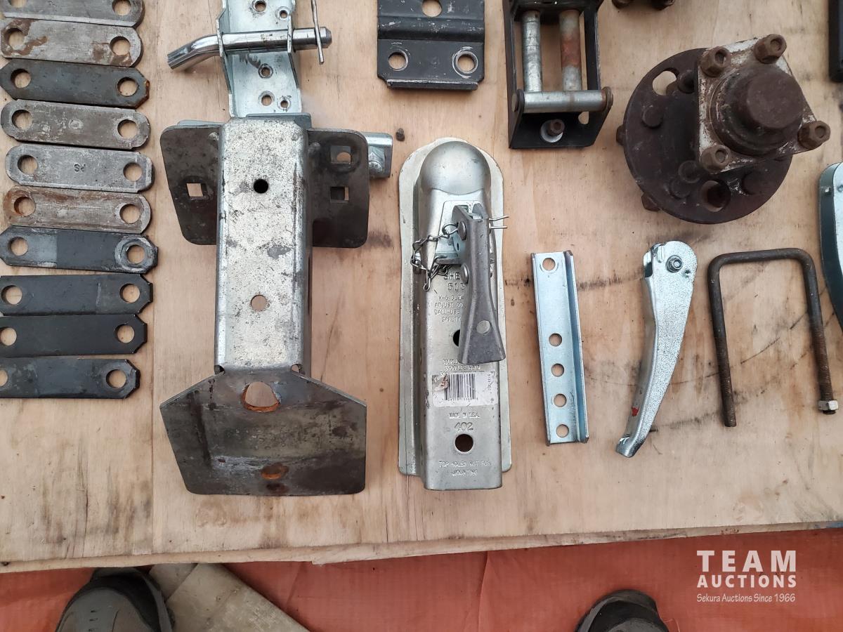 2 inch Ball Coupler, Spare tire Mount, (16) Trailer Shackle Straps, (10) Shackle Bolts, (6) Sets of Shackles & Bolts, (6) Trailer Jack Feet, (2) Trailer Hub Assemblies, Winch Fairlead, Jack Handles, Small Engine Valve, AMMCO Antique Pneumatic Bearing Packer, (2) Winch Cables, (3) Pillow Blocks, Assorted Lengths Heater & PVC Hoses, (5) Wheel Chocks, Reese 7000 lb Ball Mount, 4-Way Wheel Wrench, Assorted Aluminum Fender Washers, (2) Bundles of 3-2/3 inch × 9 inch sandpaper