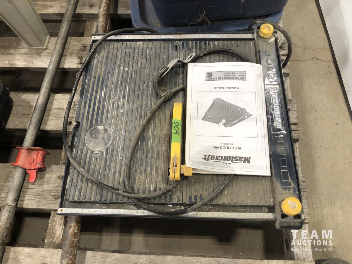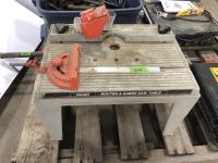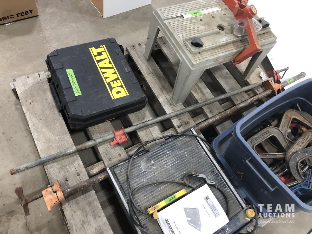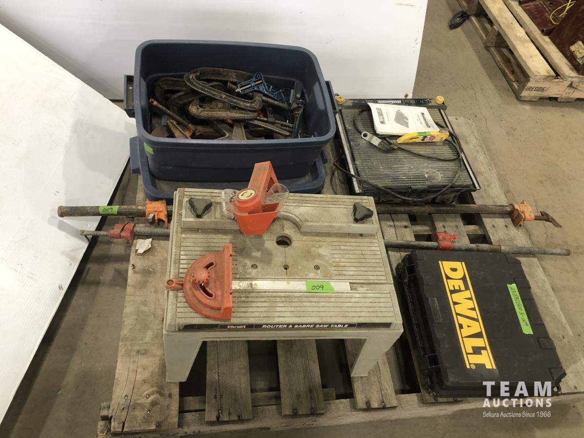 Qty of clamps various sizes, Dewalt 12v cordless drill and charger, Hirsh bench router table and mastercraft wet tile cutter