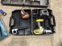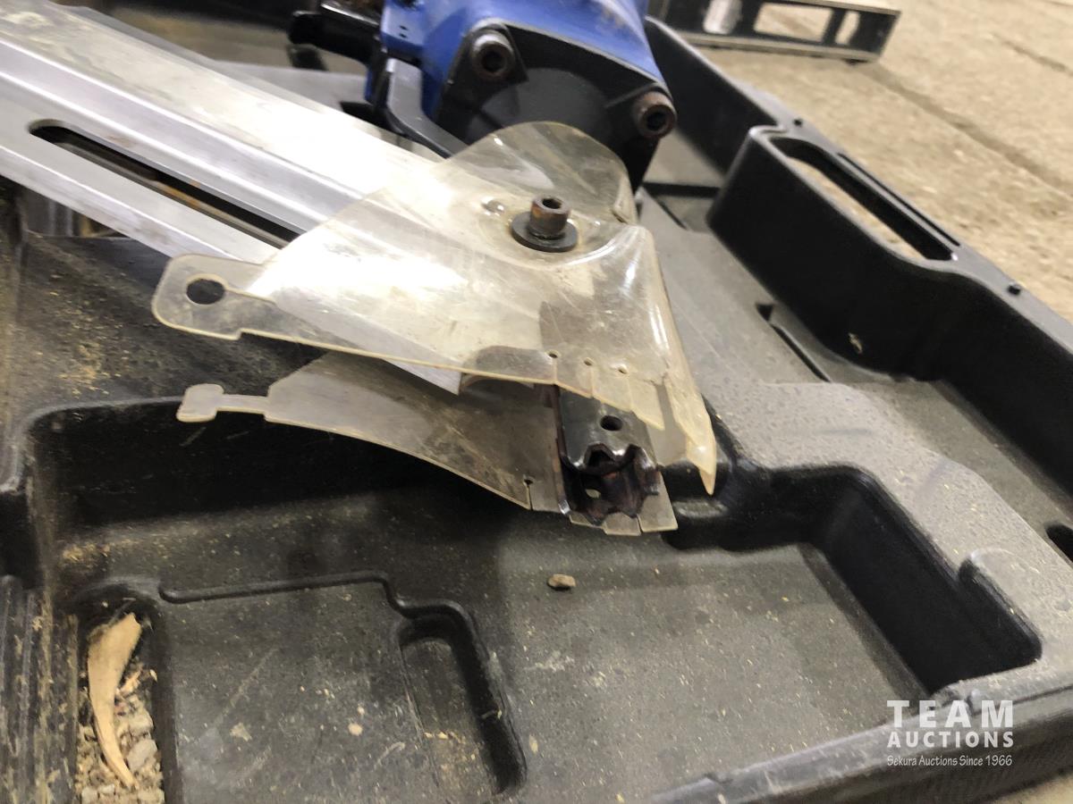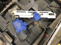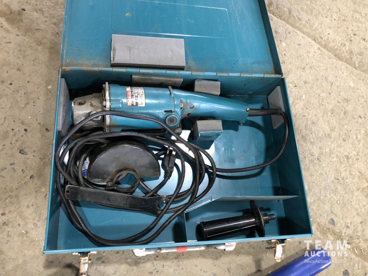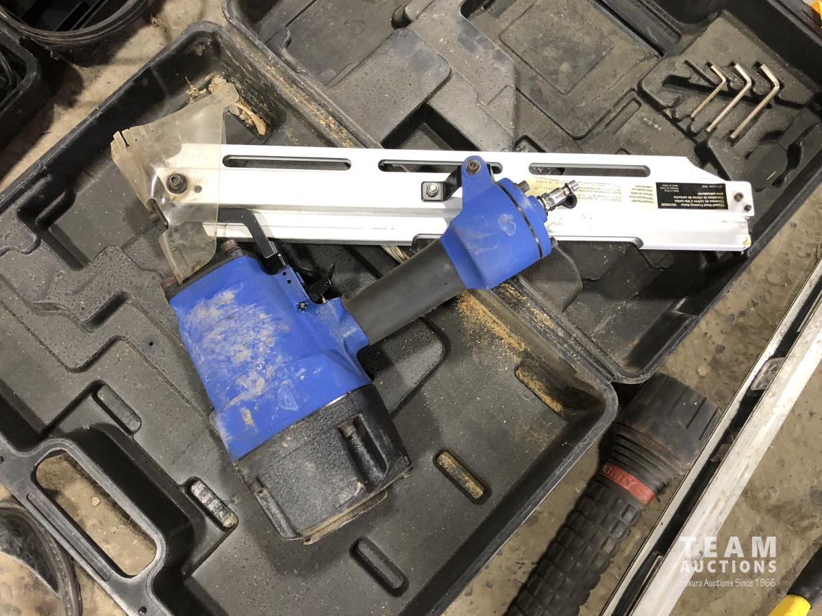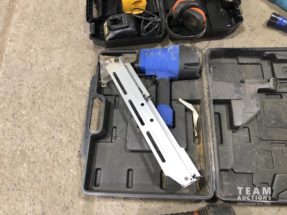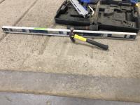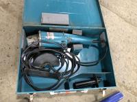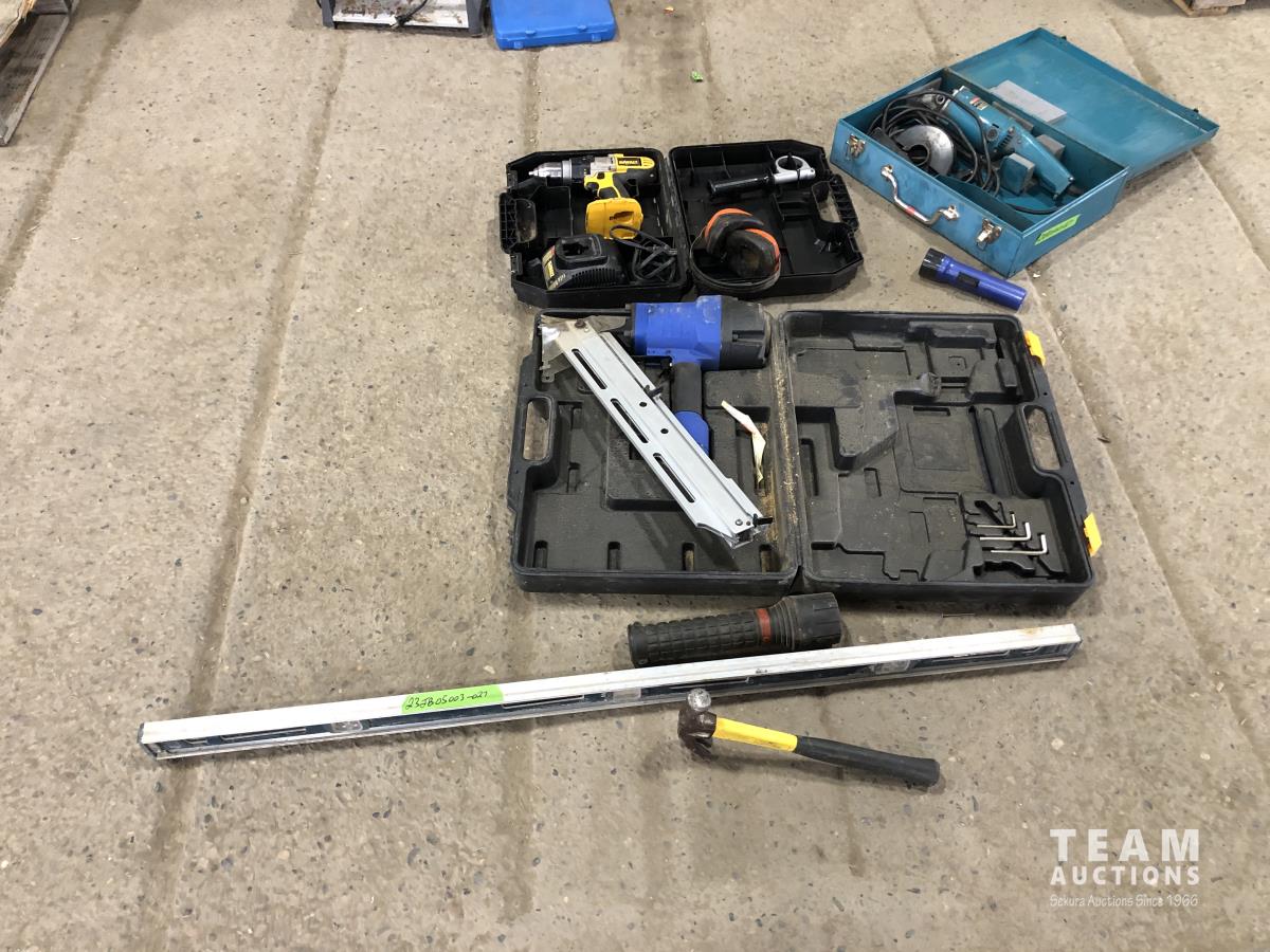 4 ft level, Dewalt cordless drill and charger (no battery), Campbell Hausfeld air nailer, Makita 5 inch disc grinder, hand tools