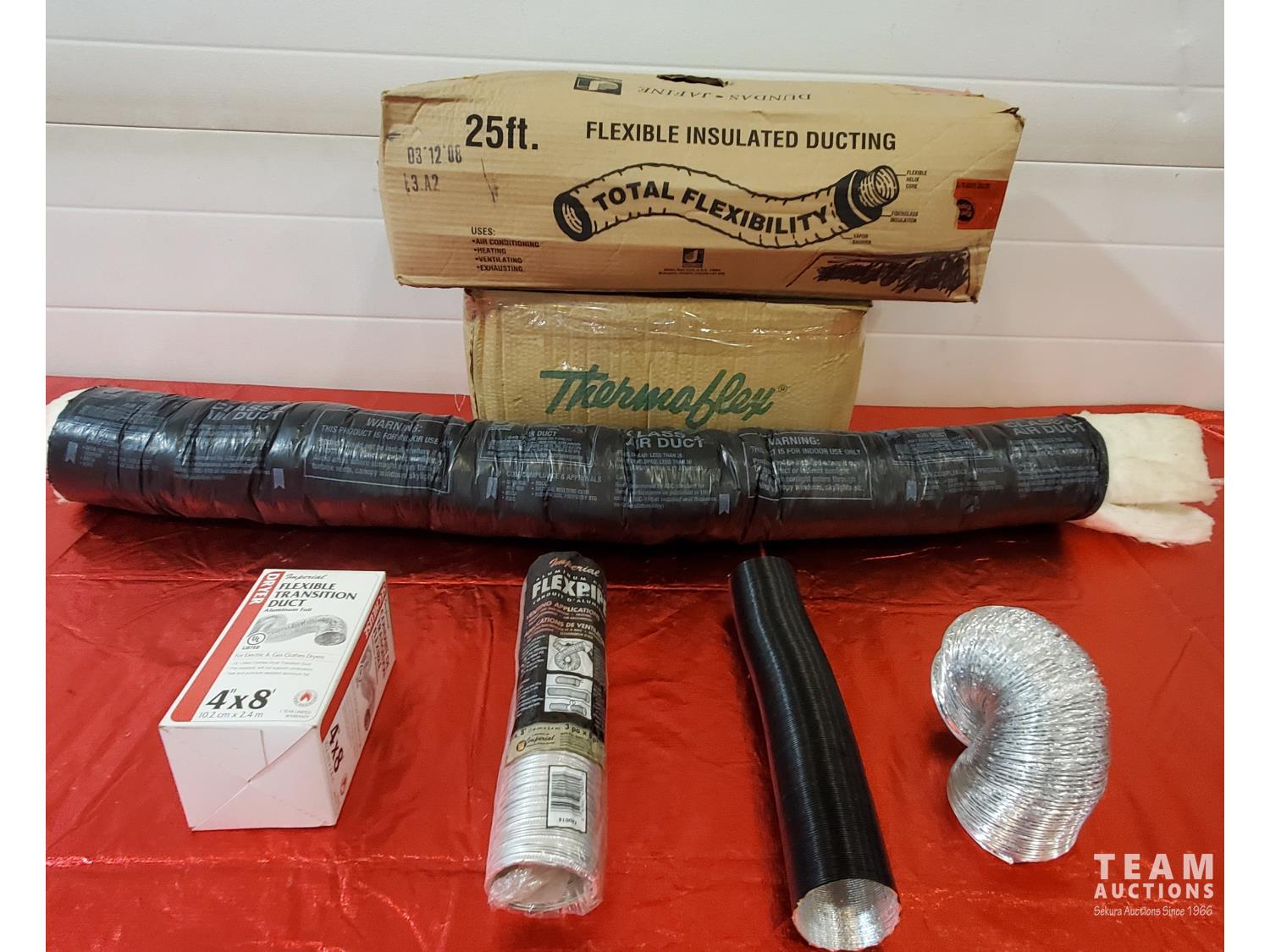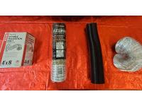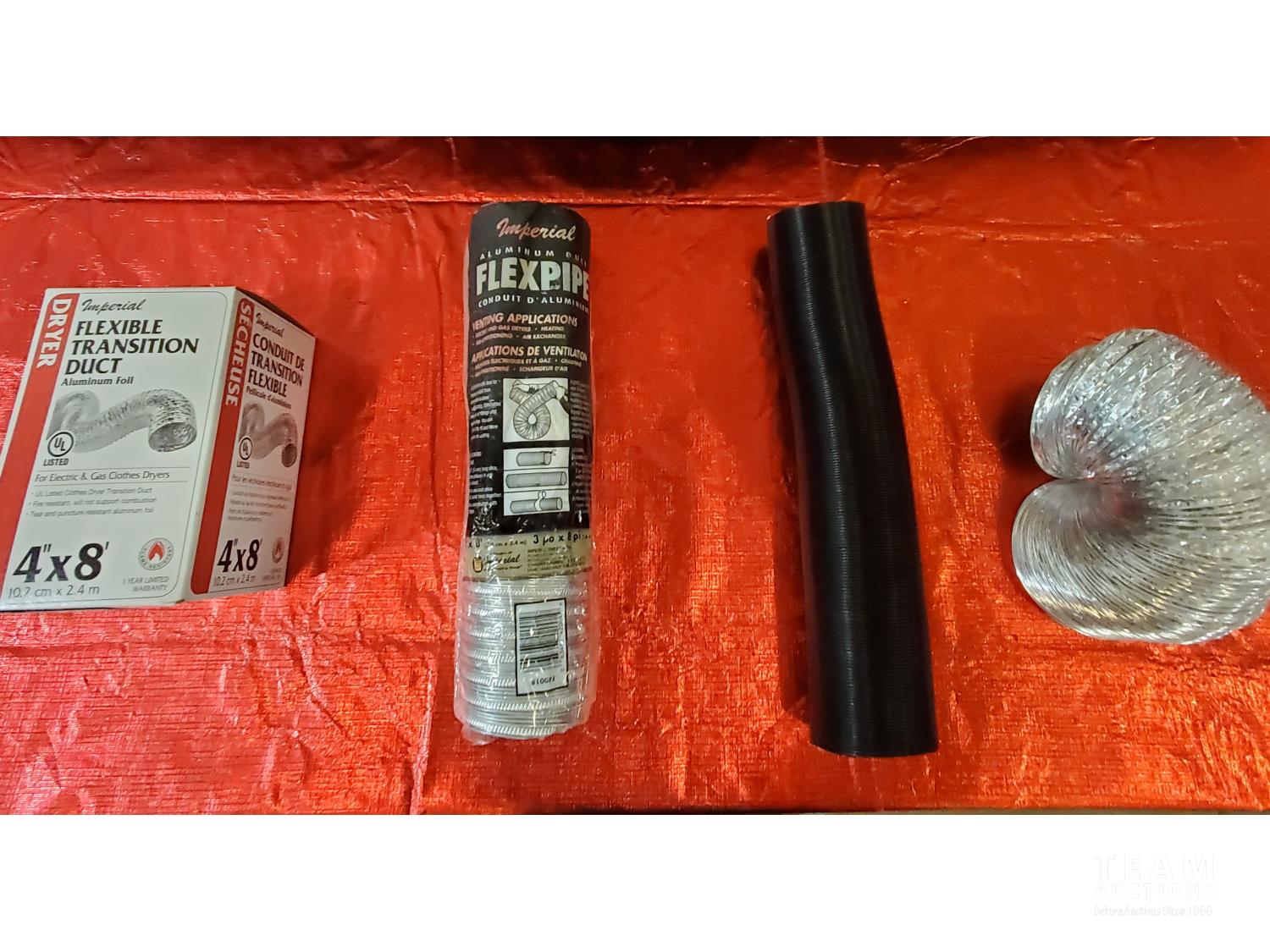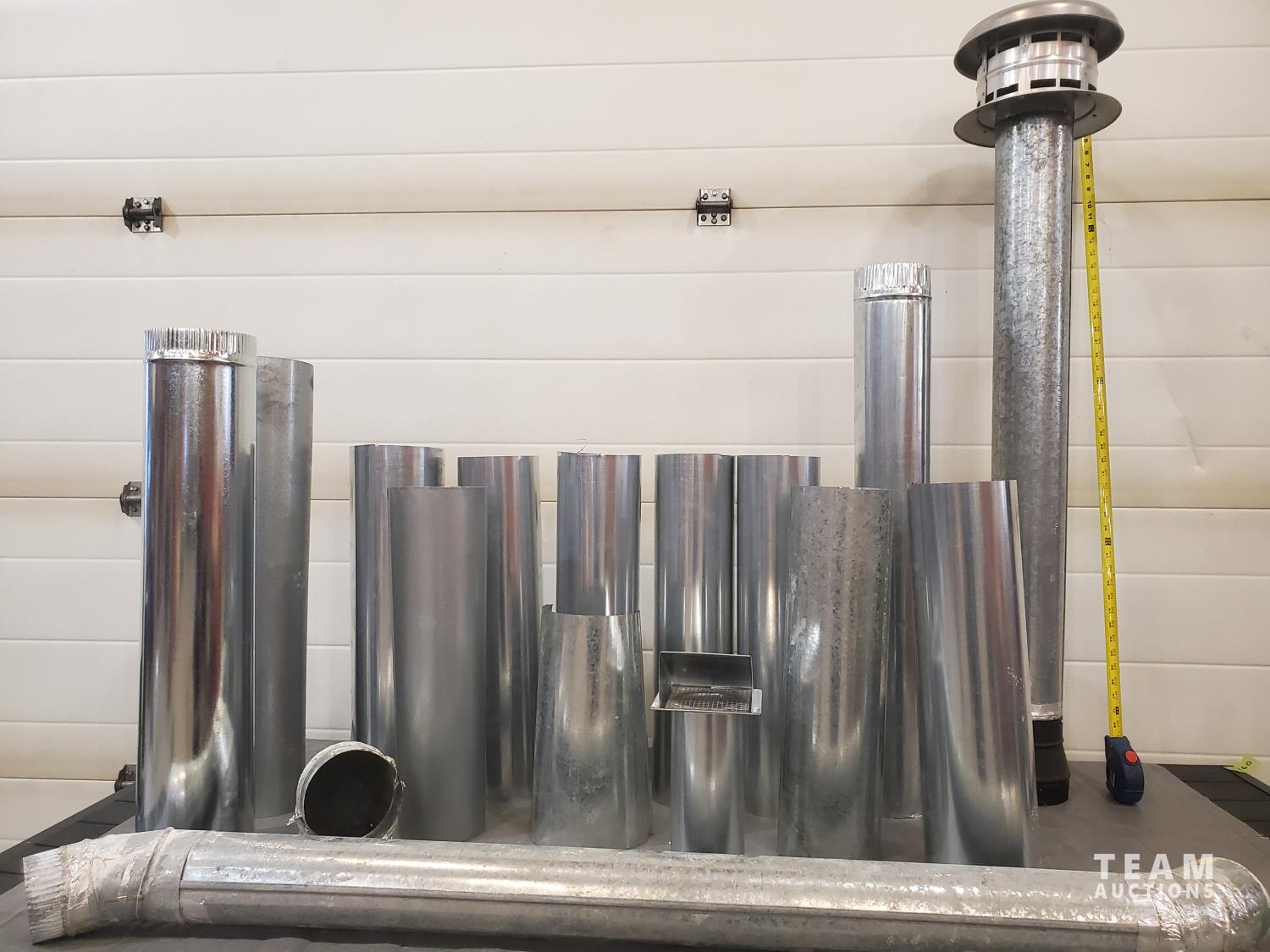 4 inch x 4 ft 30 ga with elbows, 4 inch x 30 inch 30 ga, 4 inch x 20 inch 30 ga, 5 of 5 inch w 24 inch 30 ga, 2 of 5 inch × 22 inch 30 ga, 5 inch × 36 inch 39 ga, 6 inch ×5 inch Reducer & 5 inch x 4 ft 6 inch 30 ga & Chimney Cap Assembly, 4 inch Galvanized Air Intake hood, 2 Thermaflex 10 inch x 25 ft Flexible HVAC Ducts, Type SL-D, Part Number 0541-1000-0001, 1- 25 ft 4 inch Insulated Flexible Ducting, Small piece of 1- 4 ft 4 inch of Insulated Flexible Ducting, 4 inch ×8 ft Flexible Transition Aluminum Duct, 4 inch ×66 inch Flexible Transition Aluminum Duct 3 inch Flexpipe Aluminum Duct, 3 inch Black Aluminum Duct