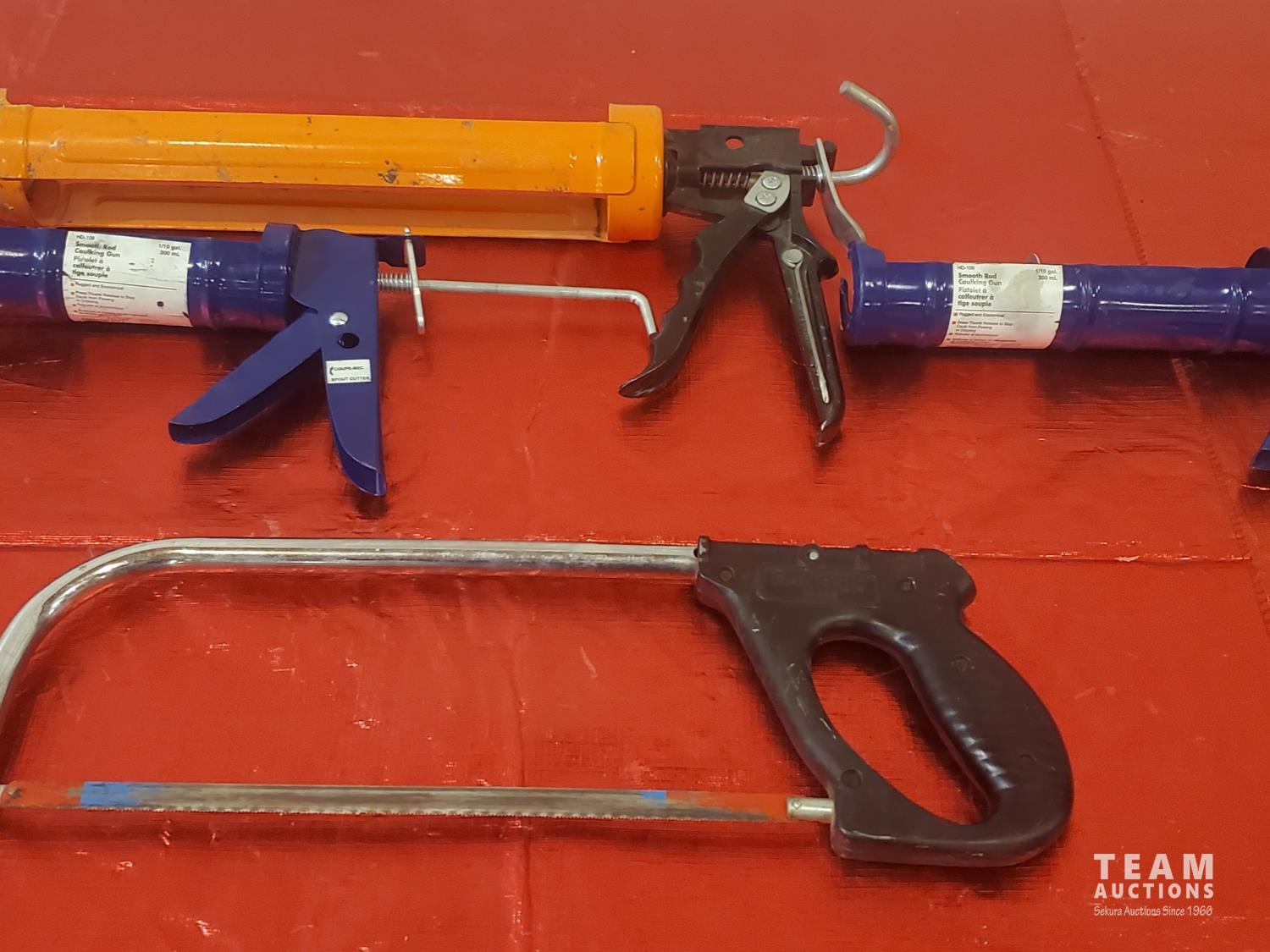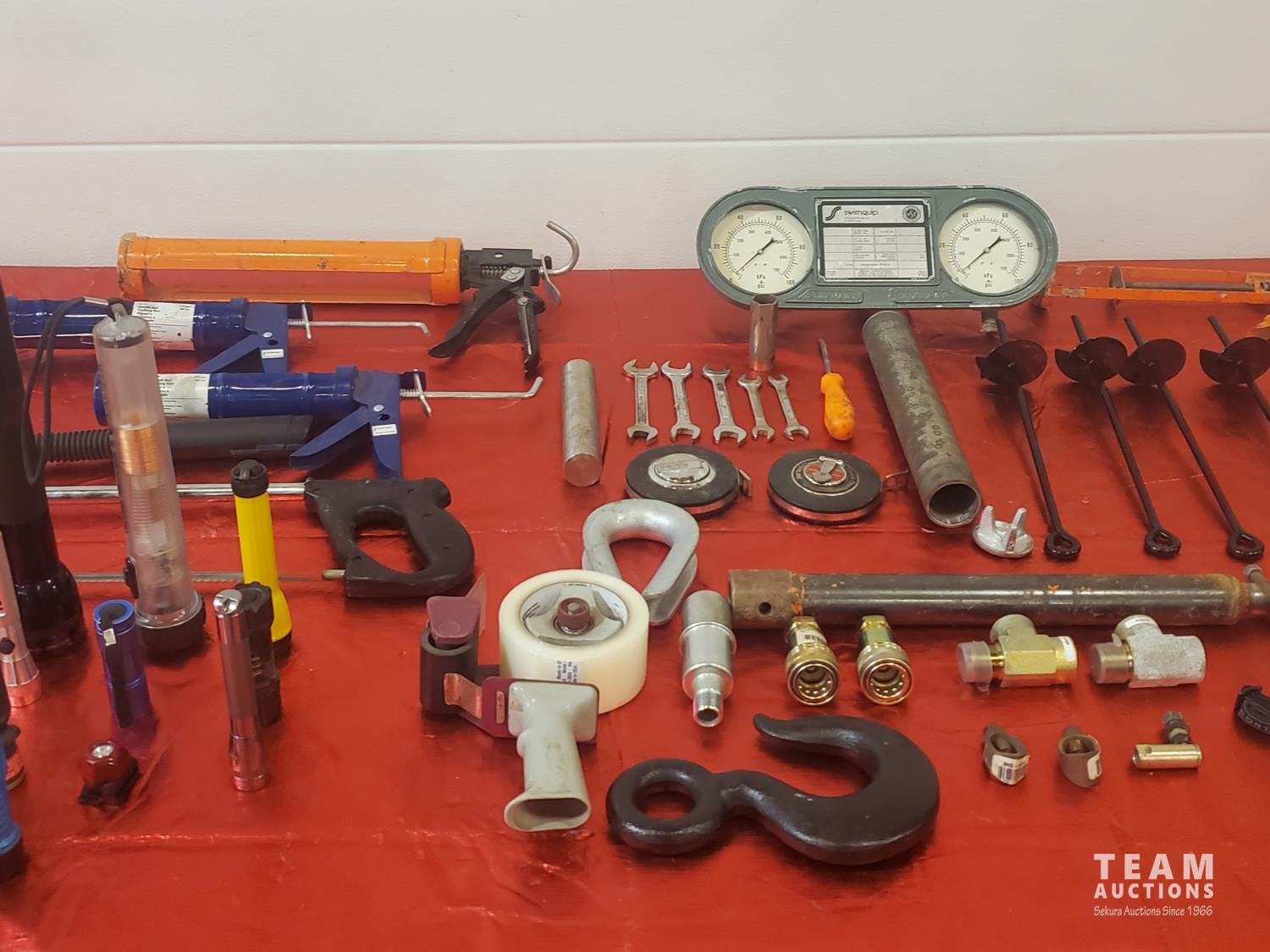 14 (mostly) LED Flashlights, 5 Caulking Guns, Miscellaneous Hardware, Swimquip Gauges, Metric End Wrenches, 2 50 ft Tapes, Four Tent Tiedowns, High Pressure Hydraulic Quick Couplers, 16 inch Power Post Hole Extension, 2 Hand-Held Tape Guns