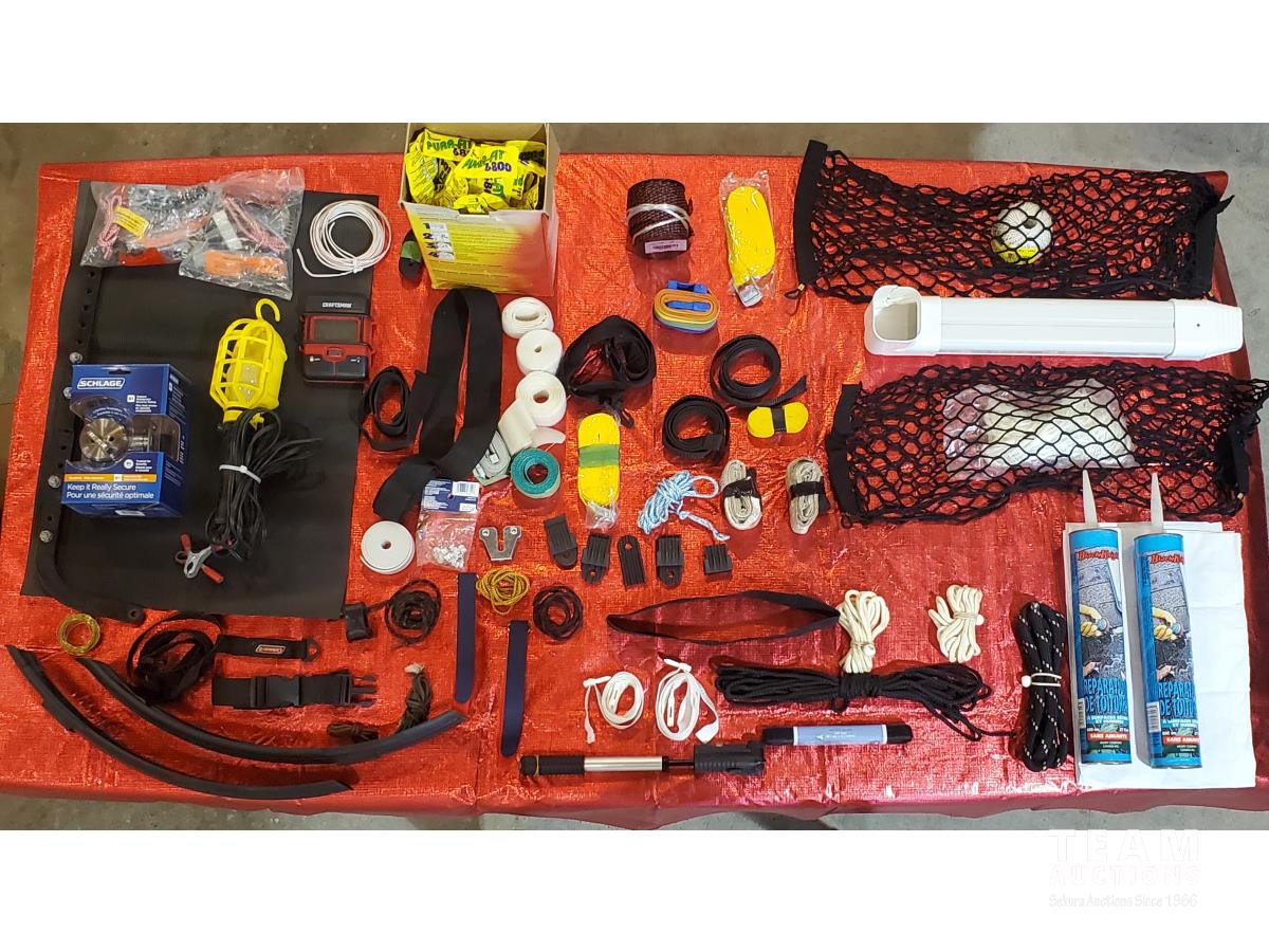 Door Deadbolt, Bicycle Pump, Straps, 2 Tubes of Black Night Wet Dry Roof Repair, 800ml Tubes, Tiedowns, Garage door remote Opener, 200 Pair Box of Ear Plugs, 12 volt Trouble Light, 2 Small & 1 Large Cargo Nets, Velcro Tape