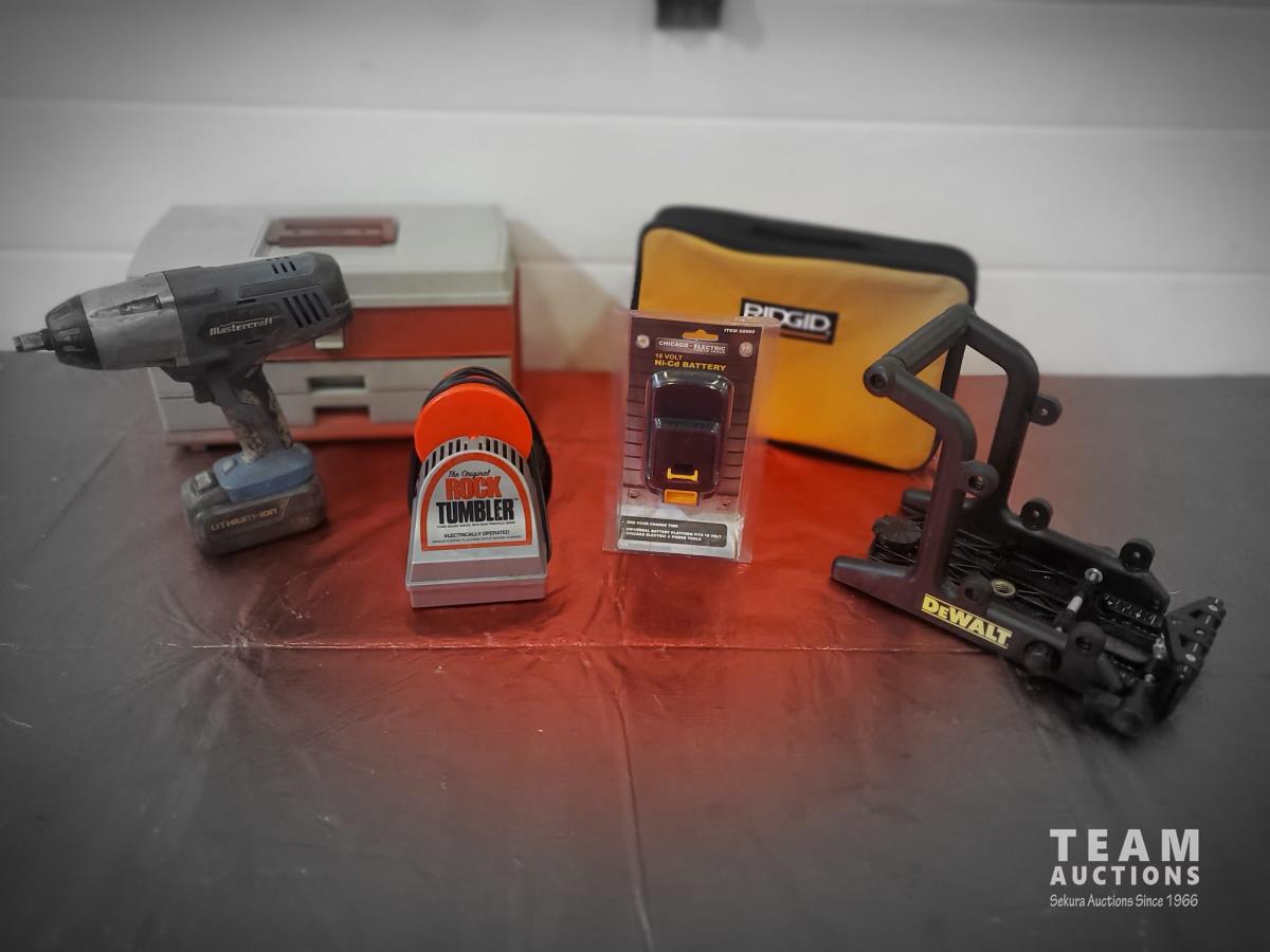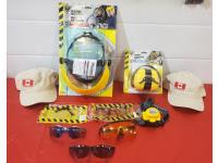 Collapsible Protective Hearing Muff, LED Headlight, High, Low & Flash, 5 Pairs of New Safety Glasses, 2 New Canada Day Hats, Impact, Battery, Case, Stand, Tumbler, Box, Maximum 20V Max Cordless Impact Wrench Lightweight ½”, 18 Volt Ni-Cid Battery, Ridgid Soft Carry Case, Dewalt Laser Level Stand, Tackle Box