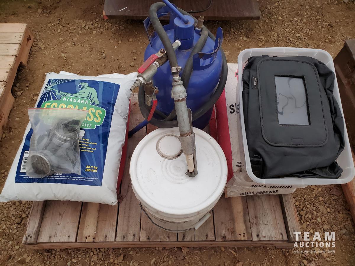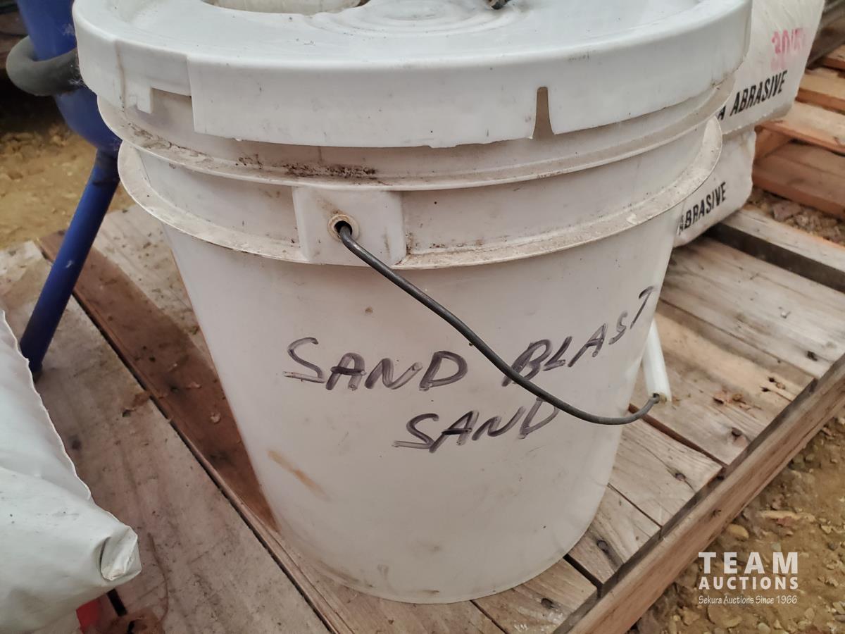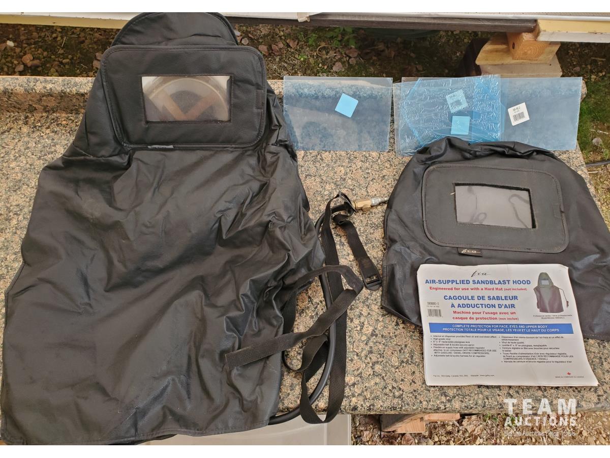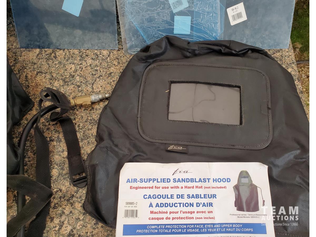 5 Gallon Ceramic Tip Sand Blaster, FIA Air-Supplied Abrasive Blaster Hood with Hard Hat & Shields, FIA Heavy-duty Deluxe Blasting Hood, Particulate/Fume Rubber Mask, (3) 40 kg Bags of Silica Abrasive, (1) 22.7 kg of ECO-GLASS Abrasive, (1) 20 Liter Pail of Silica Abrasive