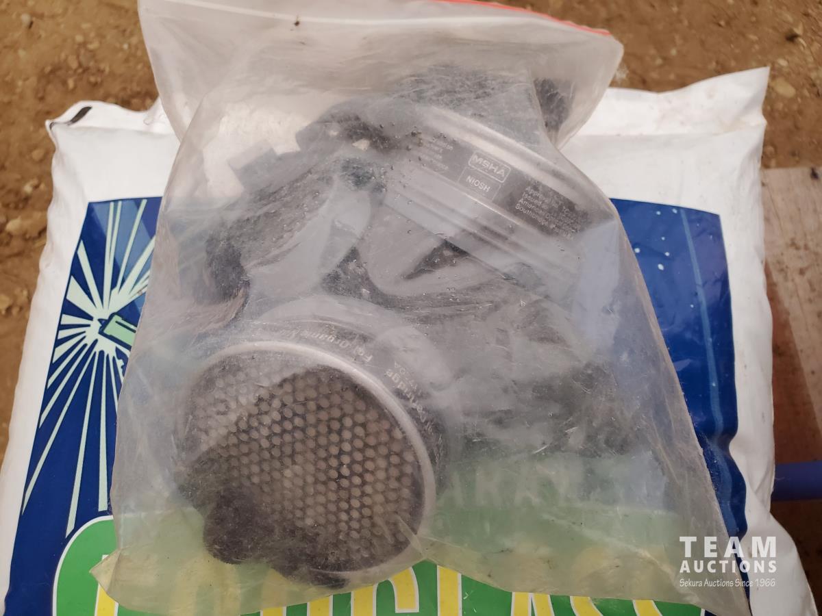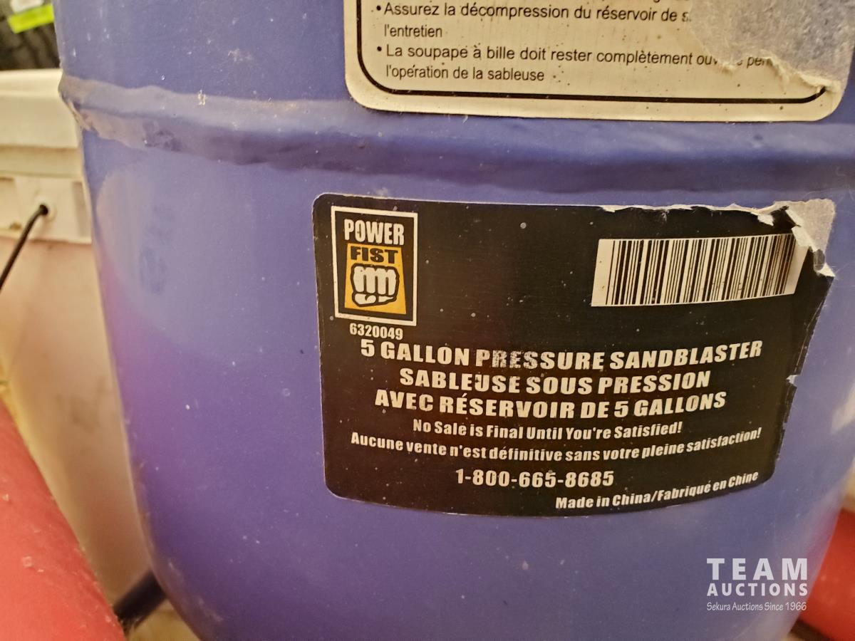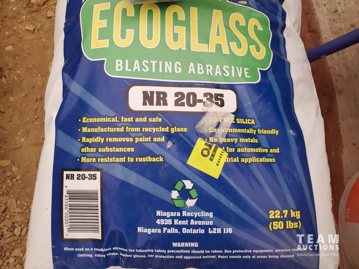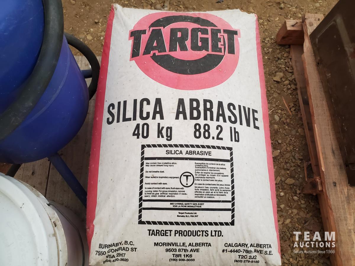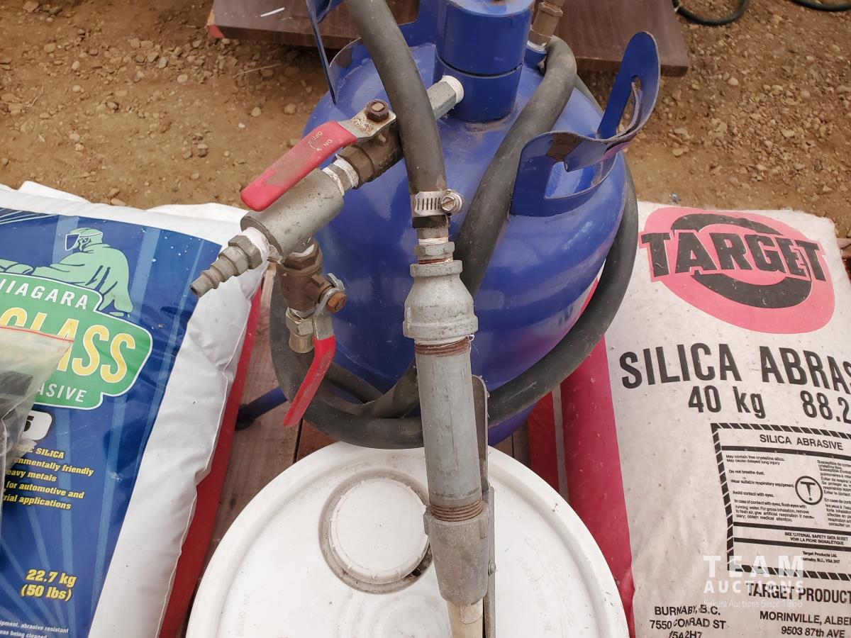 5 Gallon Ceramic Tip Sand Blaster, FIA Air-Supplied Abrasive Blaster Hood with Hard Hat & Shields, FIA Heavy-duty Deluxe Blasting Hood, Particulate/Fume Rubber Mask, (3) 40 kg Bags of Silica Abrasive, (1) 22.7 kg of ECO-GLASS Abrasive, (1) 20 Liter Pail of Silica Abrasive
