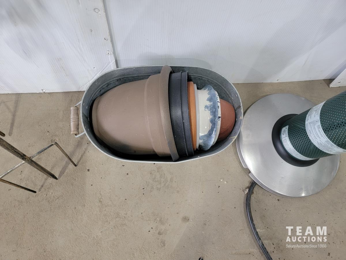 1884 Small Patio Propane Heater, Qty of Flower Pots, Garden Statues and (2) Hangers