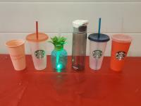6 Starbucks Hot Beverage Cups/ Warmers, 5 Hot/Cold Vacuum Cups, 6 Summer Drink Cups/ one Flashing.